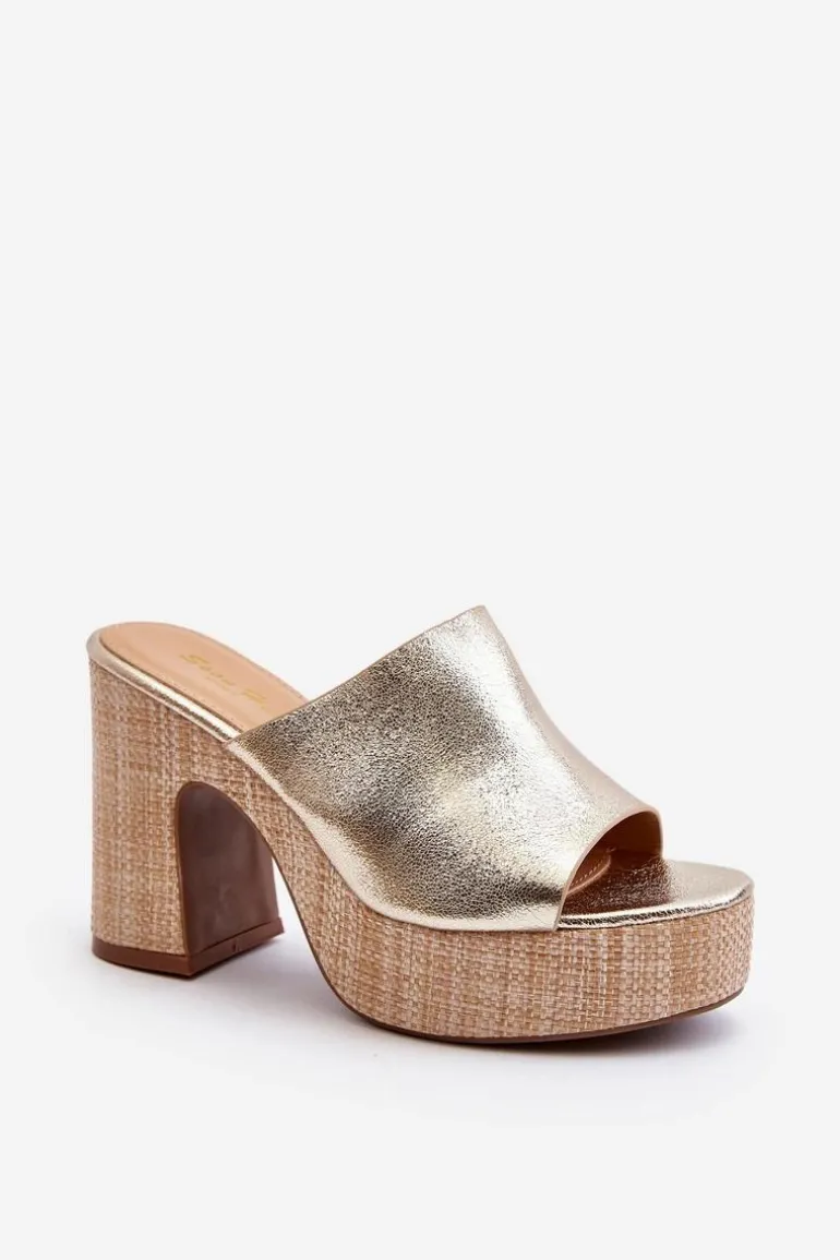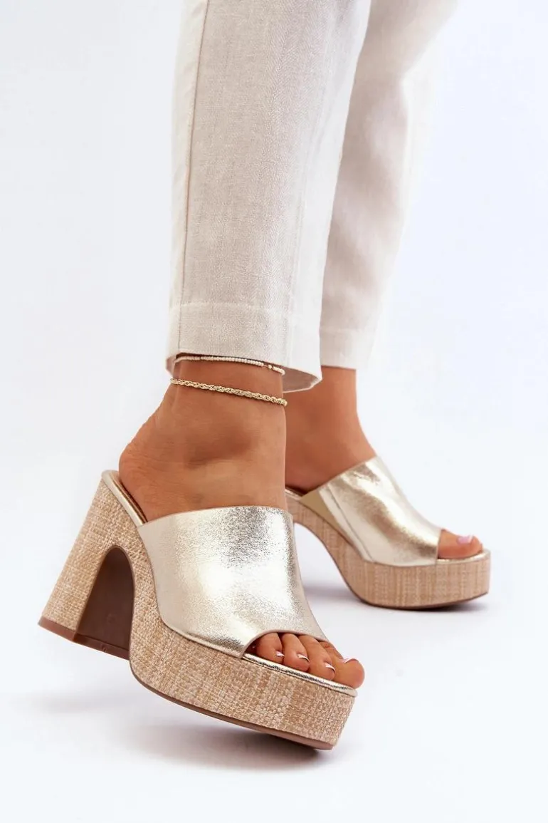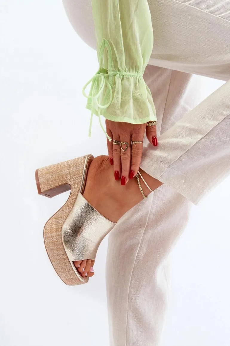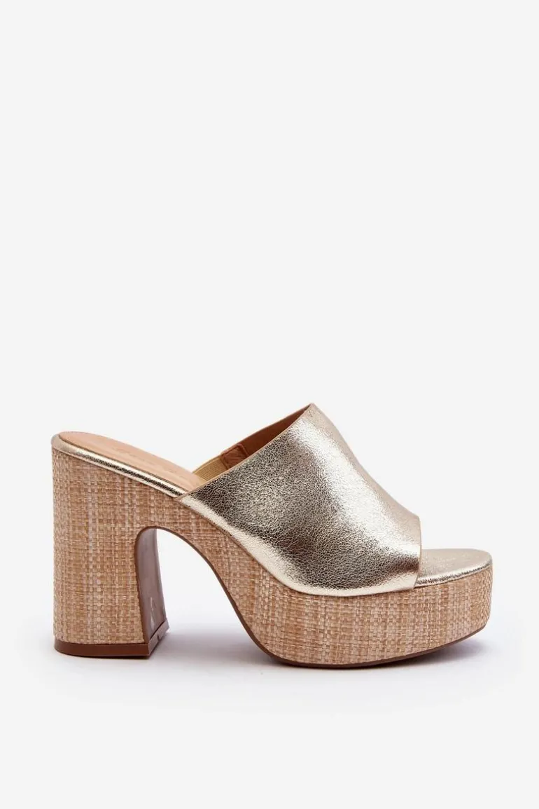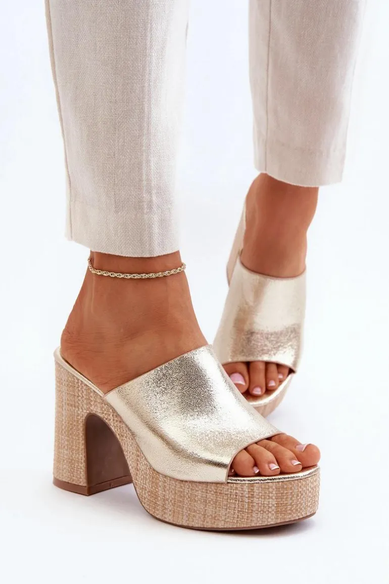 Klapki Damskie Na Obcasie Słupku Złote Siobhan