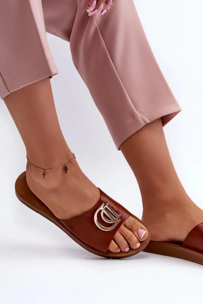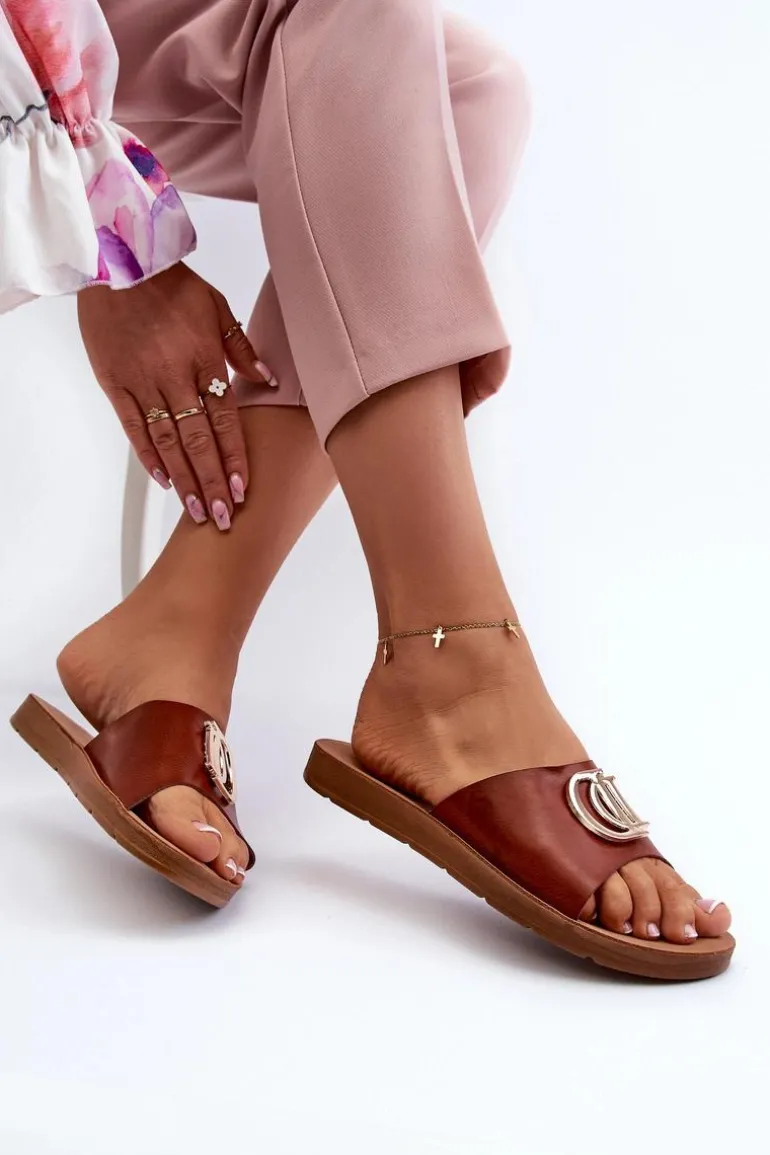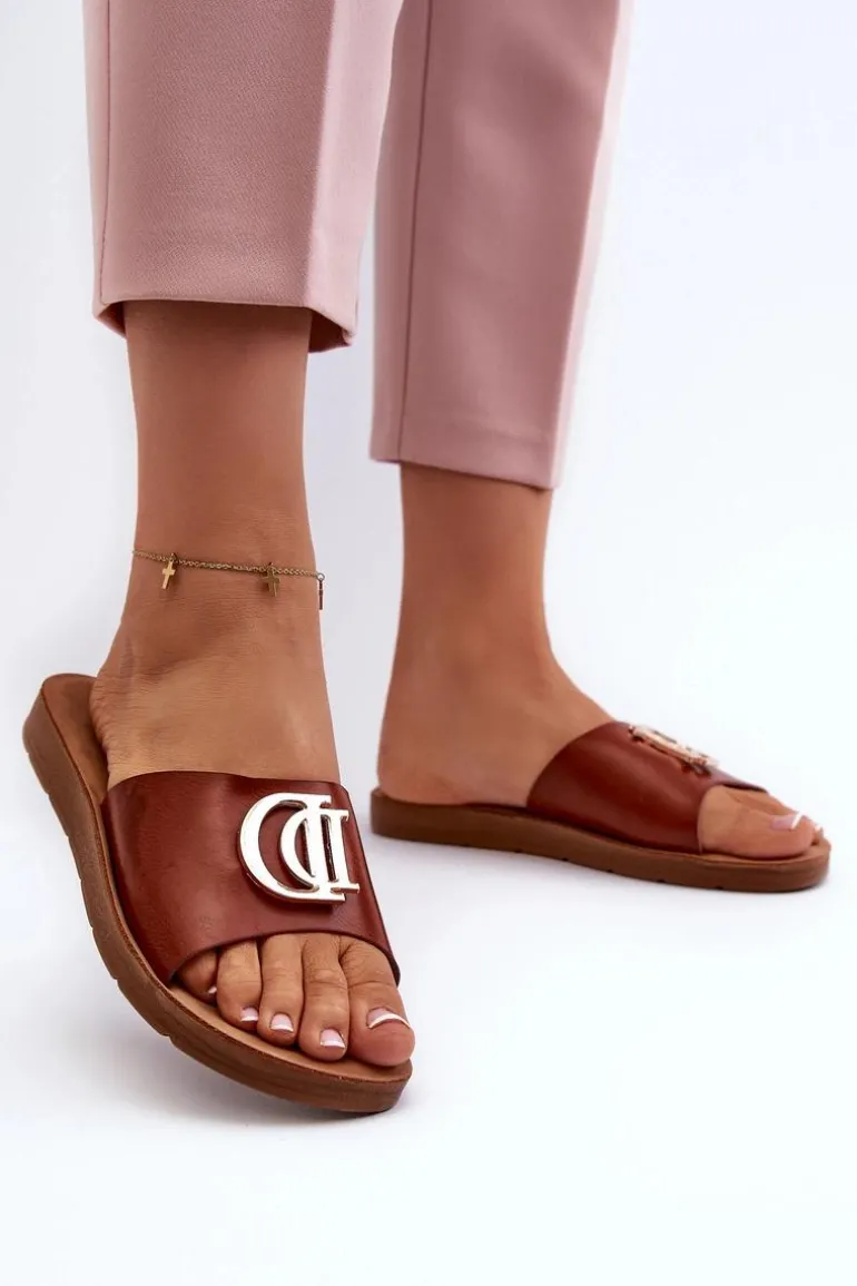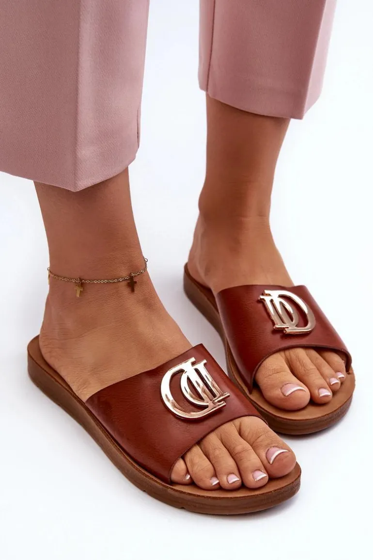 Klapki damskie z ekoskóry prezentują się niezwykle stylowo i elegancko. Płaska podeszwa zapewnia wygodę i komfort podczas długich spacerów czy letnich wyjść. Dodatkowo złota ozdoba nadaje im subtelnego uroku, co sprawia, że doskonale wpasują się w różnorodne letnie stylizacje. Przy wyborze rozmiaru prosimy sugerować się tabelą rozmiarów.