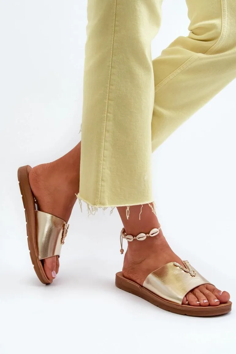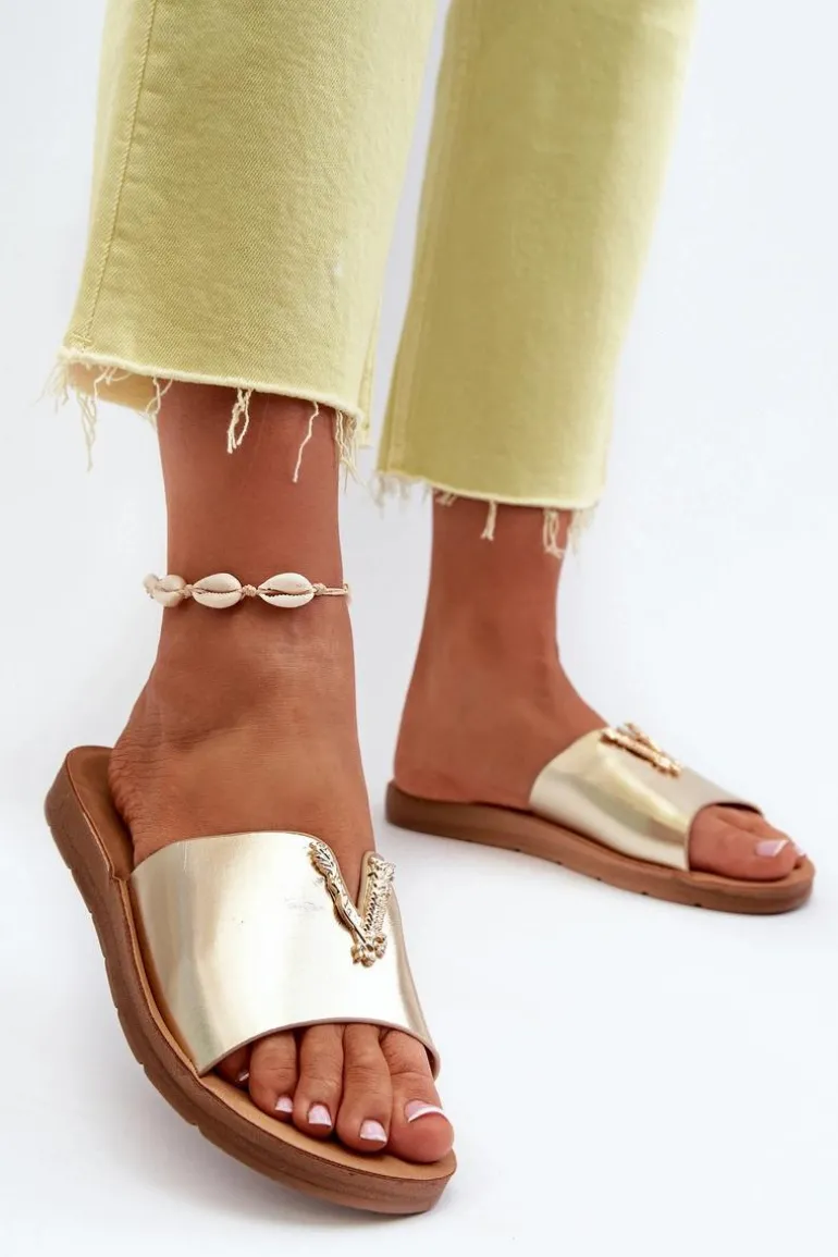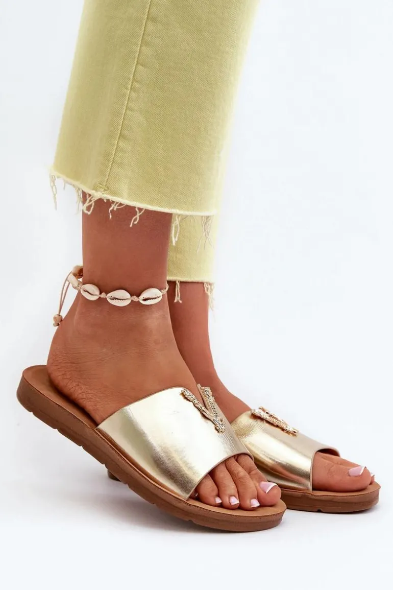 Klapki Damskie Na Płaskiej Podeszwie Z Ozdobą Eko Skórzane Złote Makia