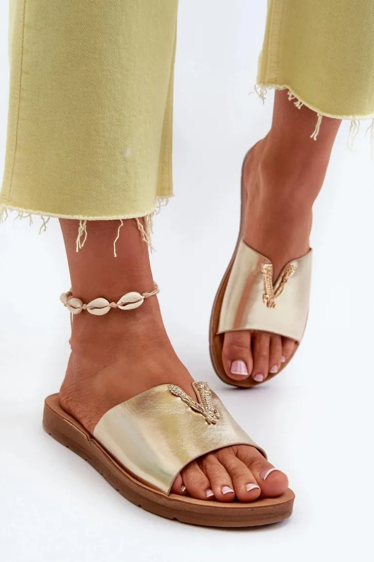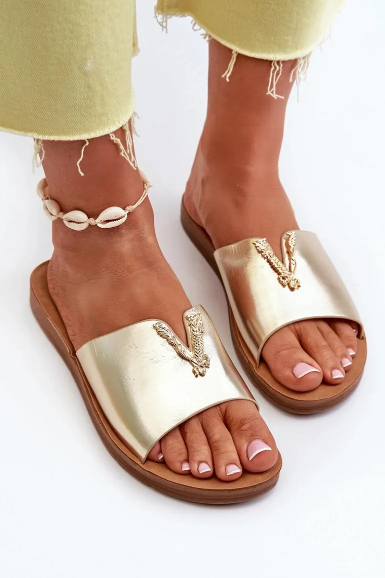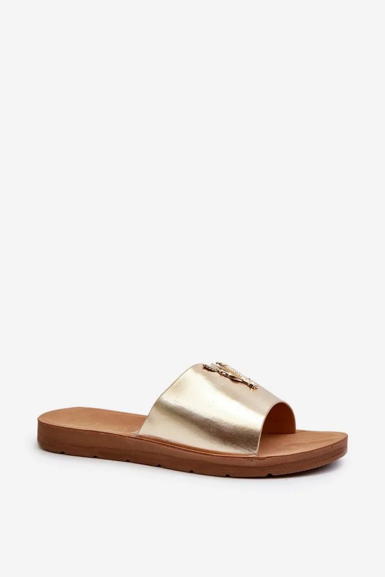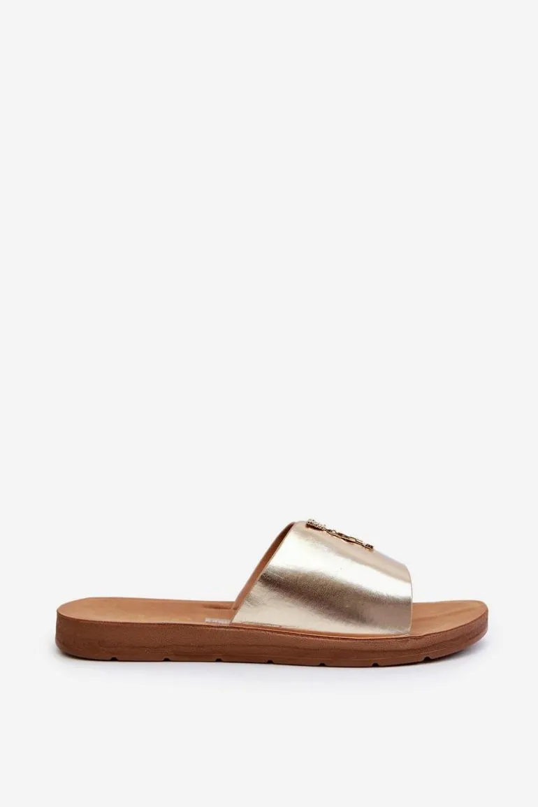 Klapki Damskie Na Płaskiej Podeszwie Z Ozdobą Eko Skórzane Złote Makia