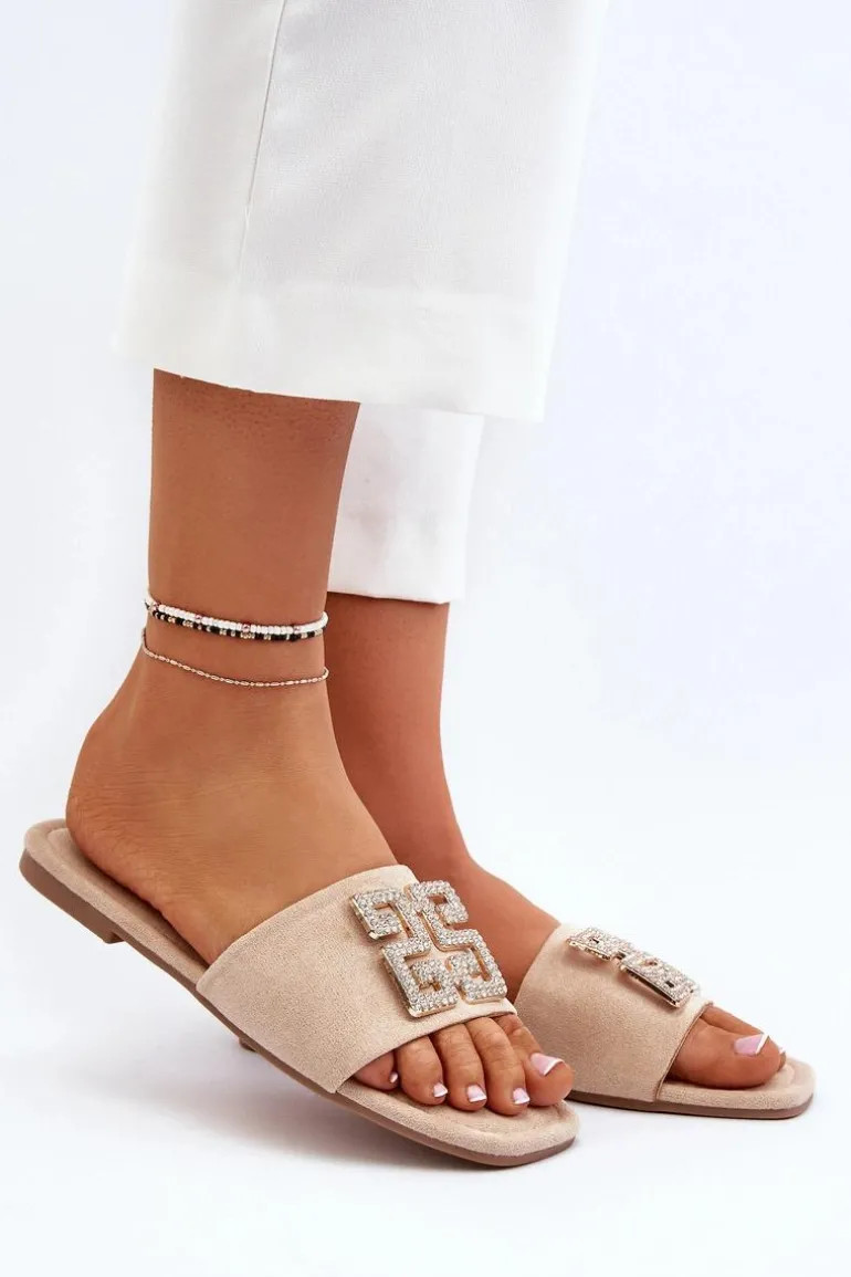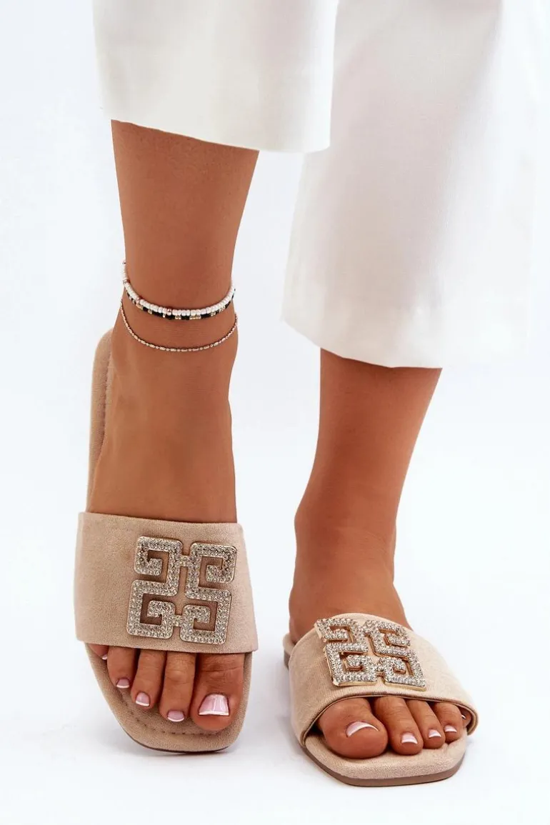 Klapki damskie osadzone na płaskim obcasie zapewniają wygodę noszenia przez cały dzień. Ozdoba z błyszczącymi cyrkoniami umieszczona z przodu dodaje im subtelnego blasku. Ten fason z pewnością podkreśli wyjątkowy charakter Twojej letniej stylizacji. Przy wyborze rozmiaru prosimy sugerować się tabelą rozmiarów.