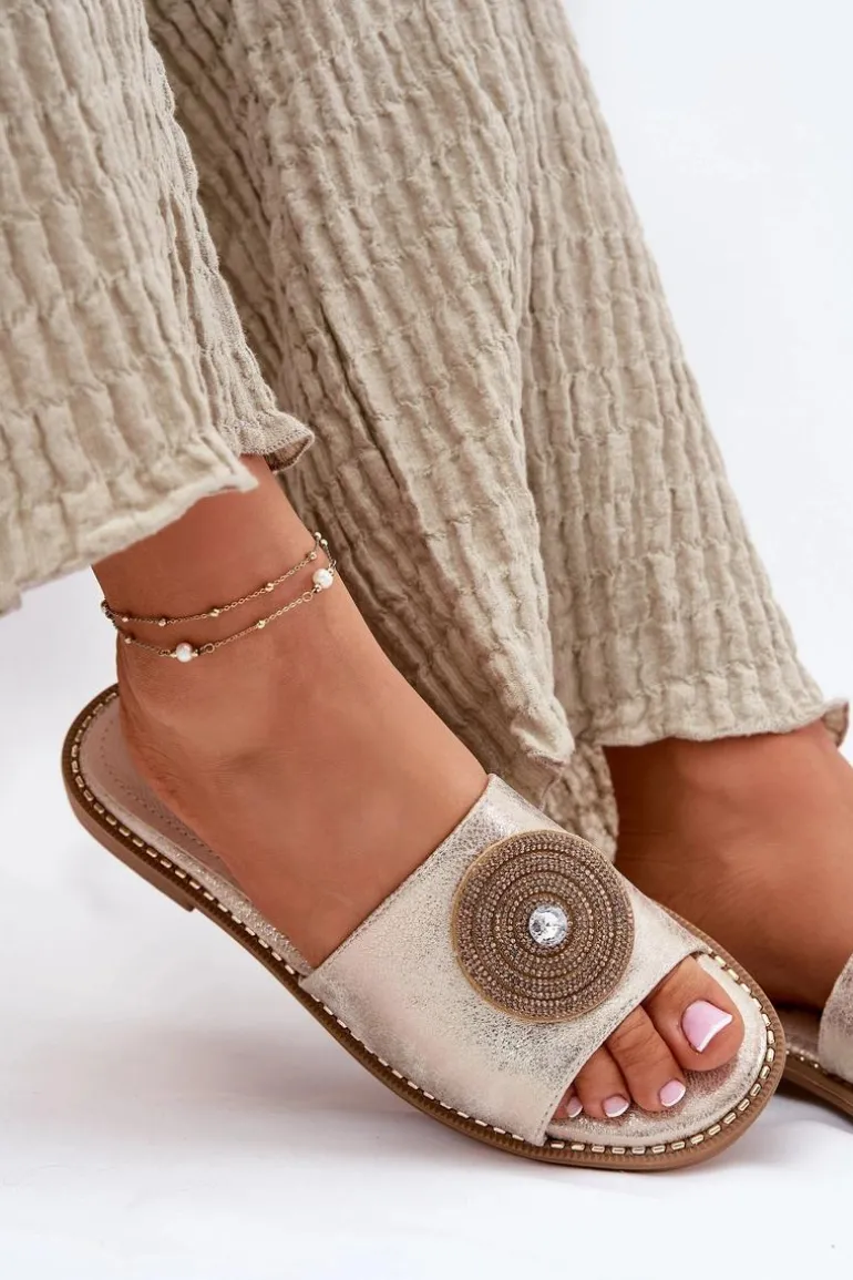 Eleganckie klapki damskie wykonane z wysokiej jakości eko skóry. Osadzone na płaskim obcasie, zapewniają stabilność i wygodę przez cały dzień. Skórzana wkładka gwarantuje komfort i odpowiednią wentylację, dbając o wygodę stóp nawet w ciepłe dni. Z przodu znajduje się ozdoba, która dodaje wyjątkowego uroku i elegancji, czyniąc je doskonałym wyborem do letnich stylizacji. Te klapki to świetna opcja zarówno do casualowych, jak i bardziej eleganckich zestawów. Przy wyborze rozmiaru prosimy sugerować się tabelą rozmiarów.