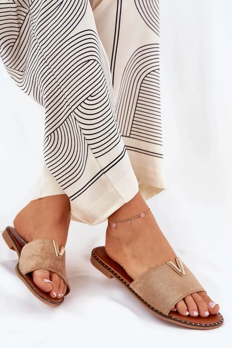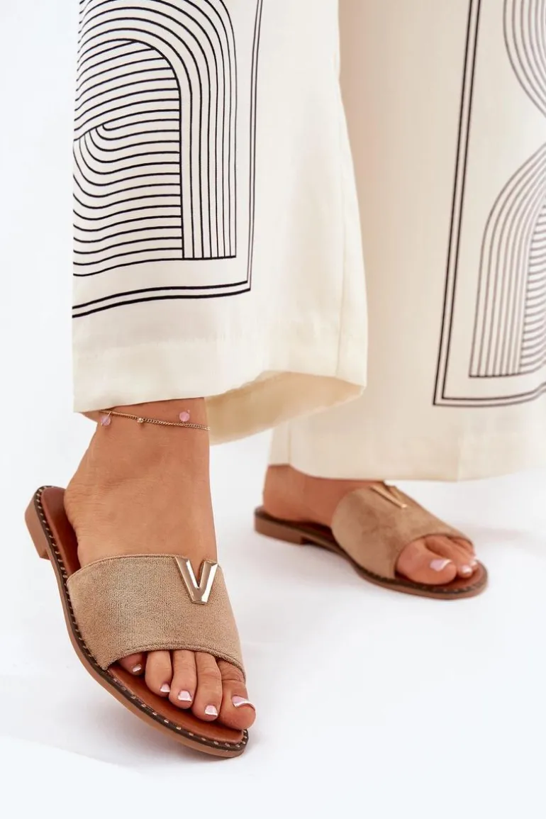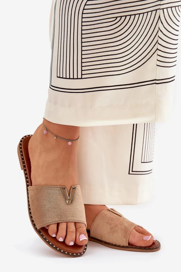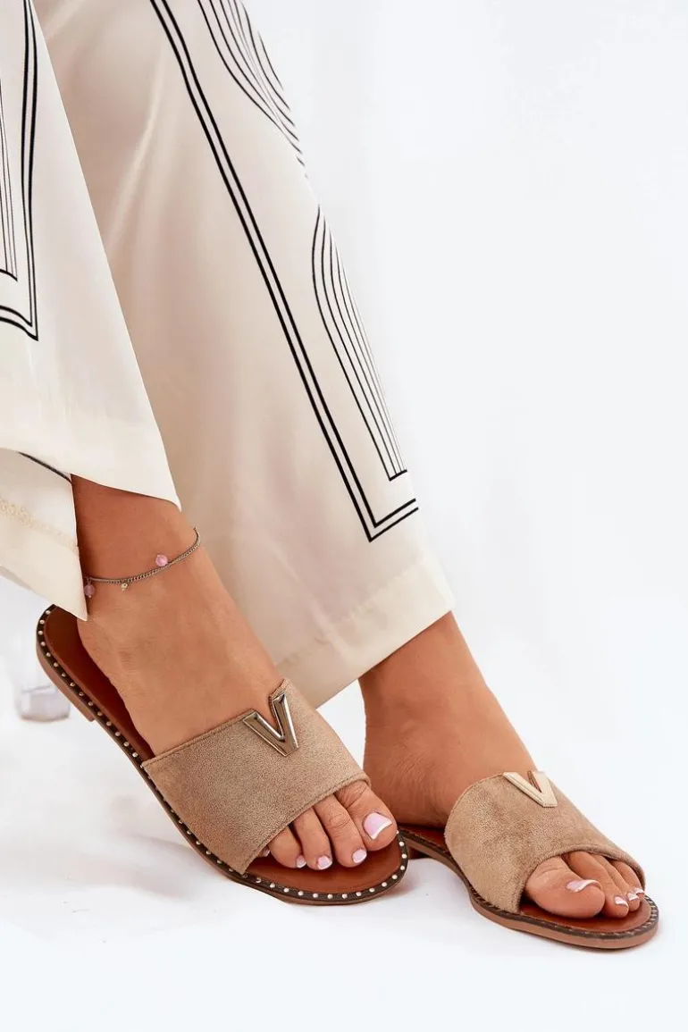 Klapki Damskie Na Płaskim Obcasie Z Ozdobnymi Detalami Khaki Saliena
