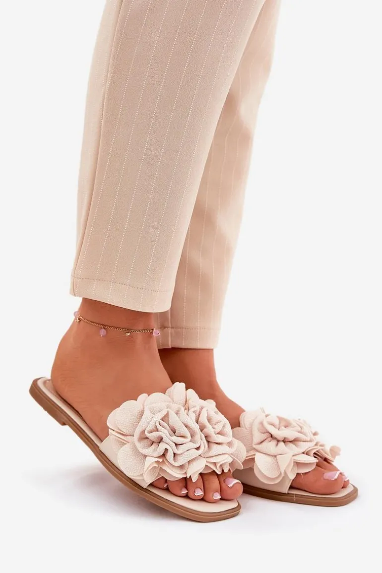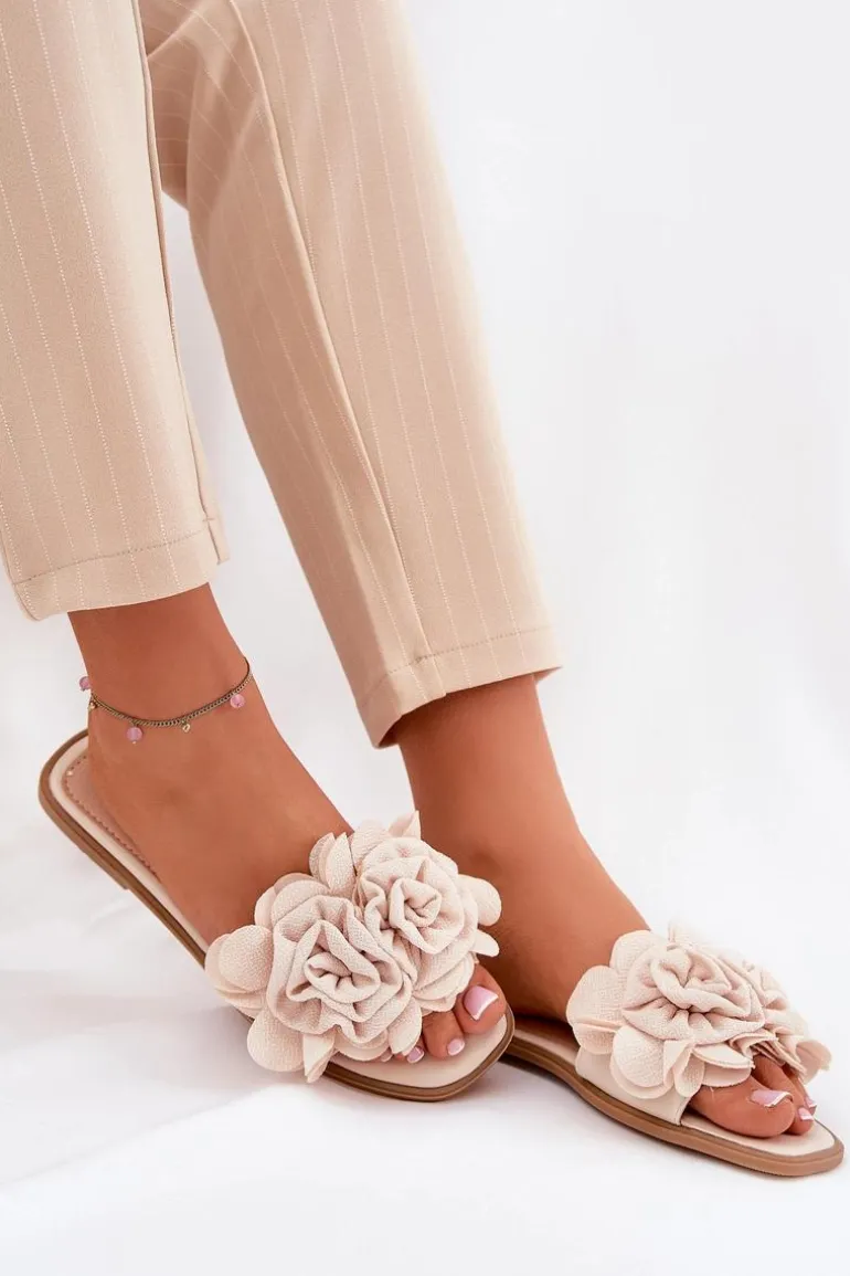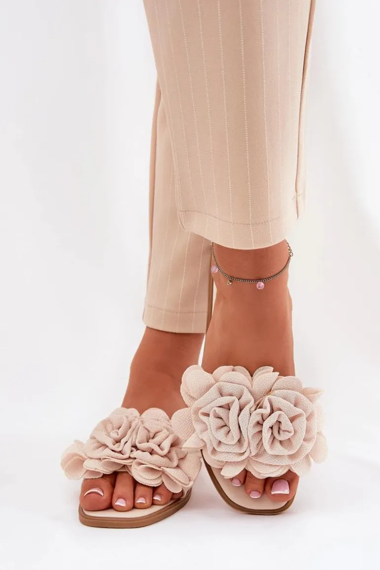 Klapki Damskie Na Płaskim Obcasie Z Ozdobnymi Kwiatami Beżowe Misorsse