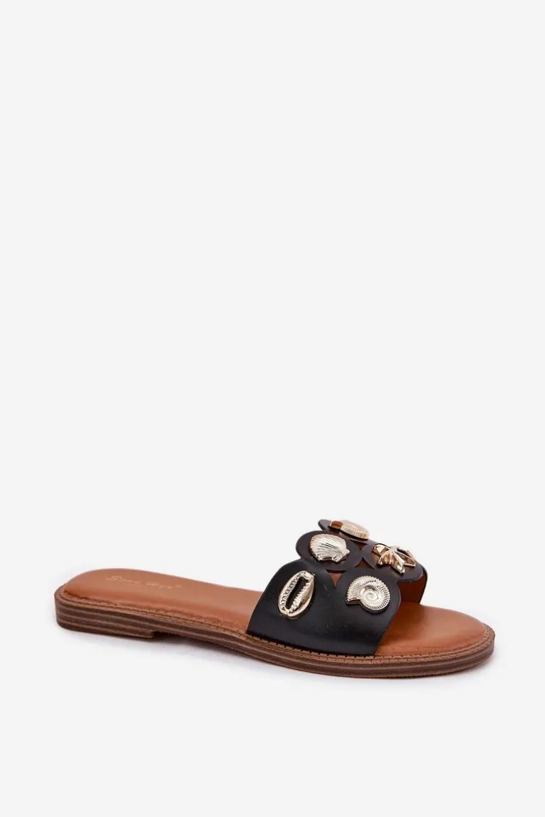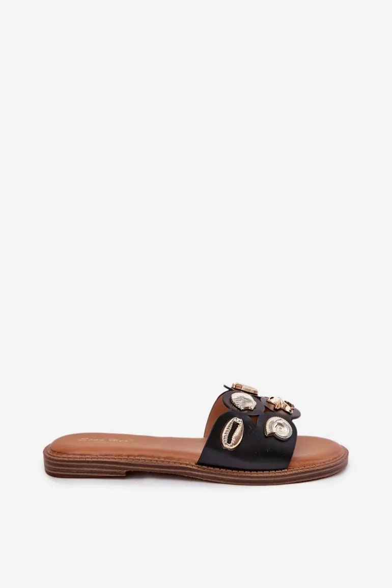 Klapki Damskie Na Płaskim Obcasie Ze Złotymi Przypinkami Czarne Nalothiel