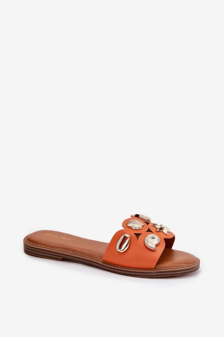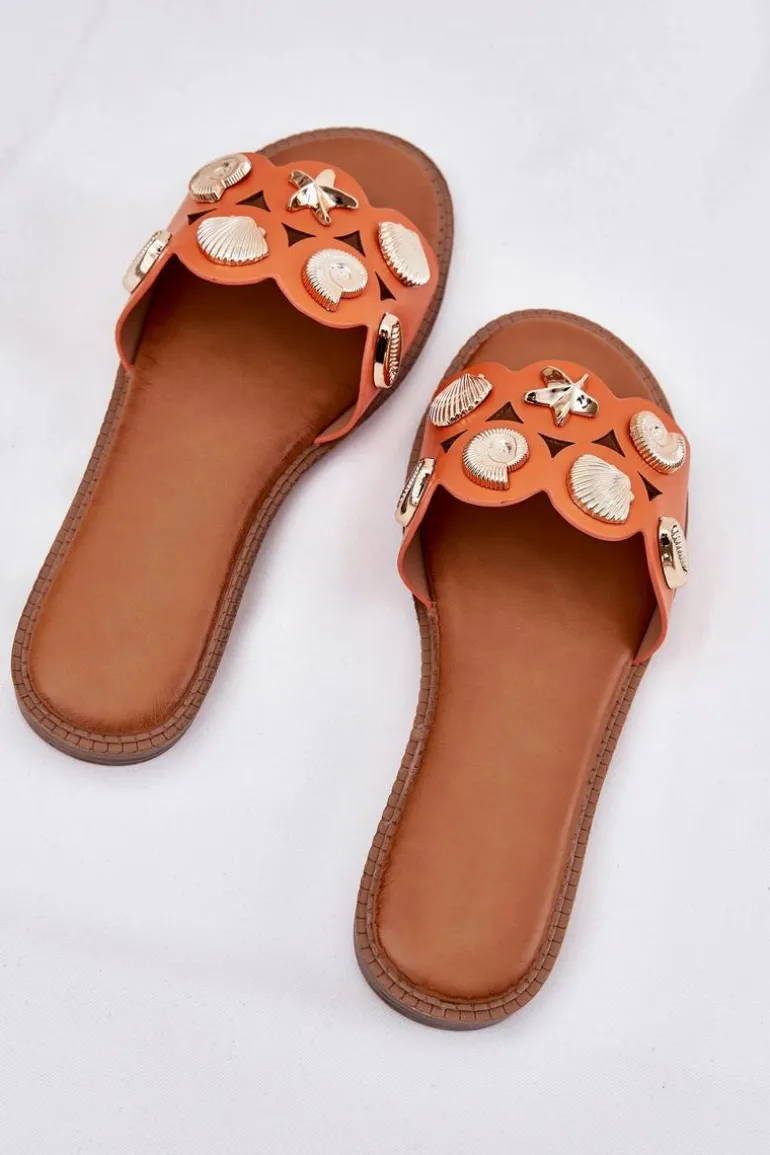 Klapki damskie wykonane z eko skóry. Osadzone na płaskim obcasie. Model wyróżnia się złotymi, morskimi przypinkami, które dodają im wyjątkowego charakteru. Miękka wkładka zapewnia wygodę przez cały dzień, a prosty, ale stylowy design sprawia, że klapki te doskonale komponują się z letnimi stylizacjami. Idealne do codziennego użytku, łączą funkcjonalność z modnym wyglądem. Przy wyborze rozmiaru prosimy sugerować się tabelą rozmiarów.