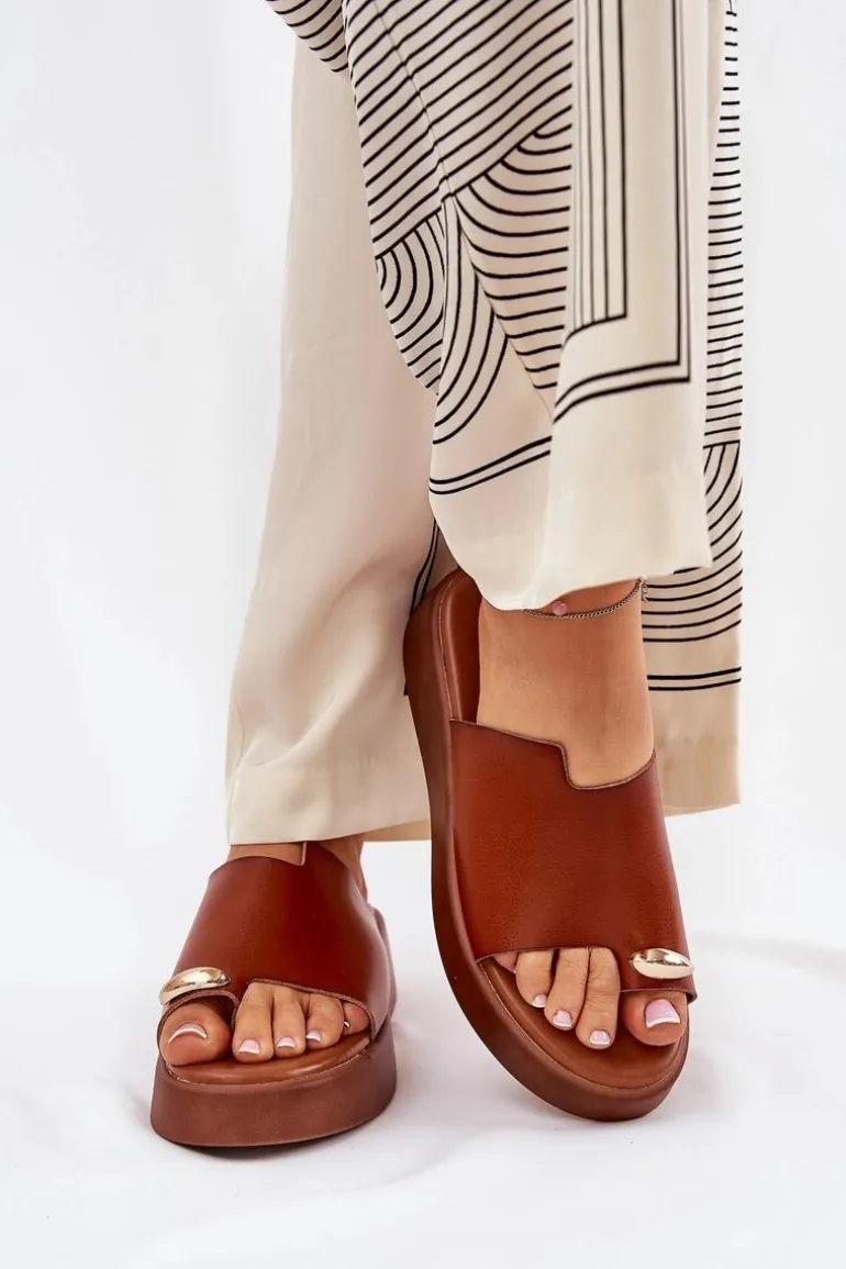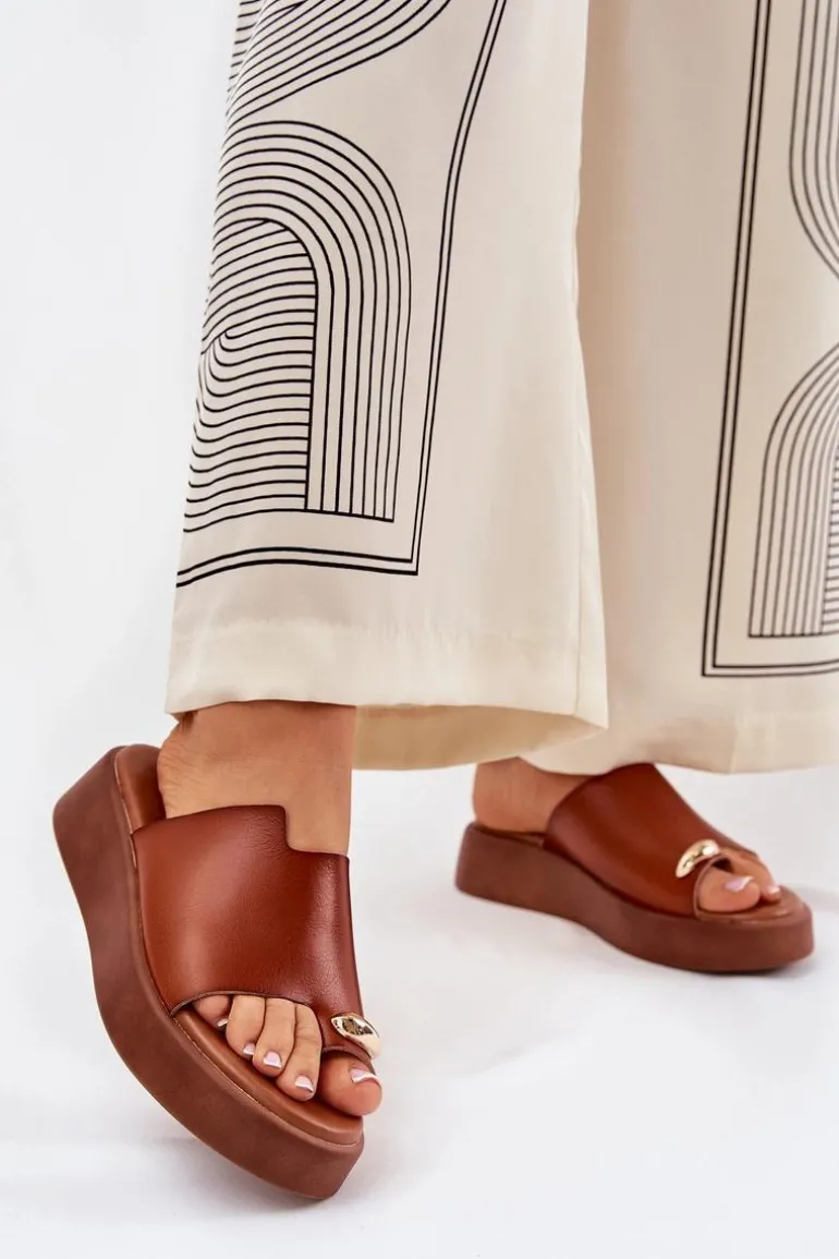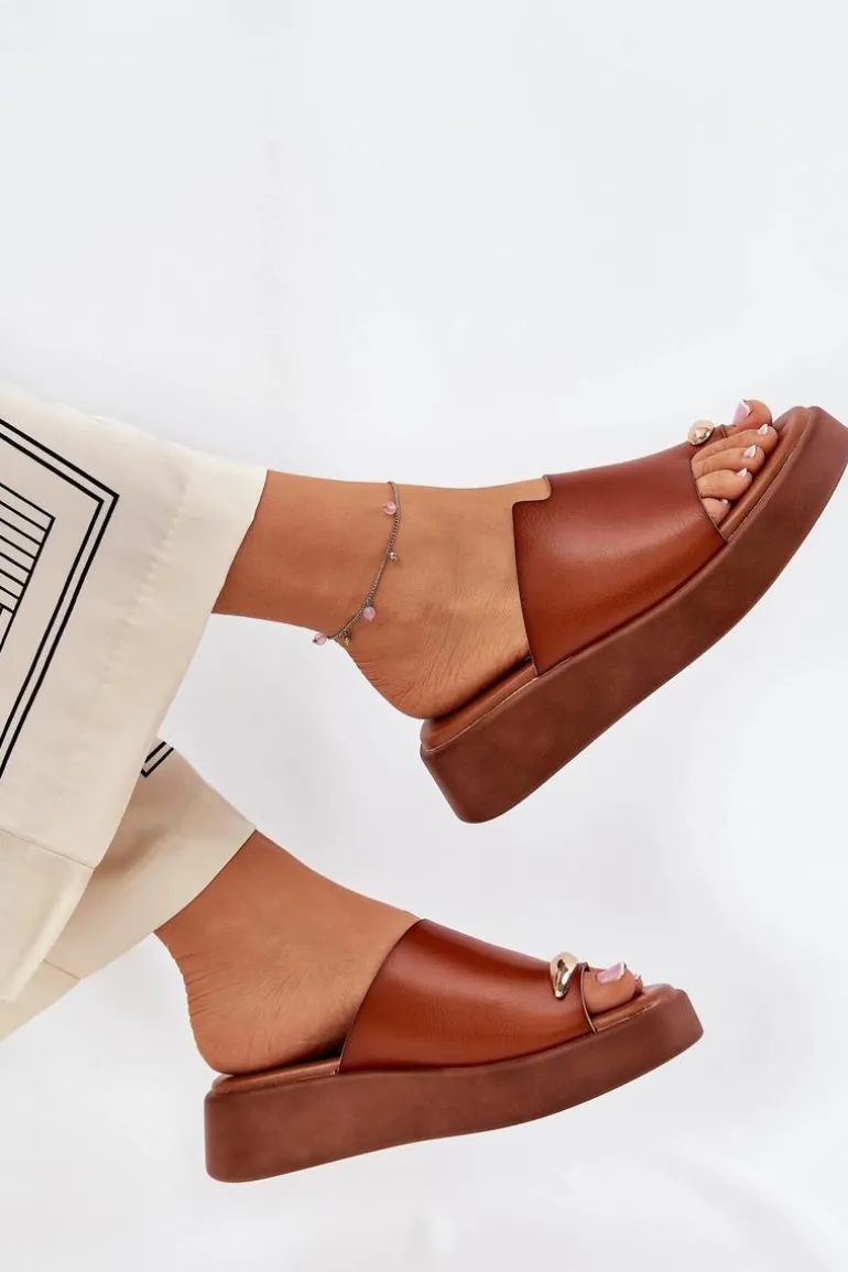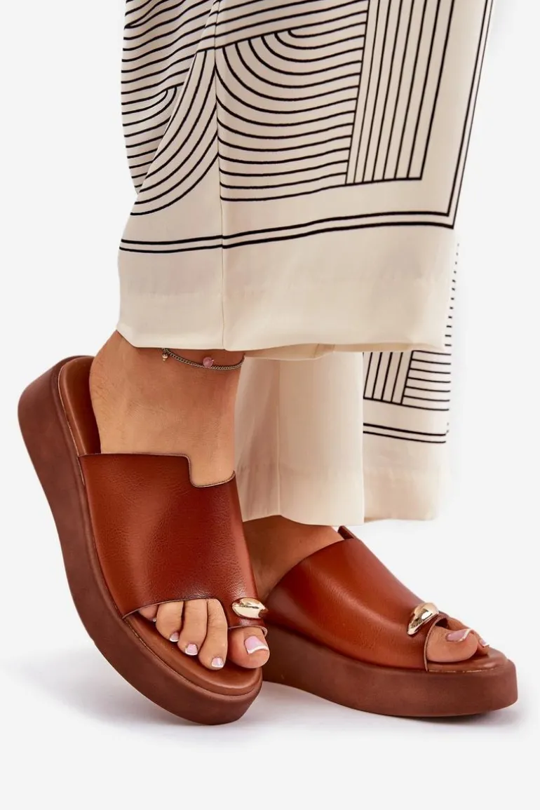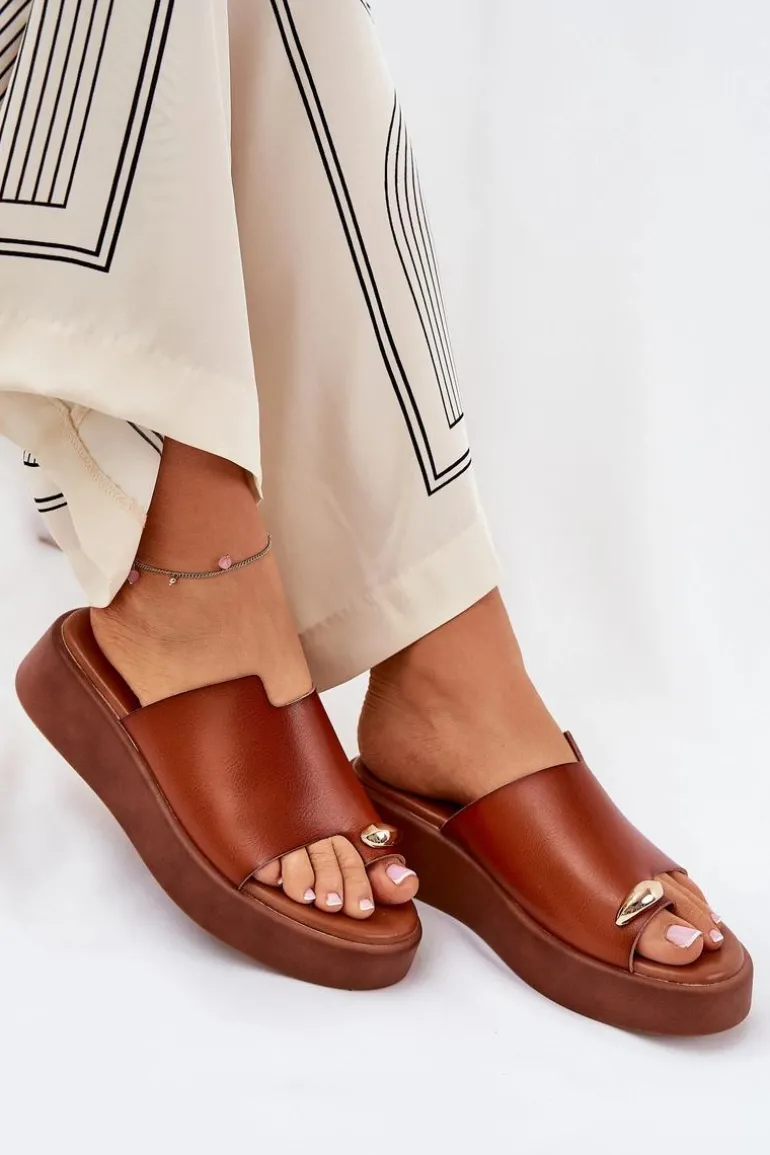 Klapki Damskie Na Platformie I Niskim Koturnie Z Ozdobnym Detalem Camel Saqesse