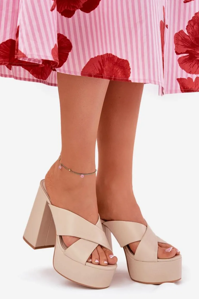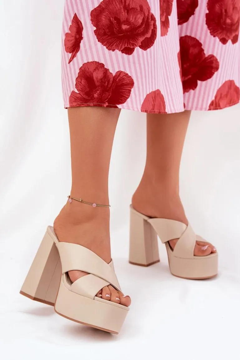 Klapki damskie wykonane z eko skóry. Z przodu dwa przeplatające się paseczki. Osadzone na wysokim słupku i platformie, zapewniają komfort i stabilność, jednocześnie dodając lekkości sylwetce. Idealne na letnie dni, te klapki doskonale komponują się z sukienkami, spódnicami oraz spodniami. Przy wyborze rozmiaru prosimy kierować się tabelą rozmiarów.