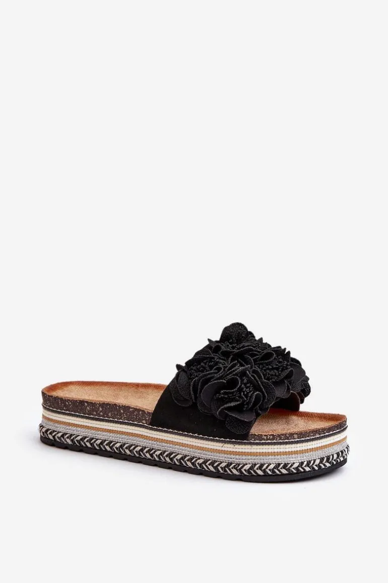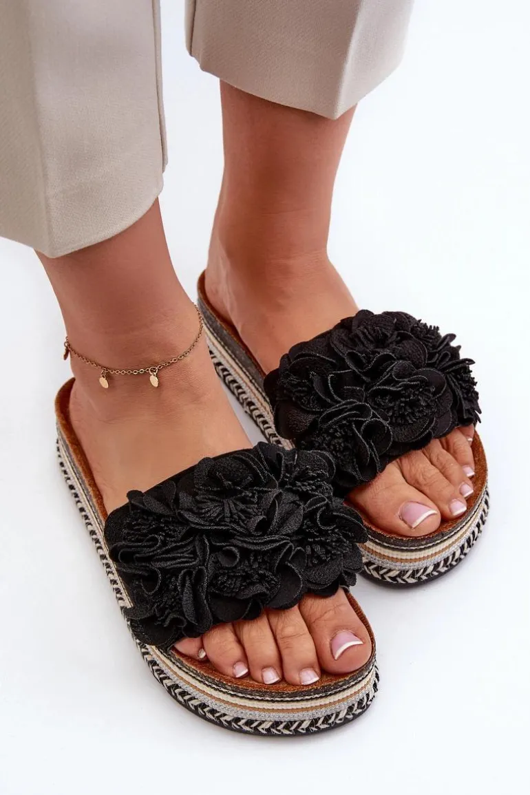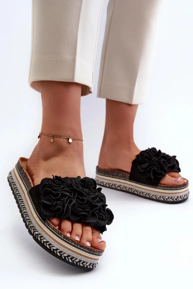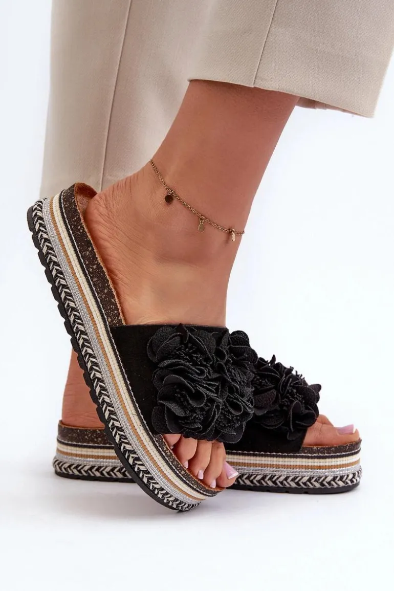 Klapki Damskie Na Platformie Ozdobione Kwiatkami Czarne Nodina