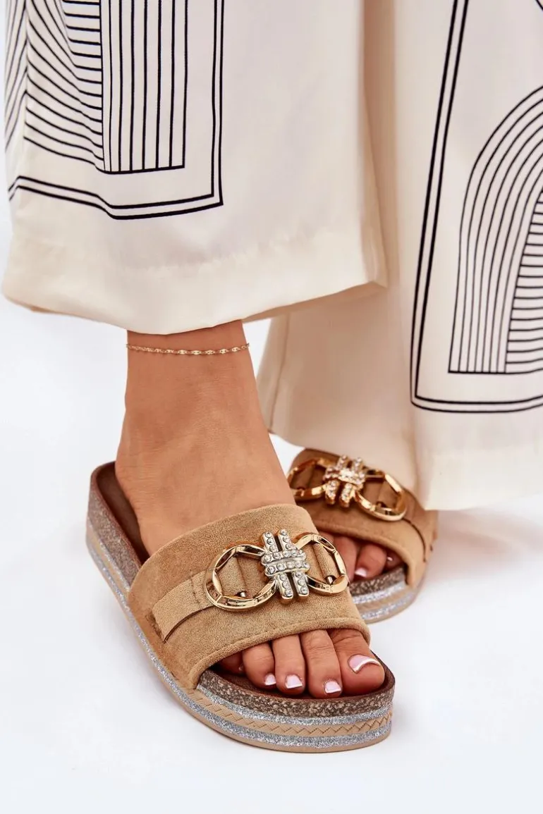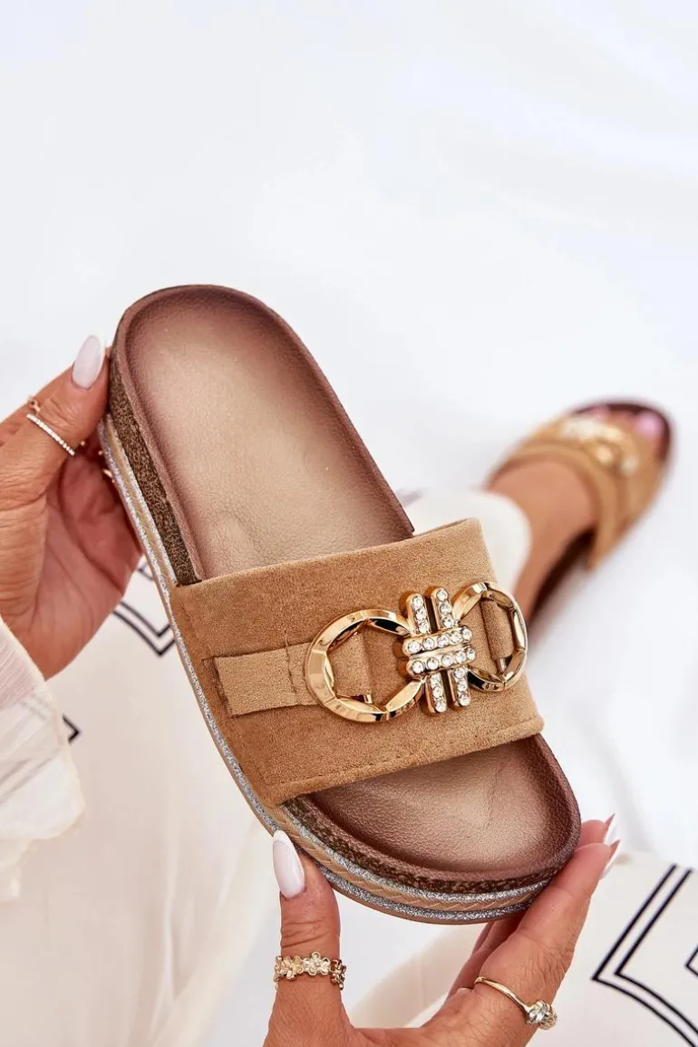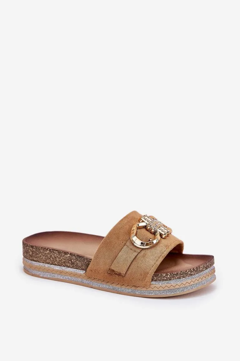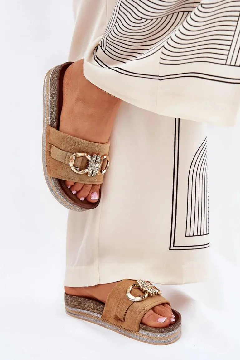 Klapki Damskie Na Platformie Z Brokatem I Złotą Ozdobą Camel Rilirea