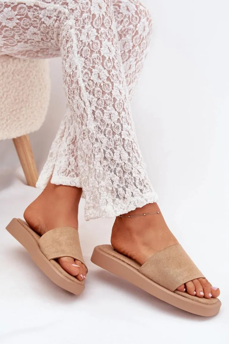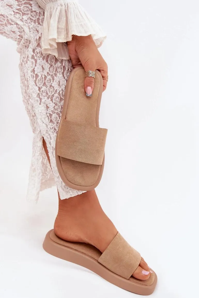 Klasyczne klapki damskie z eko zamszu, osadzone na platformie, łączą wygodę z prostym stylem. Idealne do casualowych stylizacji, doskonale komponują się z sukienkami, spódnicami czy spodniami, zapewniając komfort i elegancki wygląd na co dzień. Przy wyborze rozmiaru prosimy sugerować się tabelą rozmiarów.