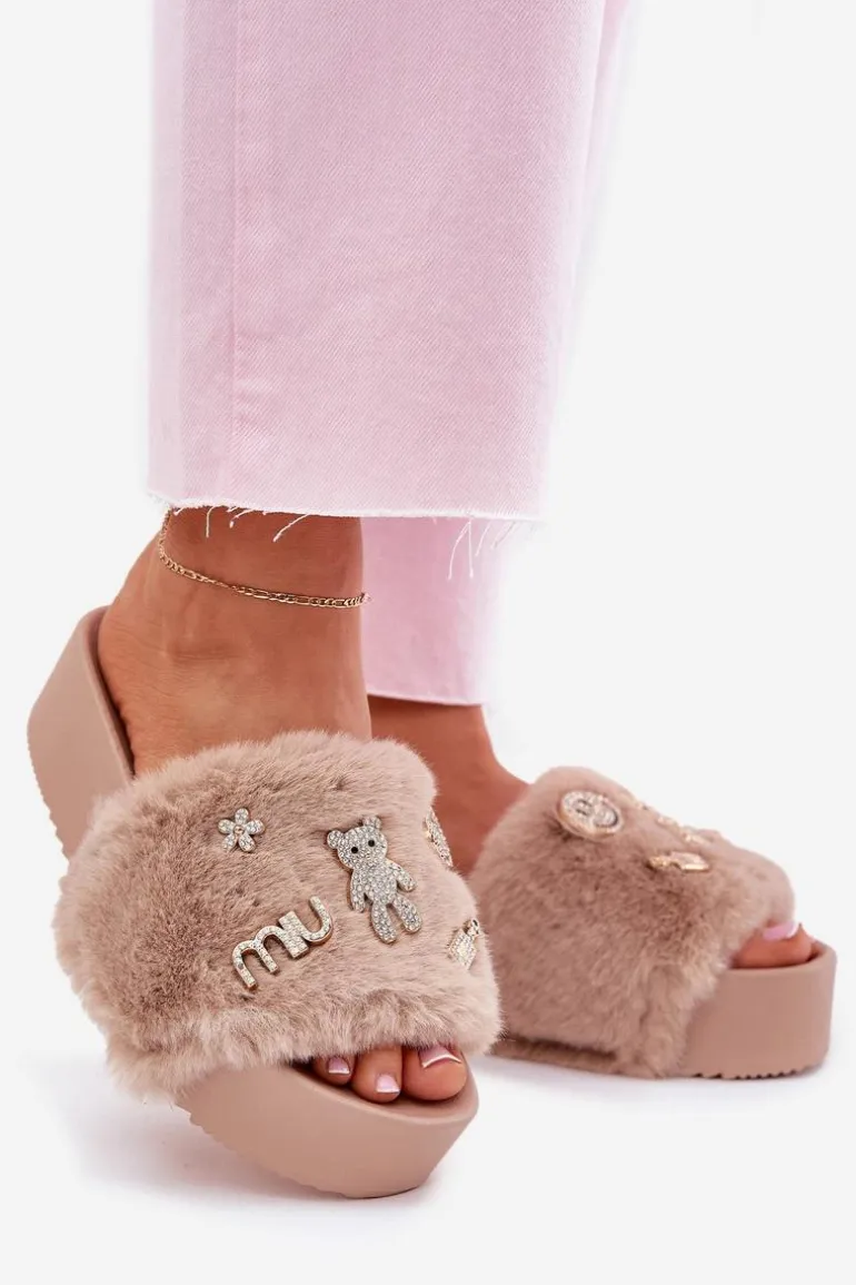 Klapki damskie z futerkiem. Osadzone na masywnej platformie, zapewniają dodatkową wysokość. Złote przypinki stanowią stylowy akcent, nadając wyjątkowego uroku. Idealne do casualowych stylizacji. Przy wyborze rozmiaru prosimy sugerować się tabelą rozmiarów.