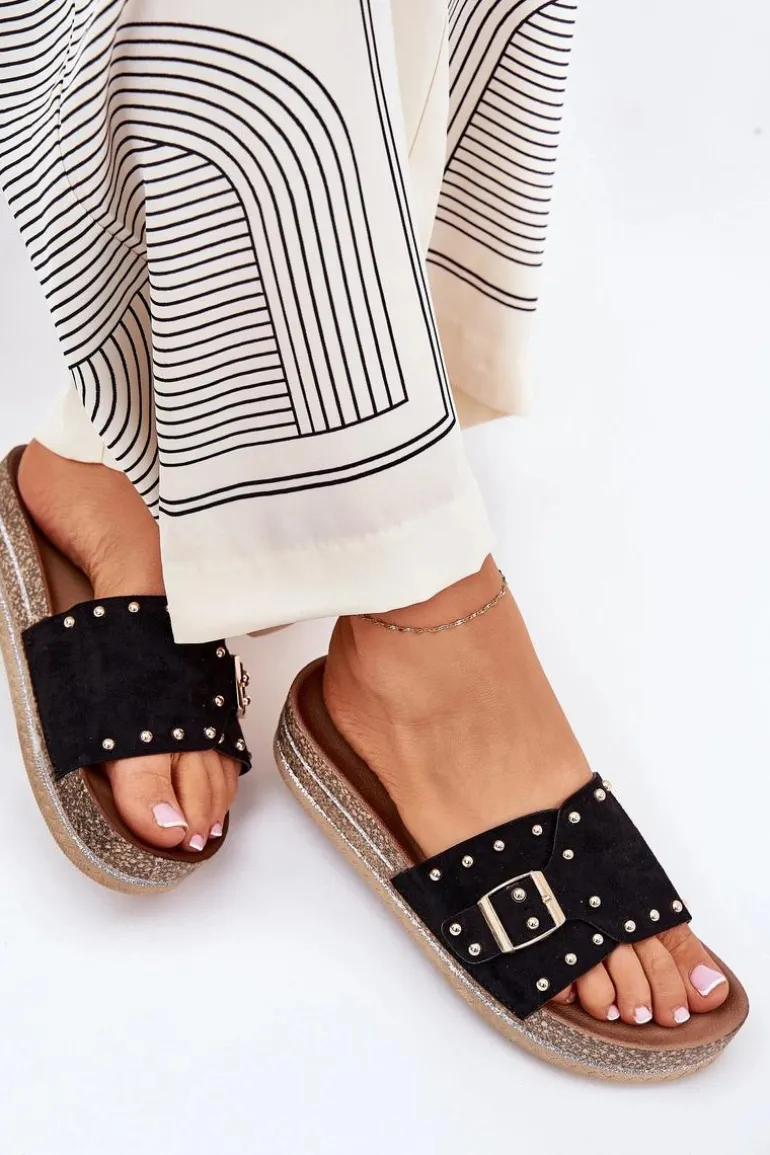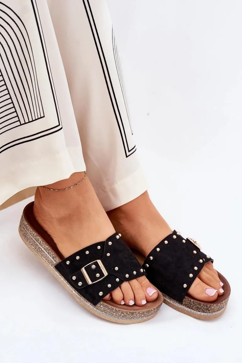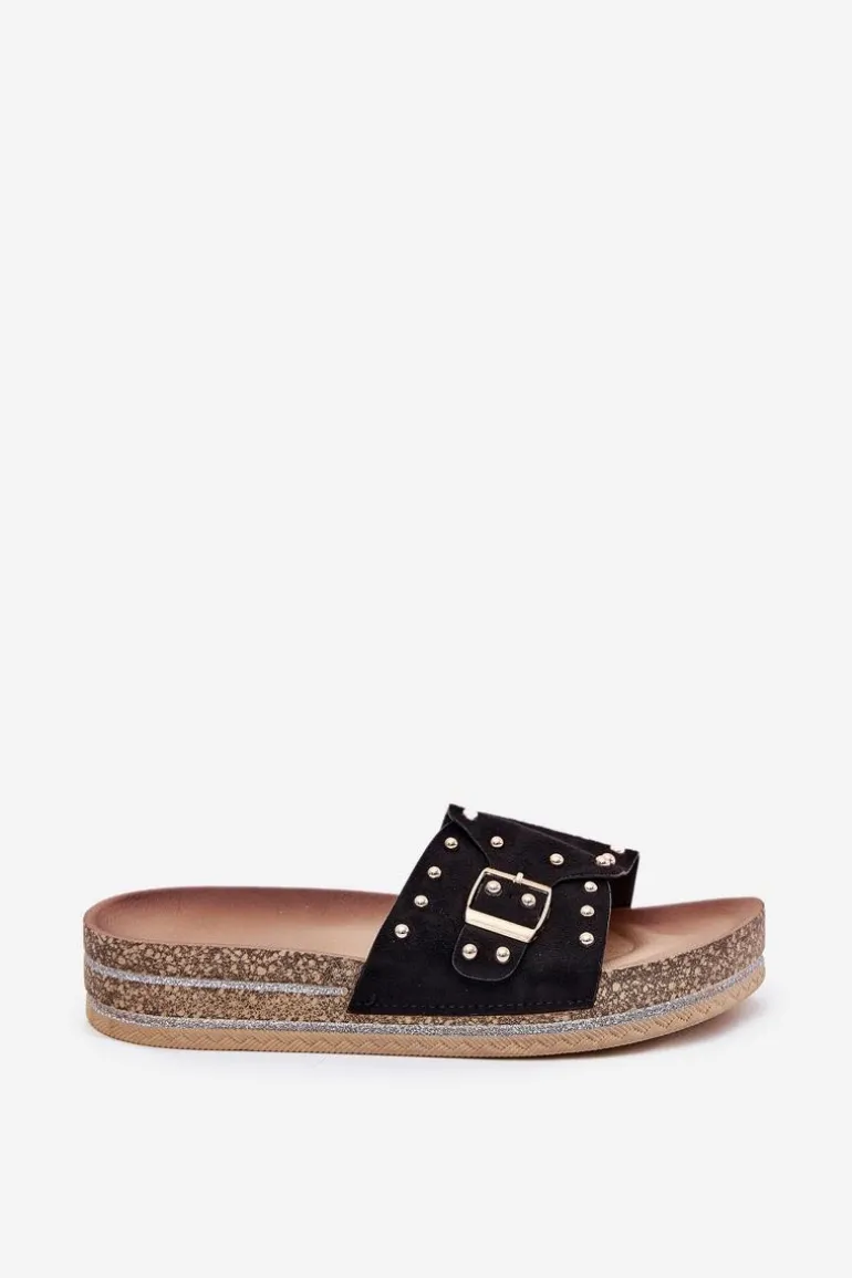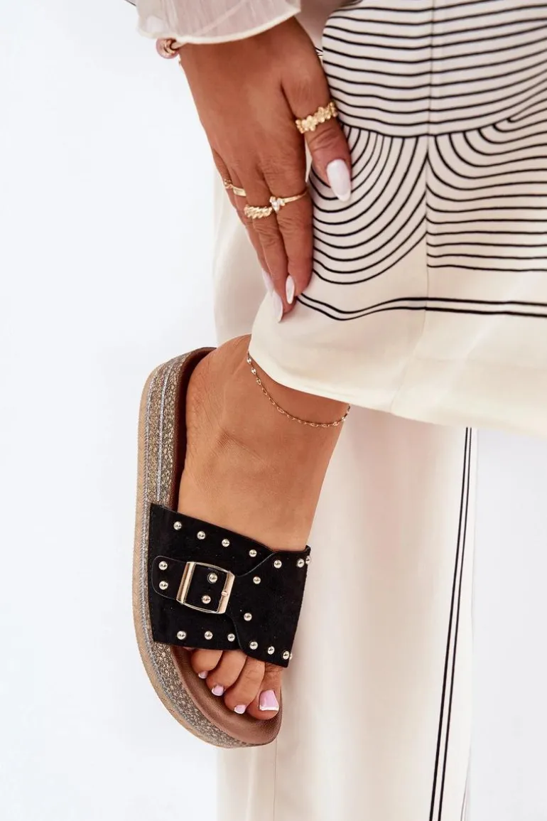Stylowe klapki damskie z eko zamszu, ozdobione klamrą i ćwiekami, które nadają im nowoczesnego i odważnego charakteru. Osadzone na platformie z brokatem, które wprowadzają do każdej stylizacji subtelny blask. Doskonałe na letnie dni, te klapki łączą wygodę z modnym wyglądem, świetnie pasując do sukienek, spódnic i spodni. Przy wyborze rozmiaru rosimy sugerować się tabelą rozmiarów.