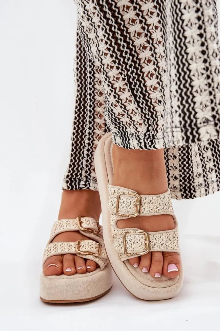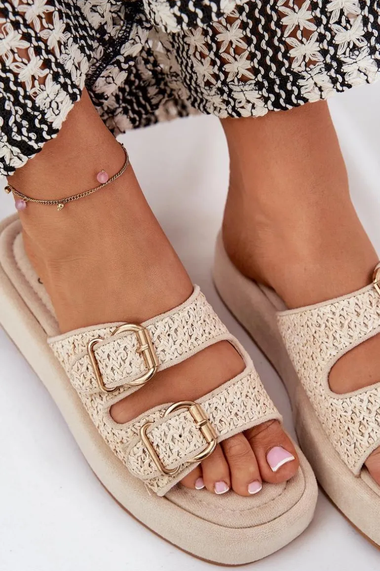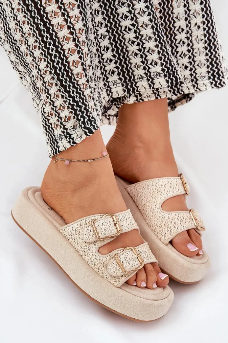 Stylowe klapki damskie na platformie, które łączą wygodę z modnym wyglądem. Ozdobione plecionką i klamrami, co dodaje unikalnego charakteru. Miękka, eko zamszowa wkładka zapewnia komfort przez cały dzień. Te klapki doskonale sprawdzą się w letnich stylizacjach, pasując do sukienek, spódnic czy szortów, wprowadzając lekkość do każdej okazji. Przy wyborze rozmiaru rosimy sugerować się tabelą rozmiarów.