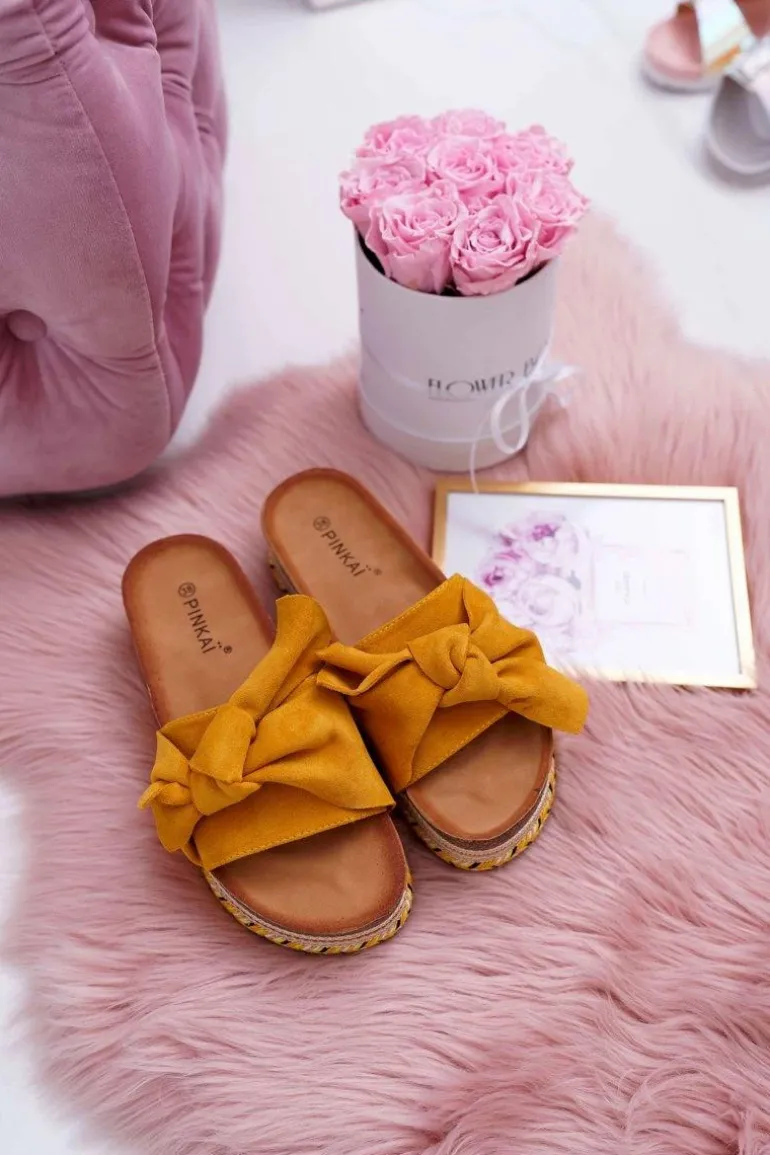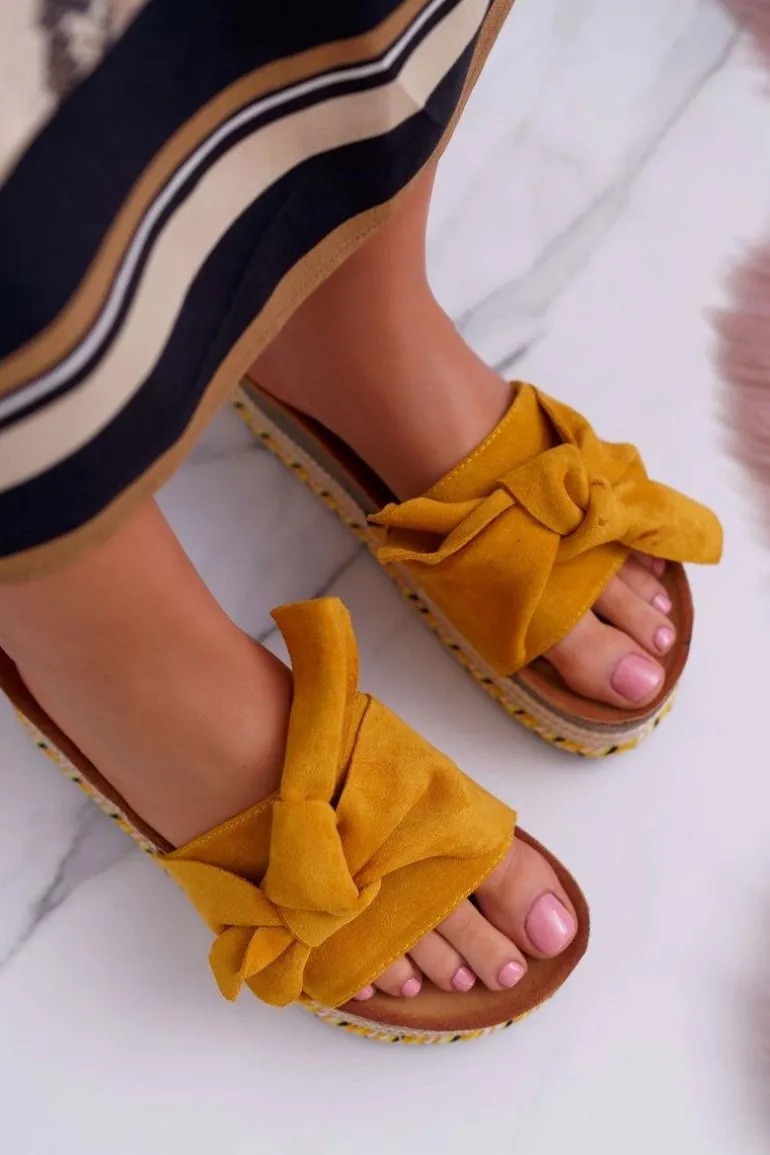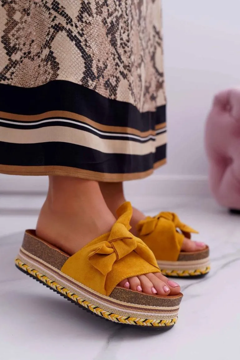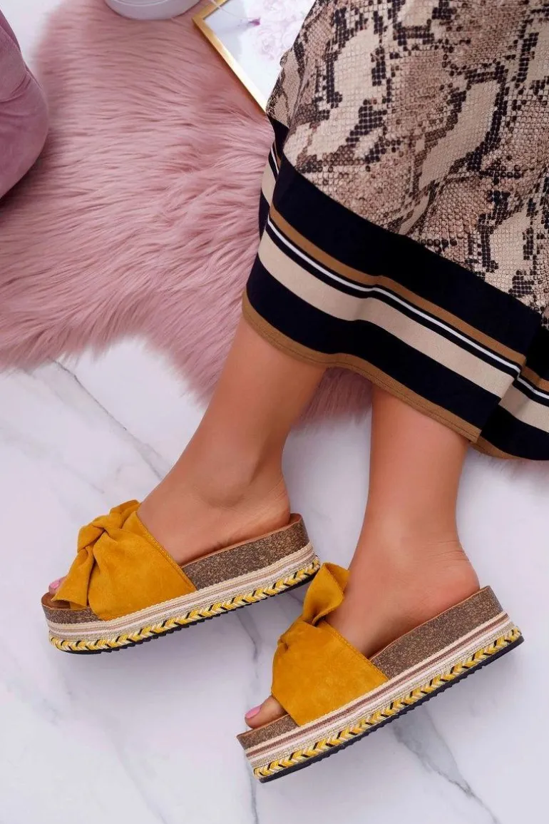 Klapki Damskie Na Platformie Z Kokardą Żółte Chantal