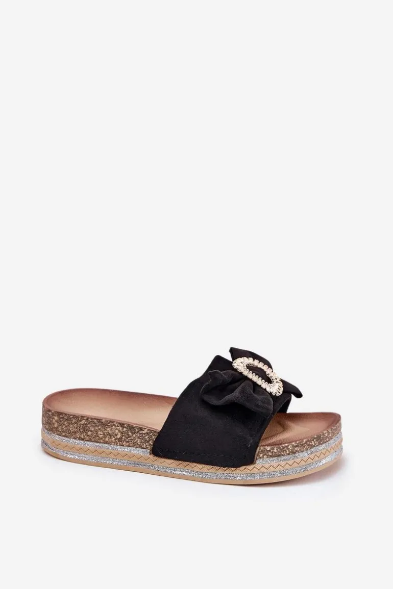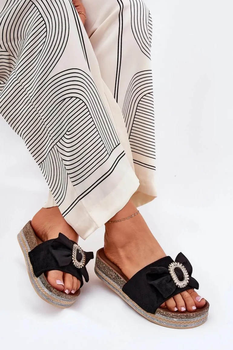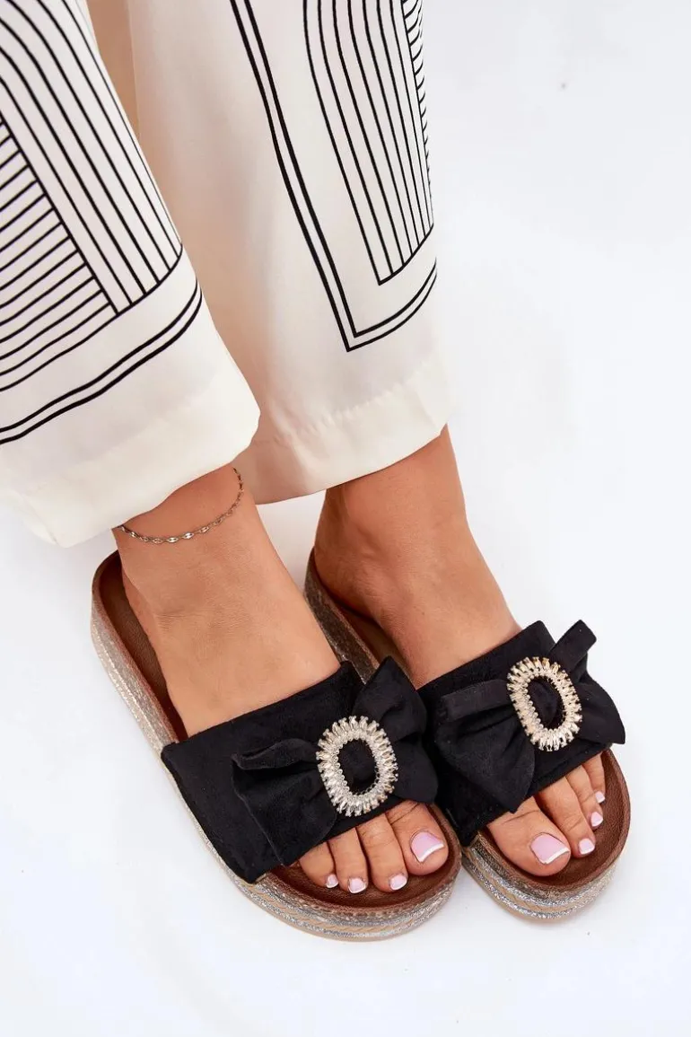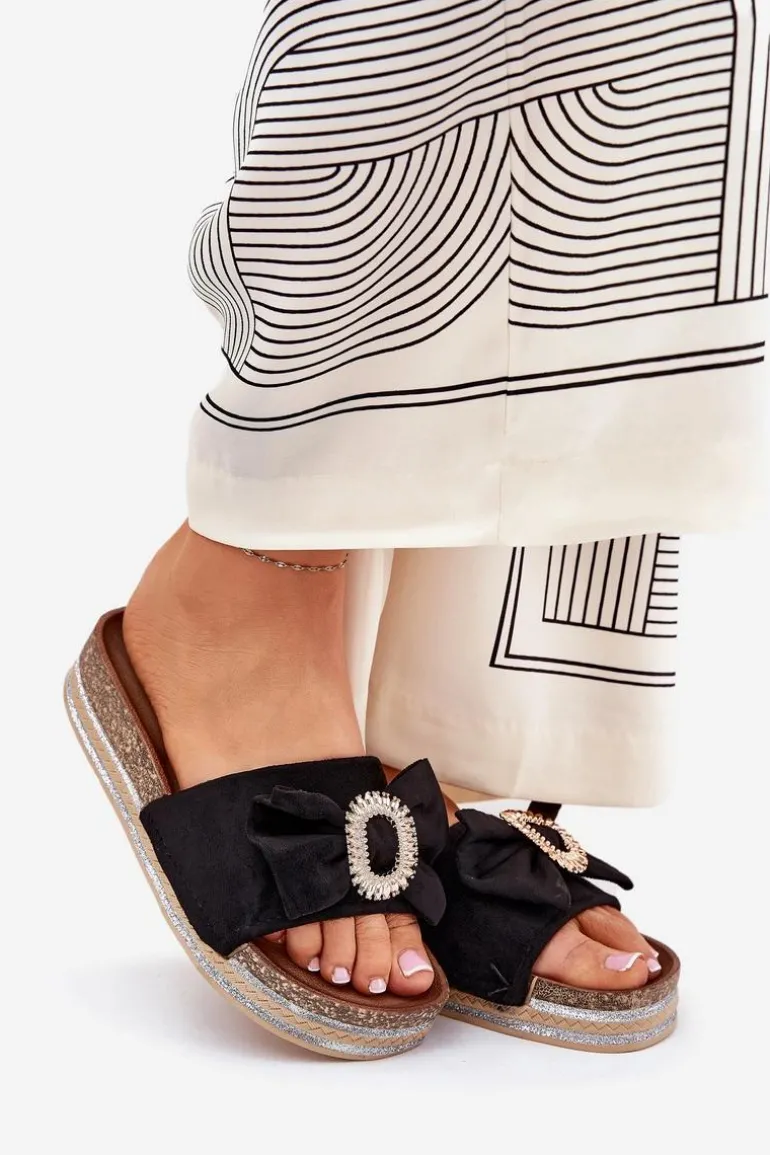 Klapki wykonane z eko zamszu. Z przodu kokardka i ozdobna broszka. Osadzone na platformie z brokatem, który wprowadza do każdej stylizacji odrobinę blasku i elegancji. Te klapki będą doskonałym wyborem na letnie dni, idealnie komponując się z sukienkami, spódnicami czy szortami, dodając każdemu lookowi nowoczesnego akcentu. Przy wyborze rozmiaru rosimy sugerować się tabelą rozmiarów.