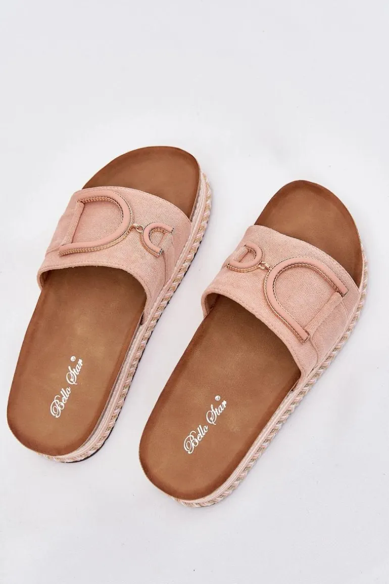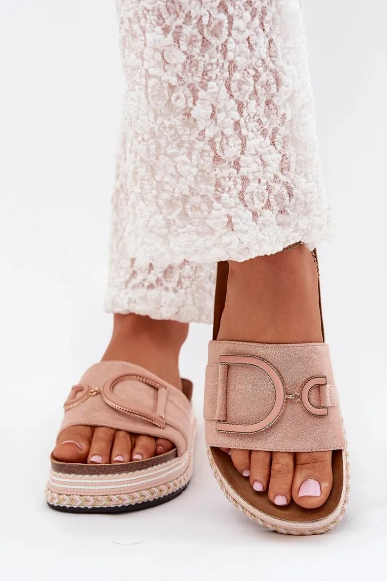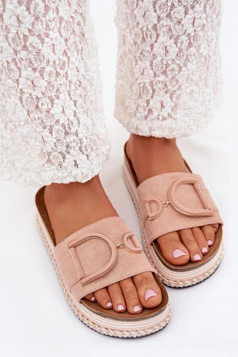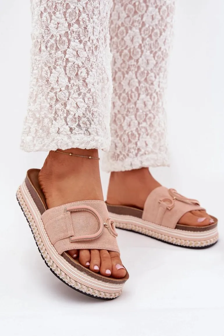 Klapki damskie wykonane z eko zamszu, osadzone na masywnej platformie, łączą wygodę z modnym wyglądem. Z przodu na pasku znajduje się ozdobny element, który dodaje im unikalnego charakteru. Profilowana wkładka zapewnia komfort przez cały dzień, sprawiając, że klapki są doskonałe do letnich stylizacji. Przy wyborze rozmiaru prosimy sugerować się tabelą rozmiarów.