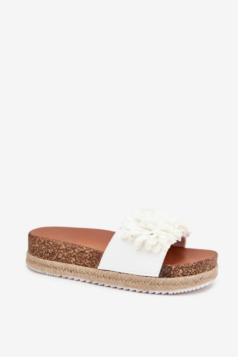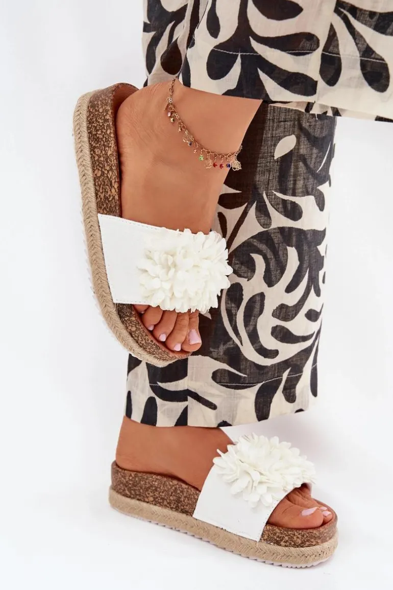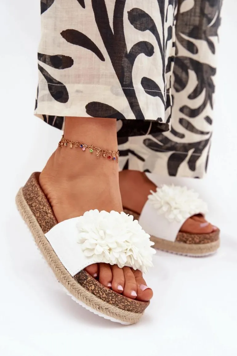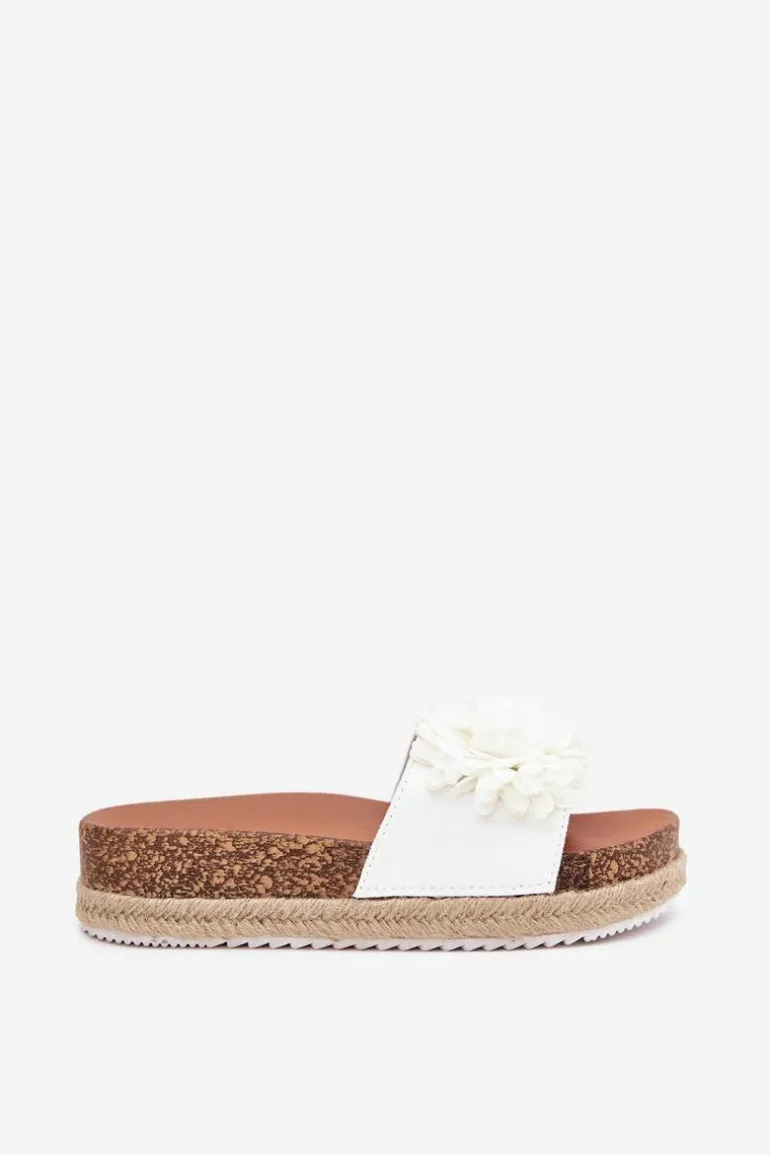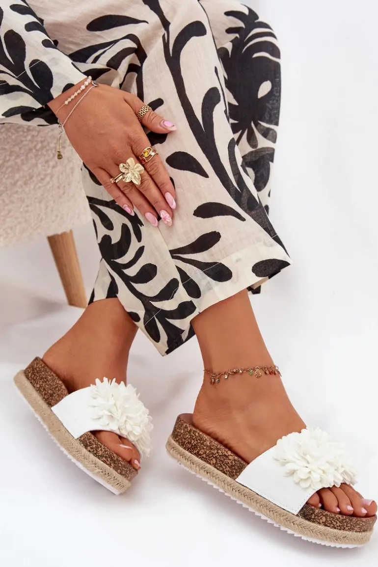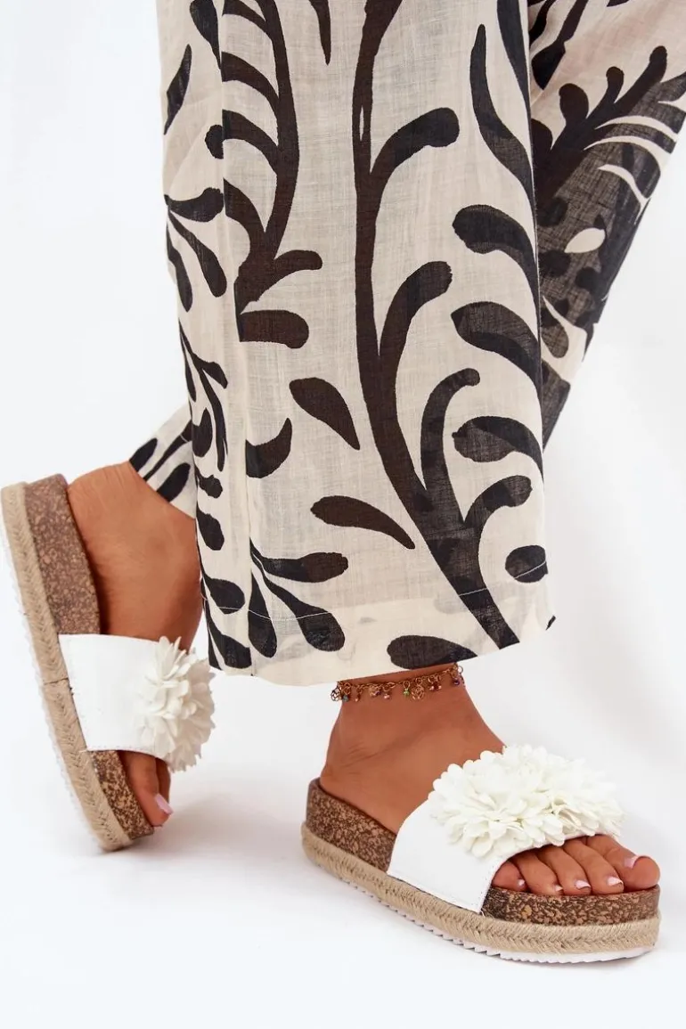 Klapki Damskie Na Platformie Z Ozdobnymi Kwiatkami Białe Tessara