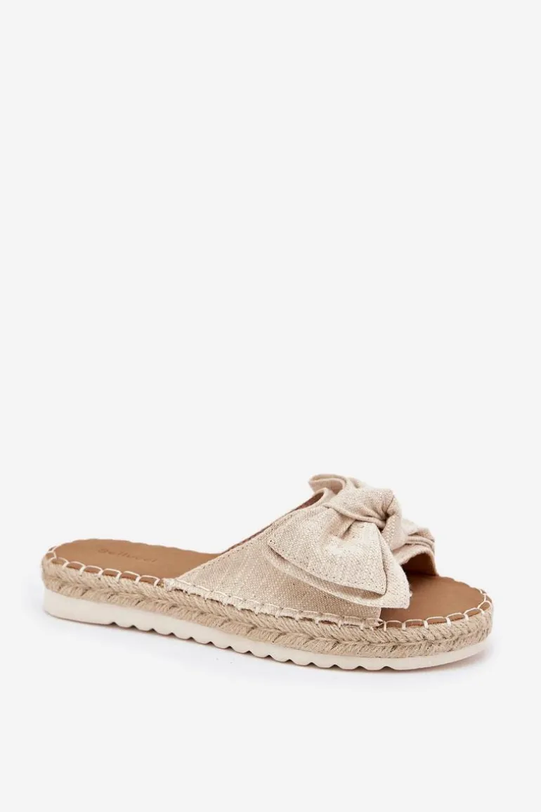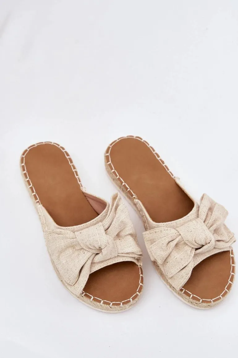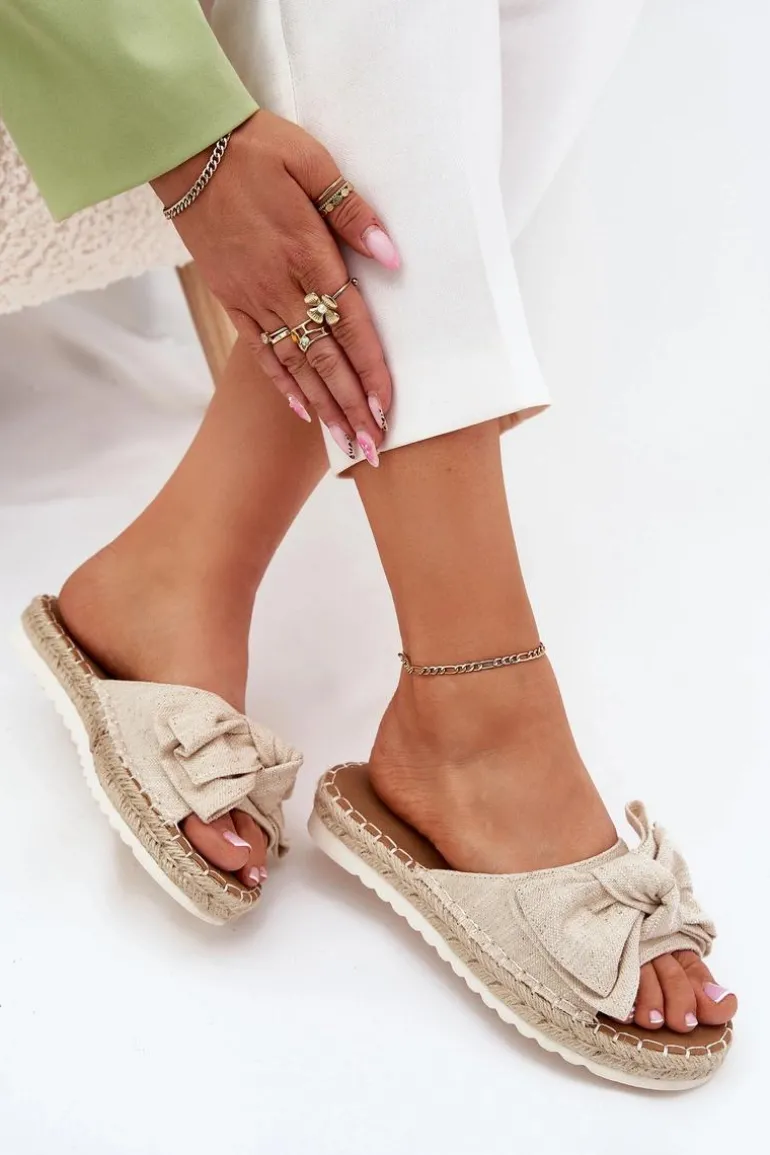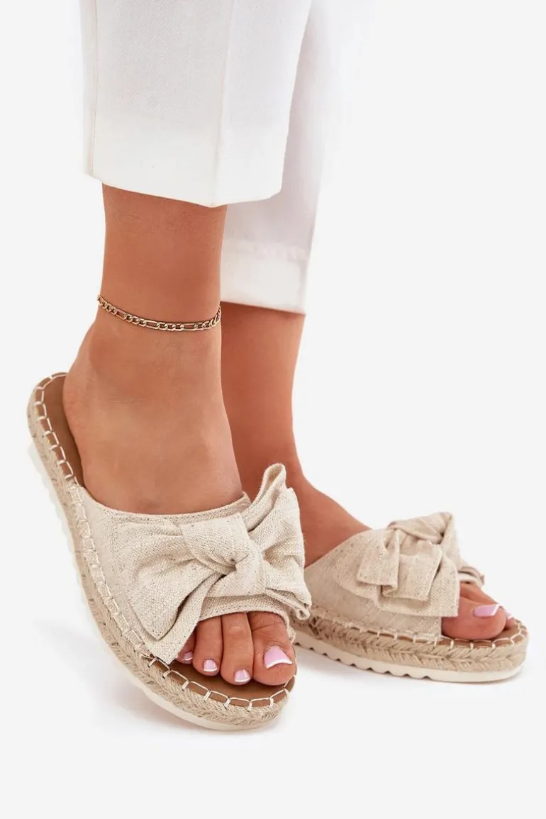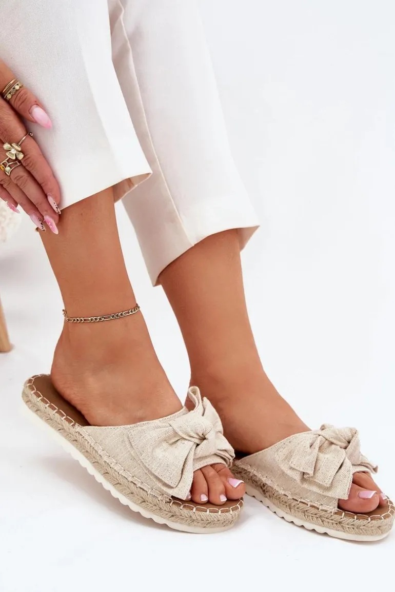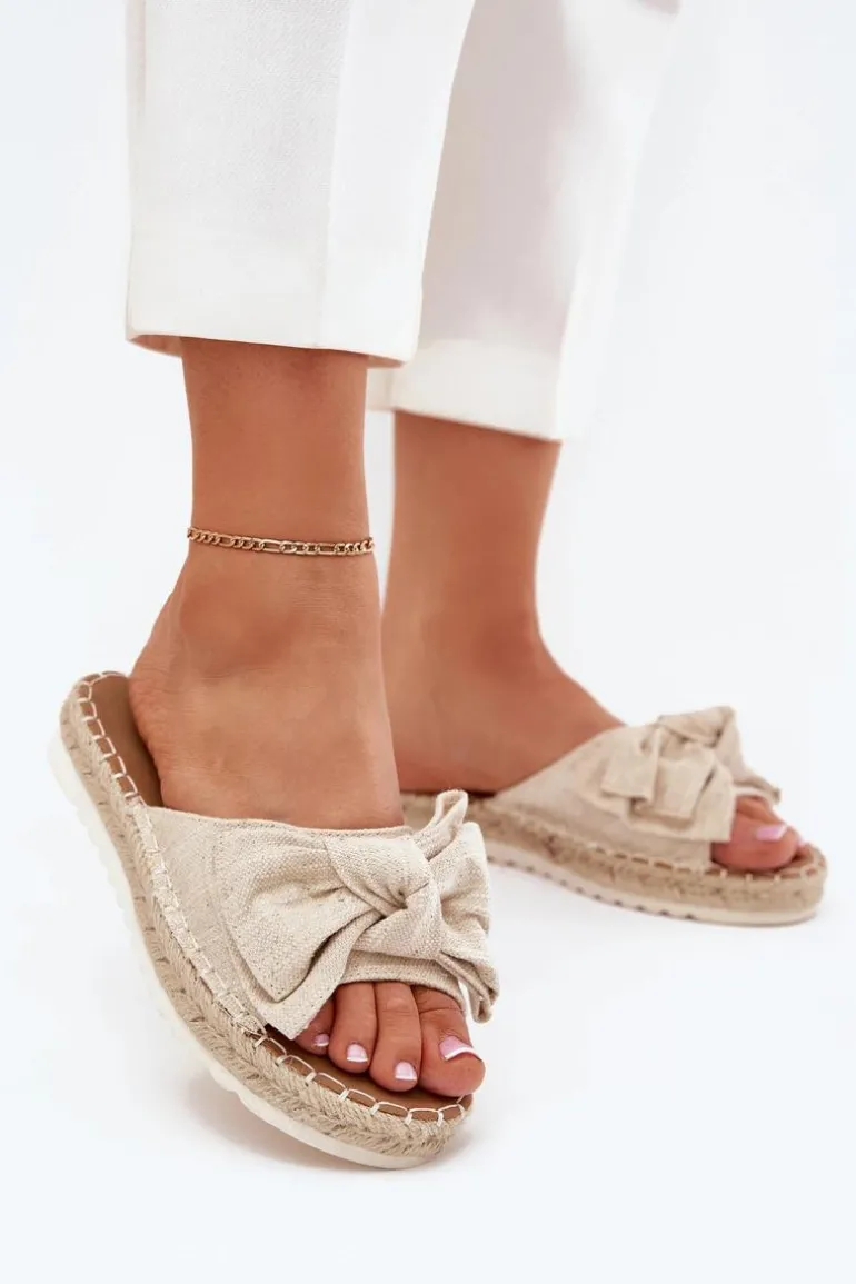 Klapki damskie wykonane z materiału tekstylnego. Osadzone na platformie z plecionką to stylowa i wygodna propozycja na ciepłe dni. Z przodu znajduje się subtelna kokardka, która dodaje im uroku. Lekkie i komfortowe, doskonale pasują do sukienek, spódnic oraz spodni. Przy wyborze rozmiaru rosimy sugerować się tabelą rozmiarów.
