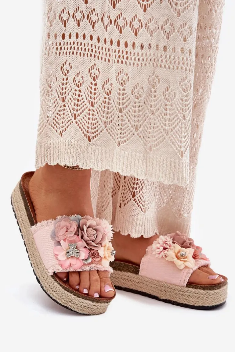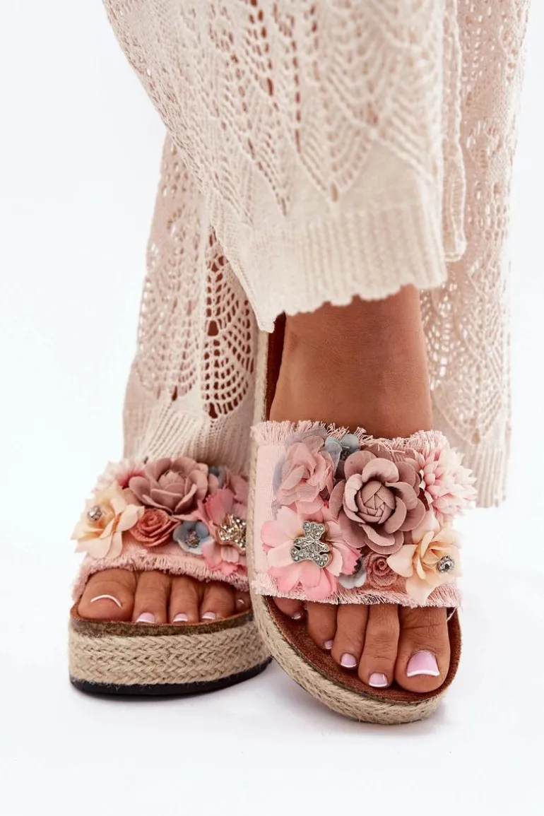 Te damskie klapki ozdobione uroczymi materiałowymi kwiatami i przypinką w formie misia to świetna opcja, która doda unikalnego akcentu do każdej stylizacji. Osadzone na platformie platformie z jutową plecionką, łączą komfort z modnym wyglądem. Dzięki profilowanej eko zamszowej wkładce zapewniają wygodę przez cały dzień. Ten model z pewnością przyciągnie spojrzenia i sprawi, że wyróżnisz się w tłumie! Przy wyborze rozmiaru prosimy sugerować się tabelą rozmiarów.