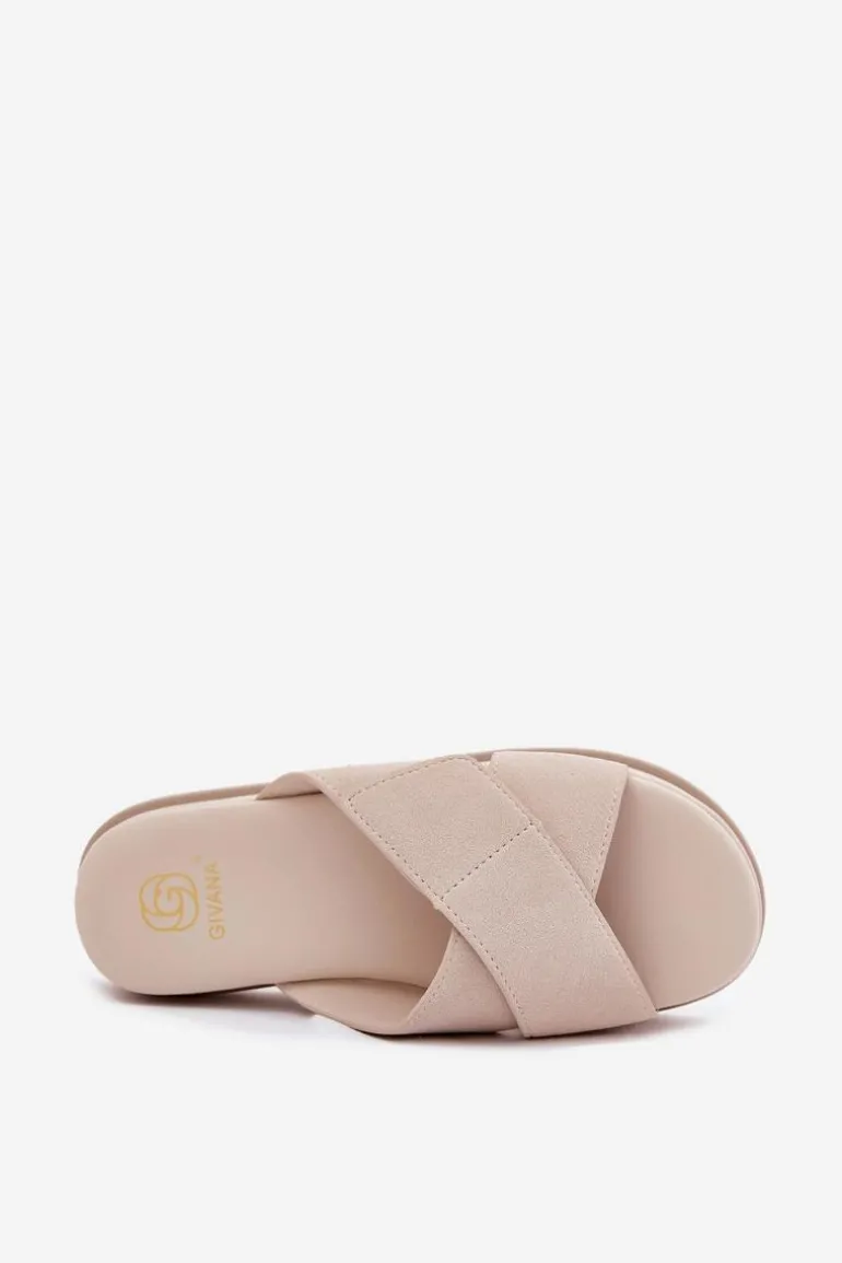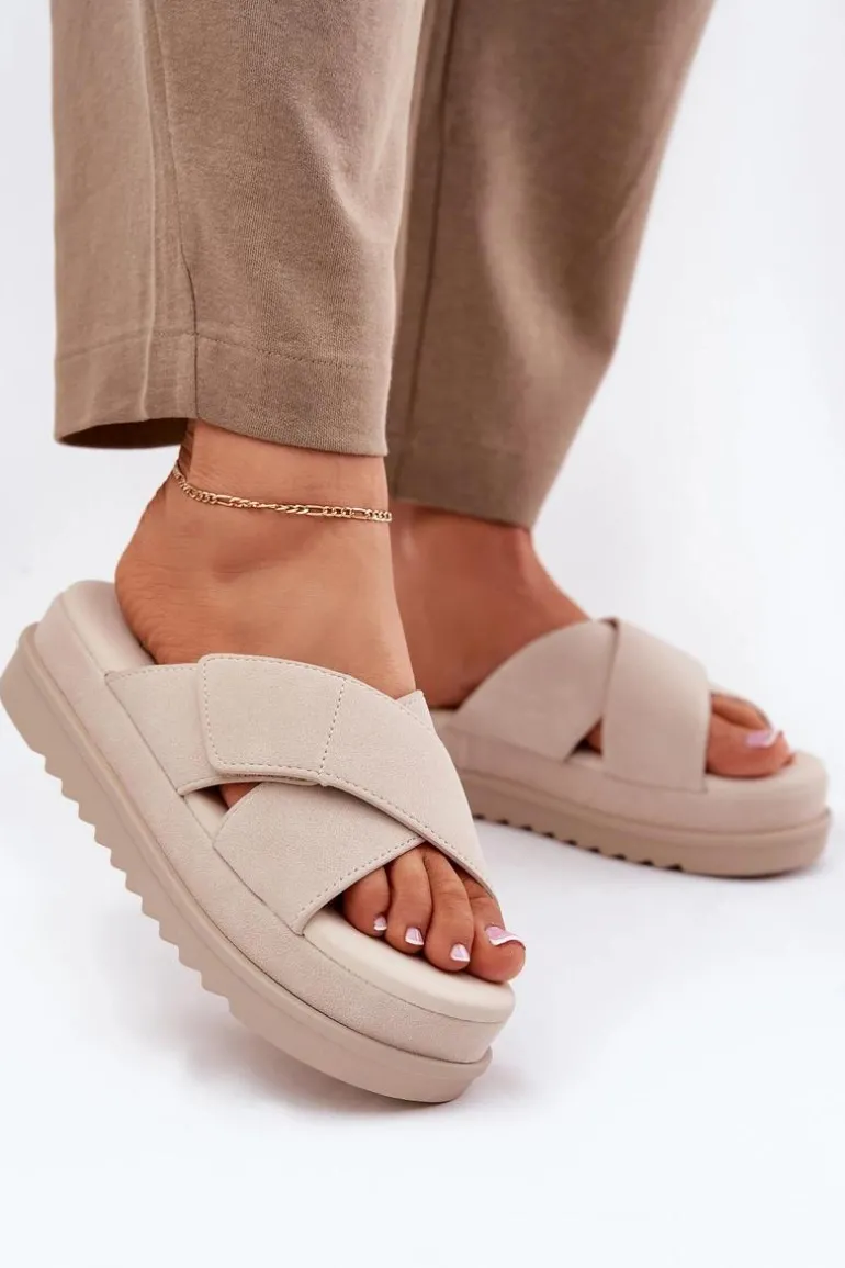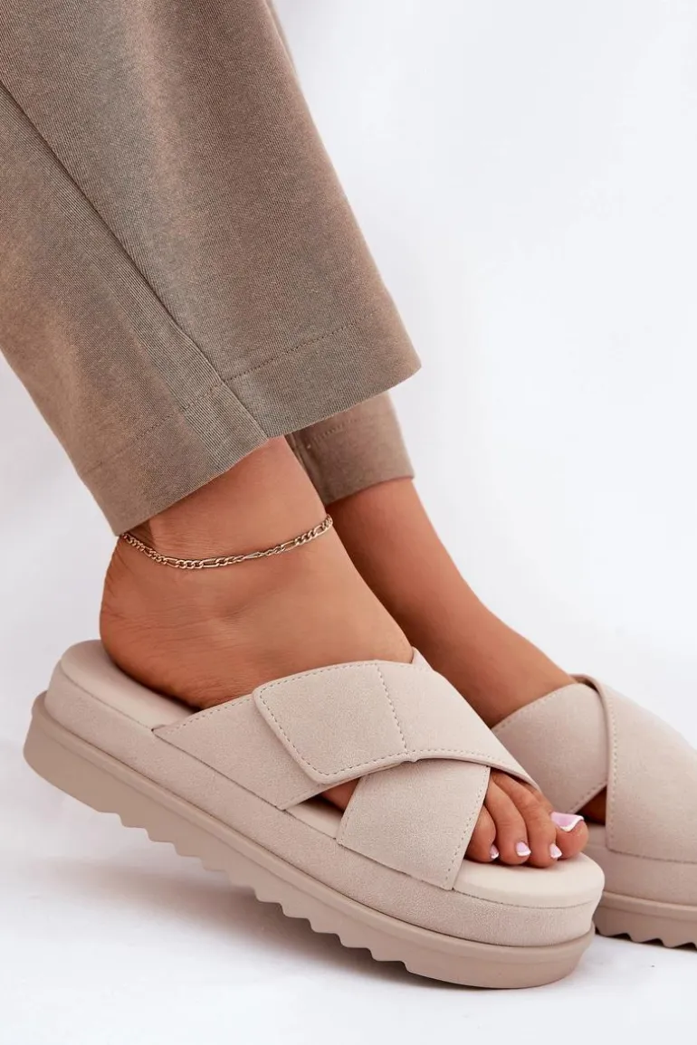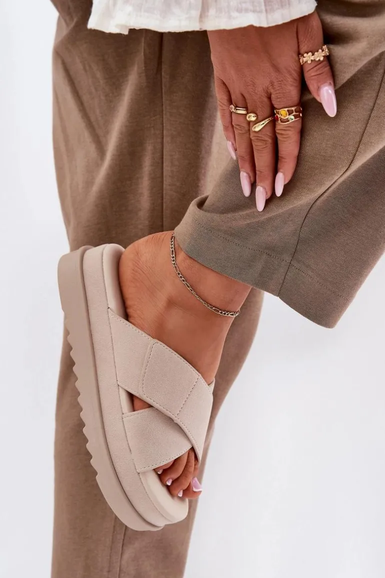 Damskie klapki wykonane z eko zamszu to doskonała propozycja na ciepłe dni. Osadzone na platformie, zapewniają wygodę i stabilność przez cały dzień. Z przodu znajdują się dwa przeplatające się paski, z których jeden posiada rzep, umożliwiający łatwe dopasowanie do stopy. Te klapki to połączenie komfortu z modnym wyglądem, idealne do letnich stylizacji. Przy wyborze rozmiaru prosimy sugerować się tabelą rozmiarów.