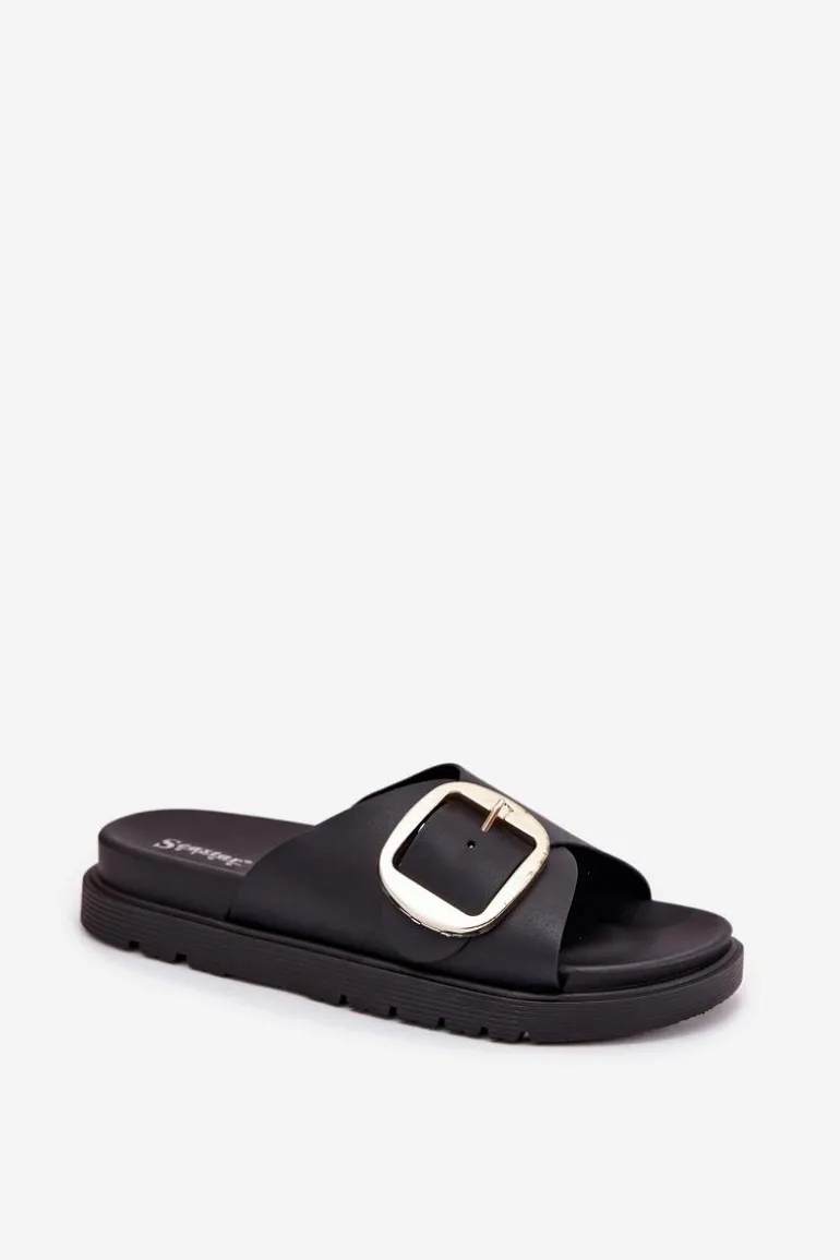 Klapki Damskie Na Platformie Ze Złotą Klamrą Czarne Jovira