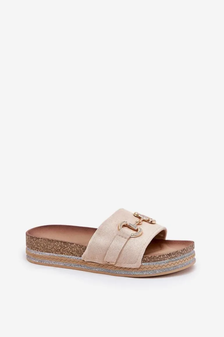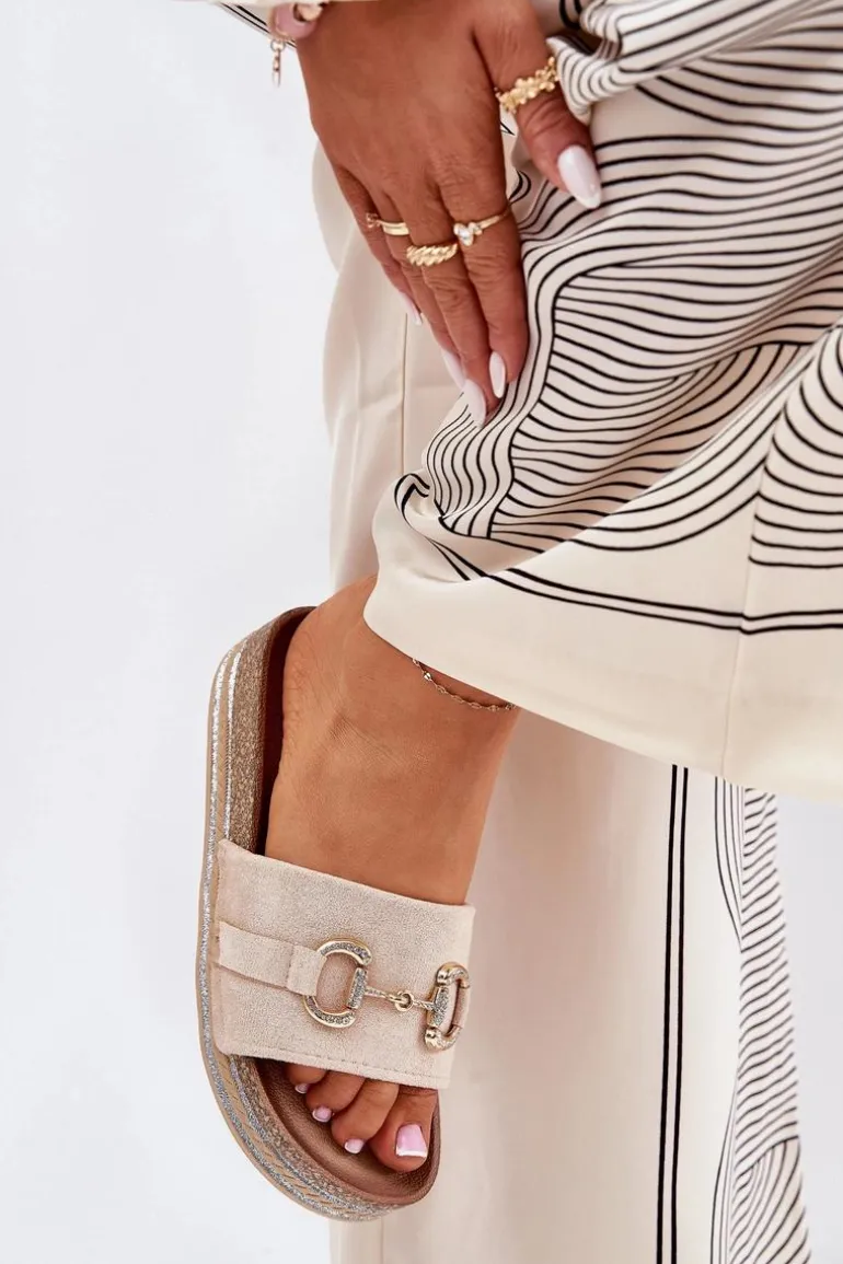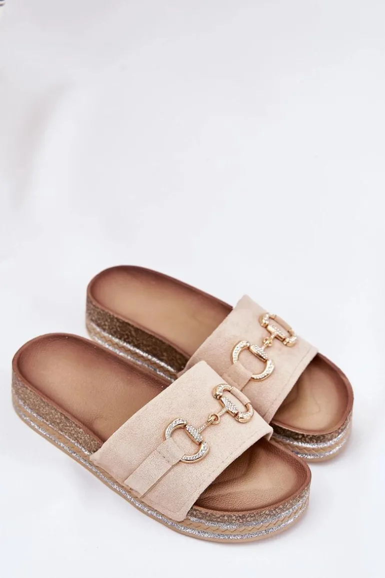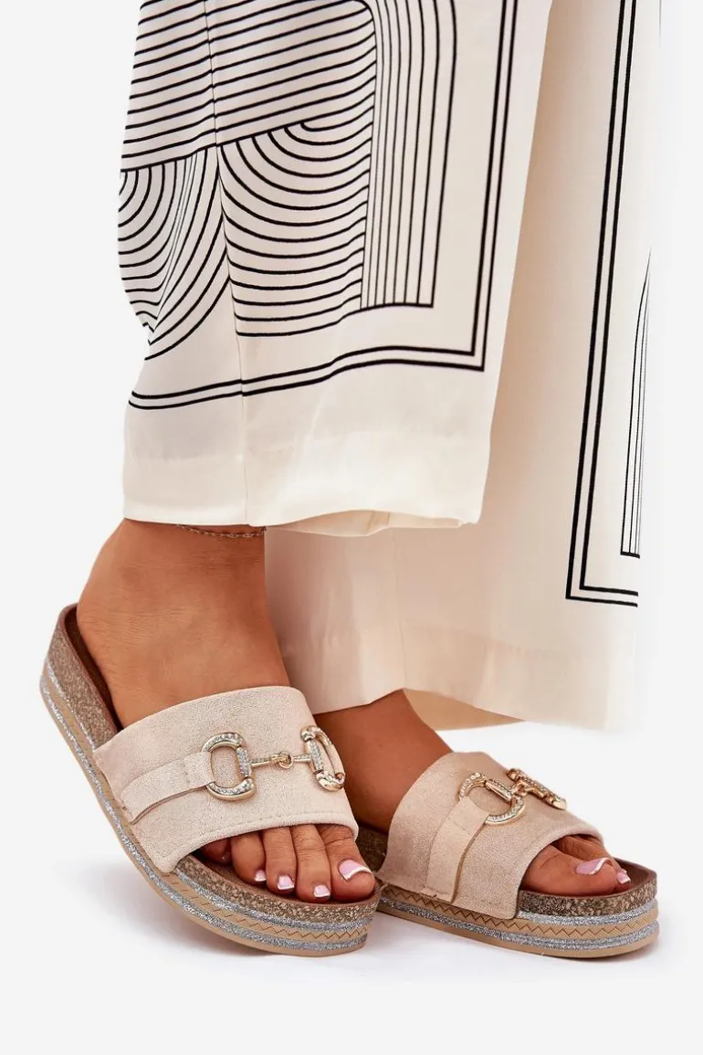 Klapki wykonane z eko zamszu. Z przodu ozdobny złoty detal, który nadaje im subtelnego blasku. Osadzone na platformie ozdobionej brokatem, które wprowadzają odrobinę glamour do każdej stylizacji. Profilowana wkładka zapewnia wygodę przez cały dzień. Idealne na letnie dni, te klapki doskonale pasują do sukienek, spódnic czy spodni, łącząc modny wygląd z funkcjonalnością. Przy wyborze rozmiaru rosimy sugerować się tabelą rozmiarów.