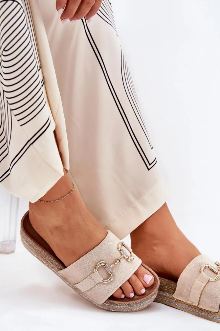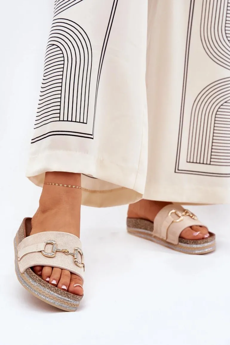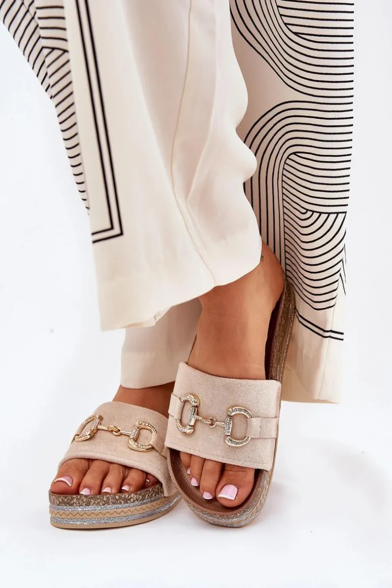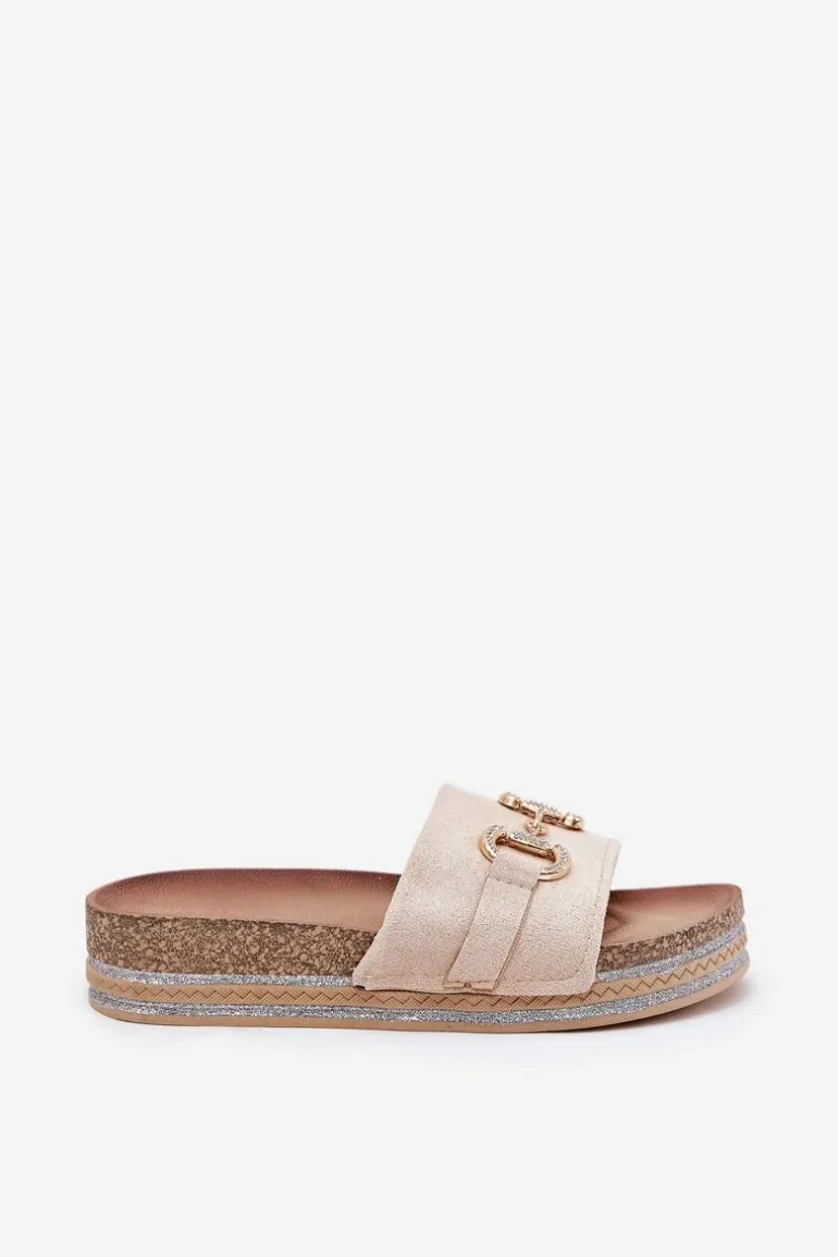 Klapki wykonane z eko zamszu. Z przodu ozdobny złoty detal, który nadaje im subtelnego blasku. Osadzone na platformie ozdobionej brokatem, które wprowadzają odrobinę glamour do każdej stylizacji. Profilowana wkładka zapewnia wygodę przez cały dzień. Idealne na letnie dni, te klapki doskonale pasują do sukienek, spódnic czy spodni, łącząc modny wygląd z funkcjonalnością. Przy wyborze rozmiaru rosimy sugerować się tabelą rozmiarów.