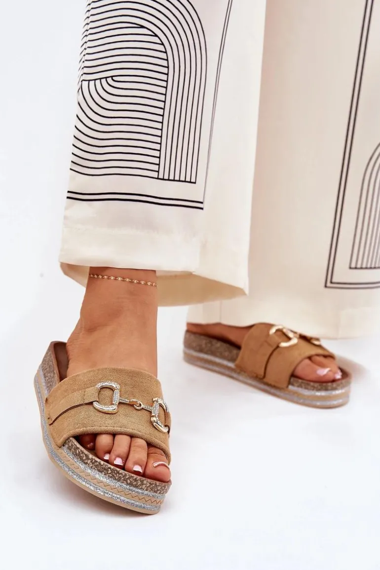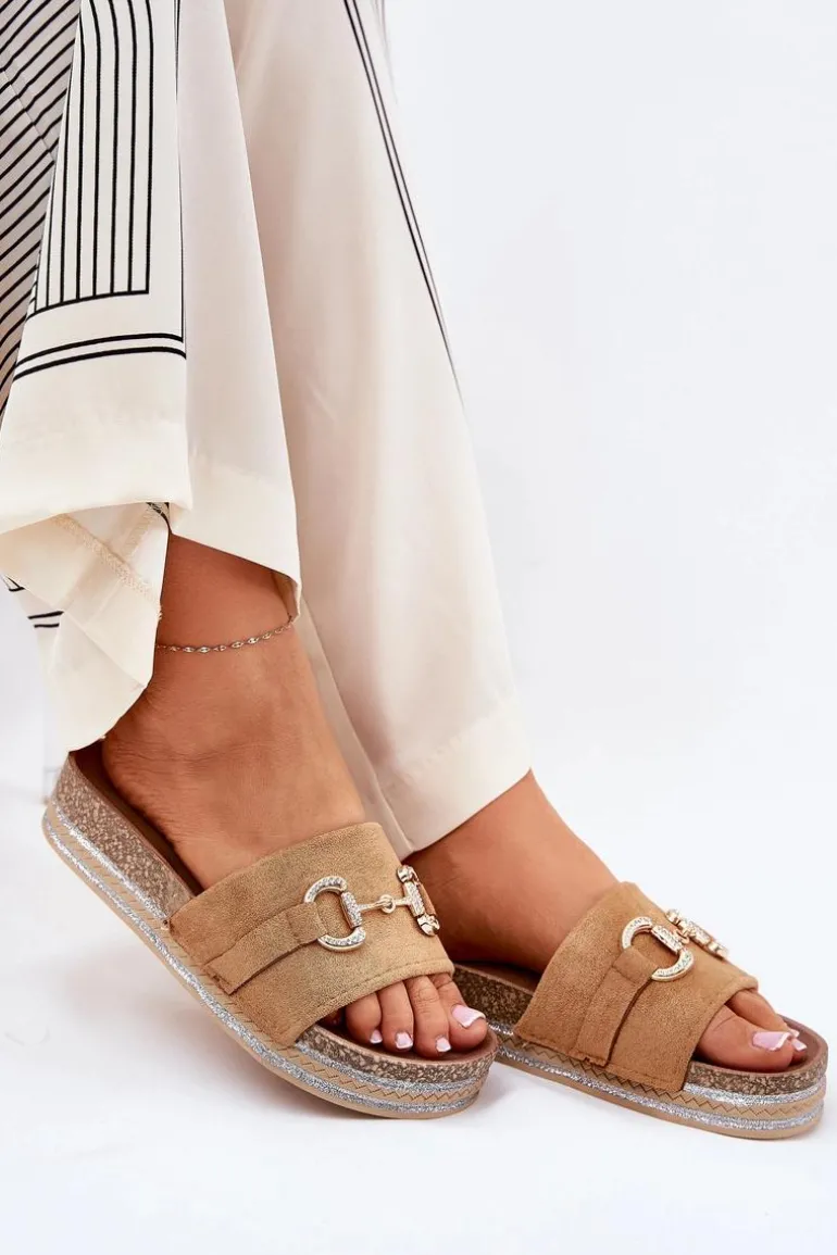 Klapki wykonane z eko zamszu. Z przodu ozdobny złoty detal, który nadaje im subtelnego blasku. Osadzone na platformie ozdobionej brokatem, które wprowadzają odrobinę glamour do każdej stylizacji. Profilowana wkładka zapewnia wygodę przez cały dzień. Idealne na letnie dni, te klapki doskonale pasują do sukienek, spódnic czy spodni, łącząc modny wygląd z funkcjonalnością. Przy wyborze rozmiaru rosimy sugerować się tabelą rozmiarów.