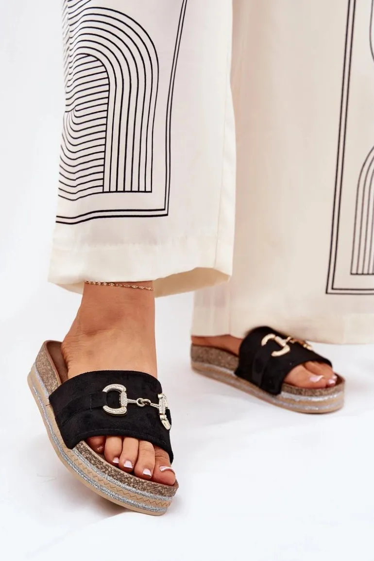 Klapki wykonane z eko zamszu. Z przodu ozdobny złoty detal, który nadaje im subtelnego blasku. Osadzone na platformie ozdobionej brokatem, które wprowadzają odrobinę glamour do każdej stylizacji. Profilowana wkładka zapewnia wygodę przez cały dzień. Idealne na letnie dni, te klapki doskonale pasują do sukienek, spódnic czy spodni, łącząc modny wygląd z funkcjonalnością. Przy wyborze rozmiaru rosimy sugerować się tabelą rozmiarów.