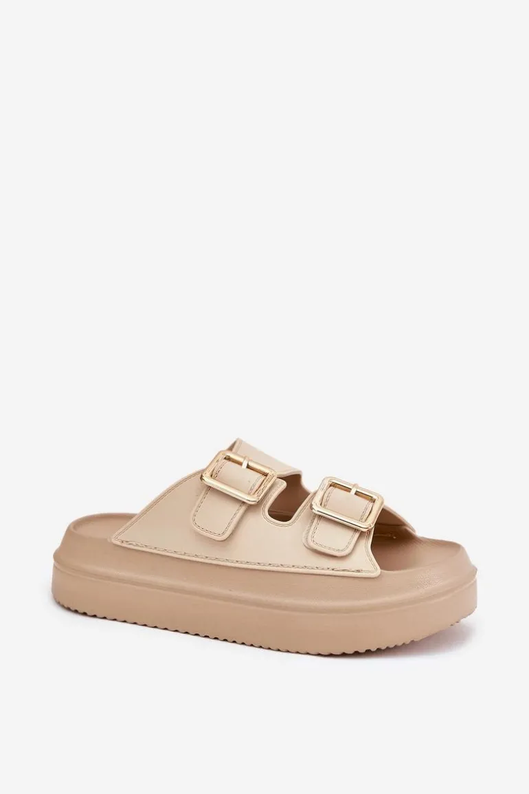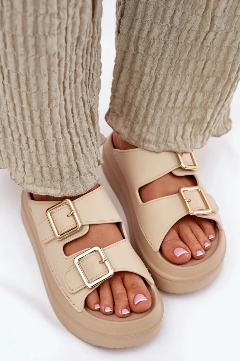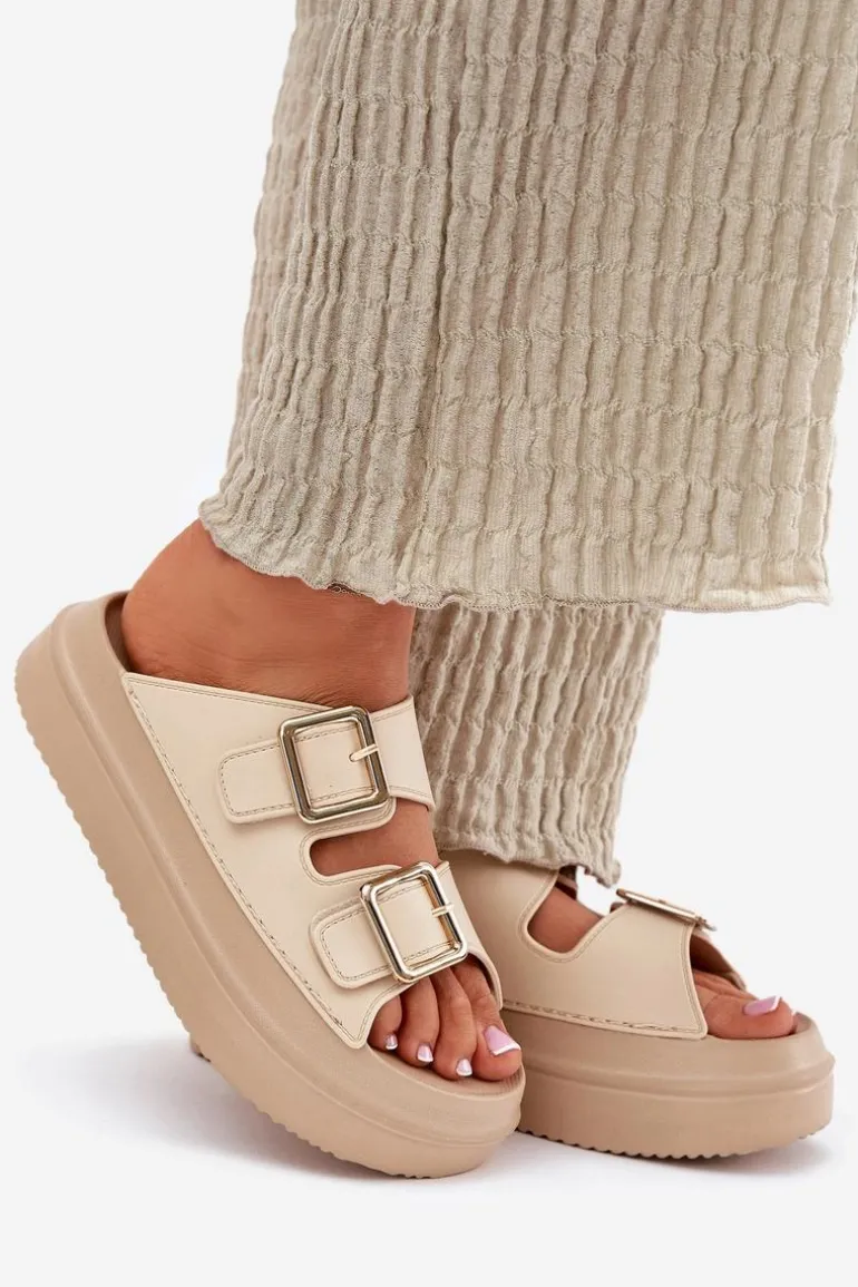 Klapki Damskie Na Platformie Ze Złotymi Klamrami Beżowe Zorila
