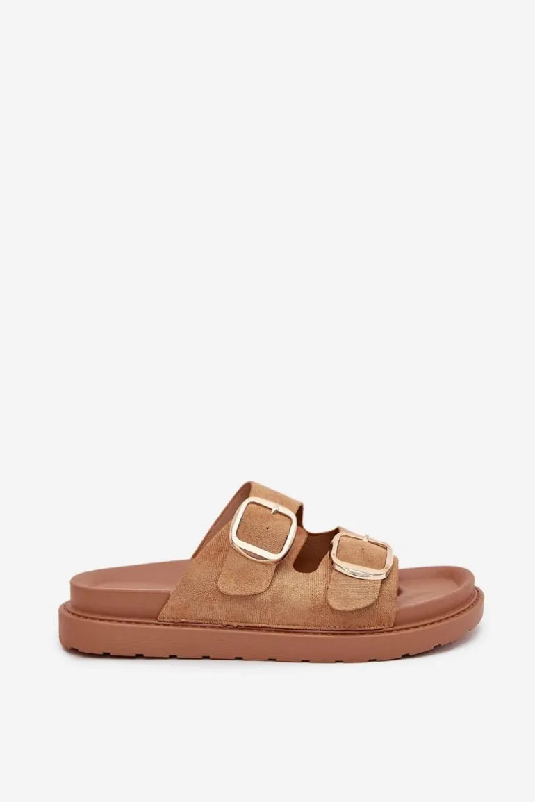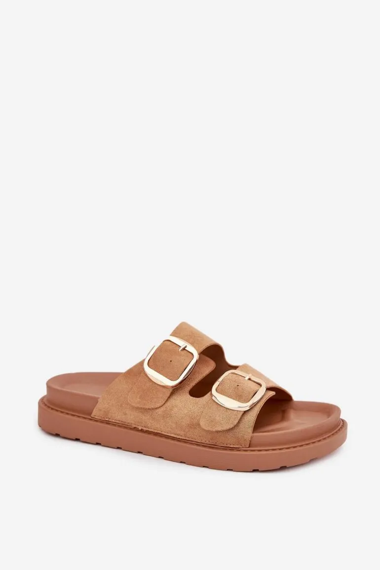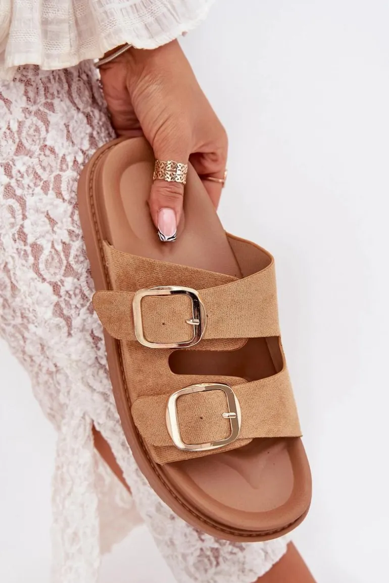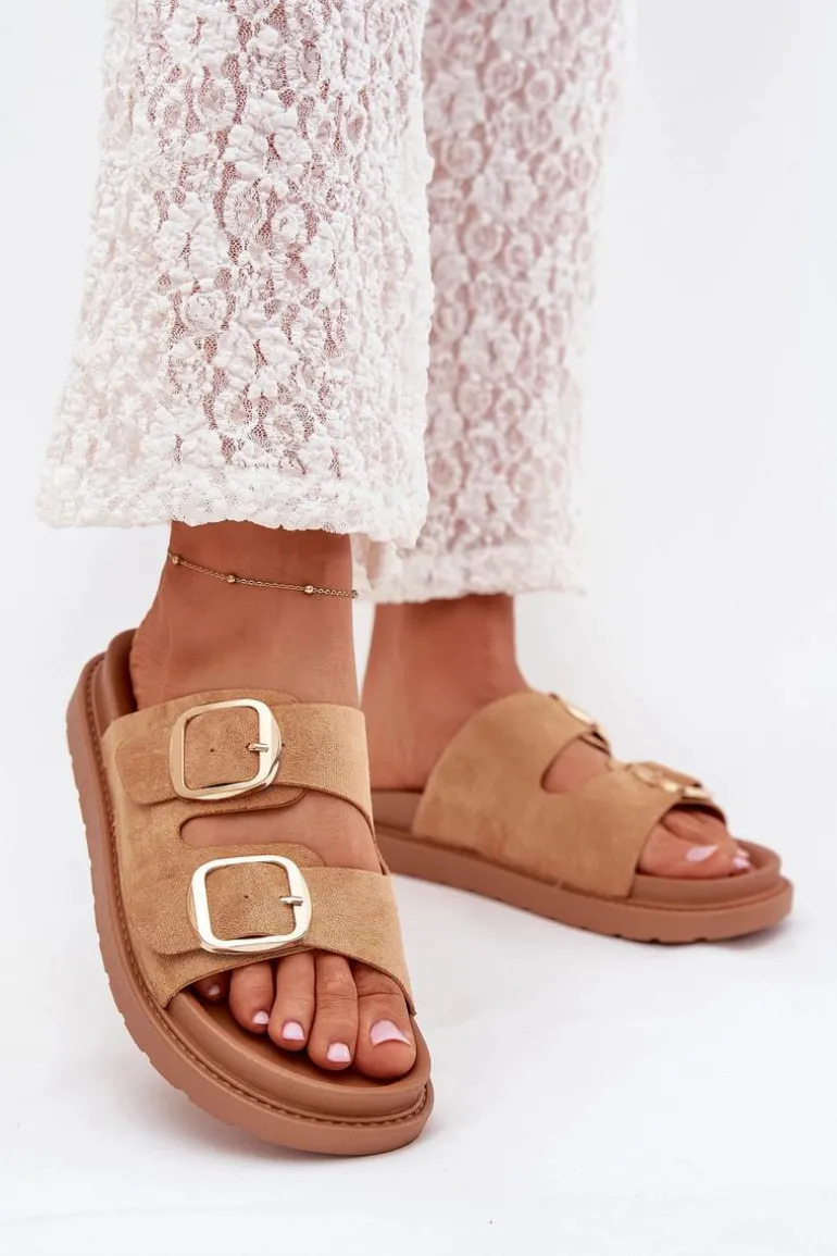 Klapki damskie wykonane z eko zamszu. Osadzone na platformie. Dwa regulowane paski ze złotymi klamrami zapewniają idealne dopasowanie, a profilowana wkładka gwarantuje komfort przez cały dzień. Idealne na codzienne wyjścia. Przy wyborze rozmiaru rosimy sugerować się tabelą rozmiarów.
