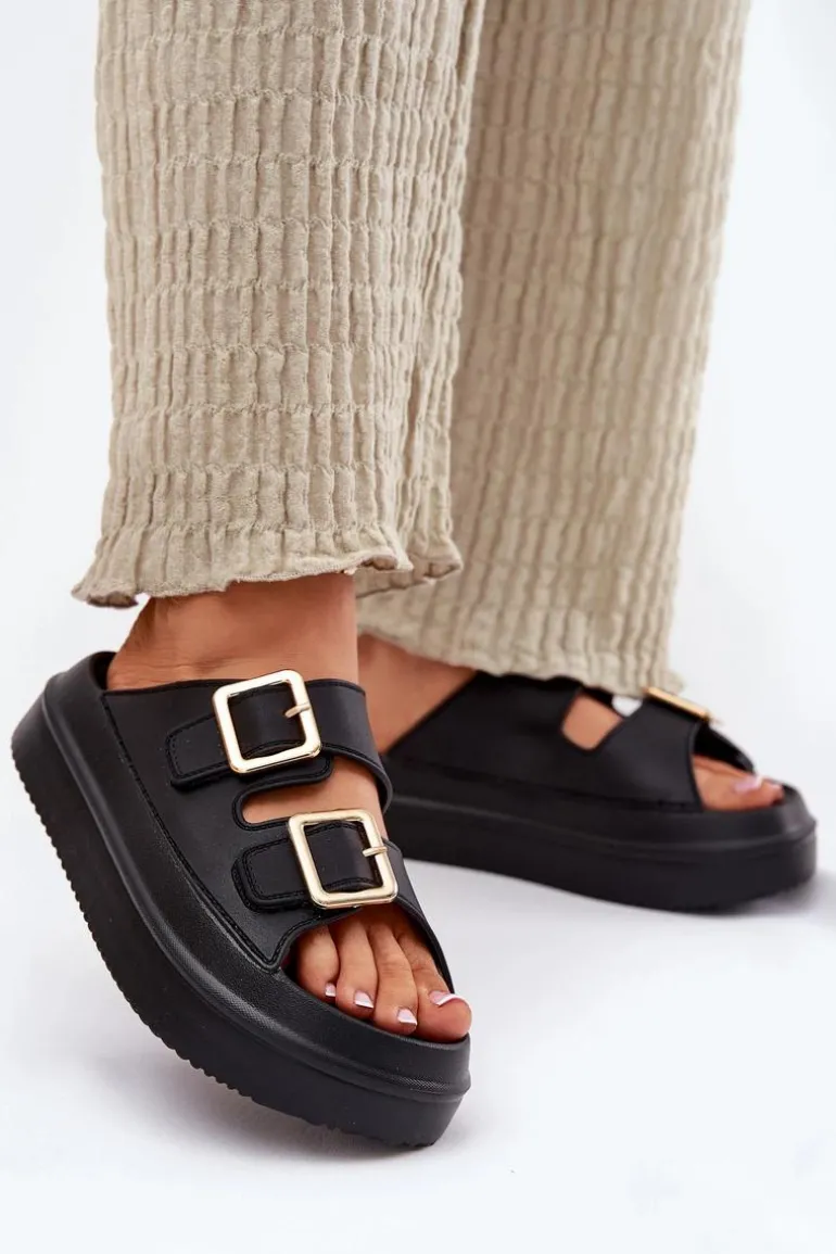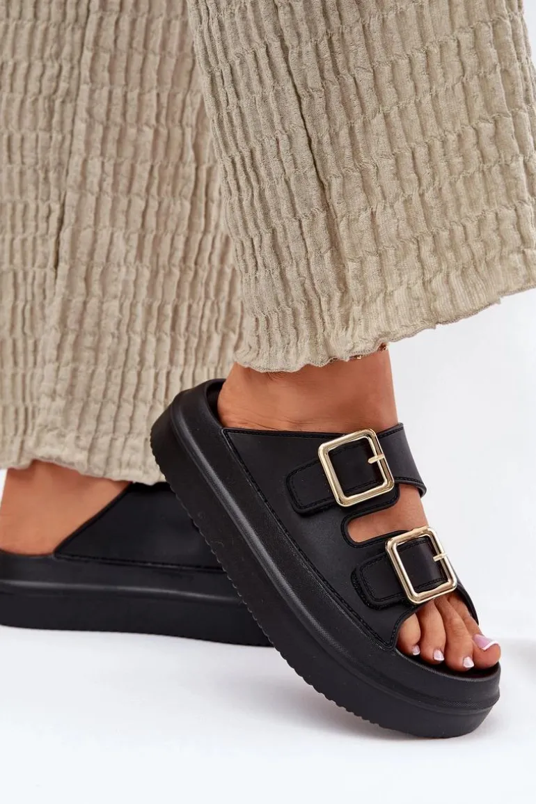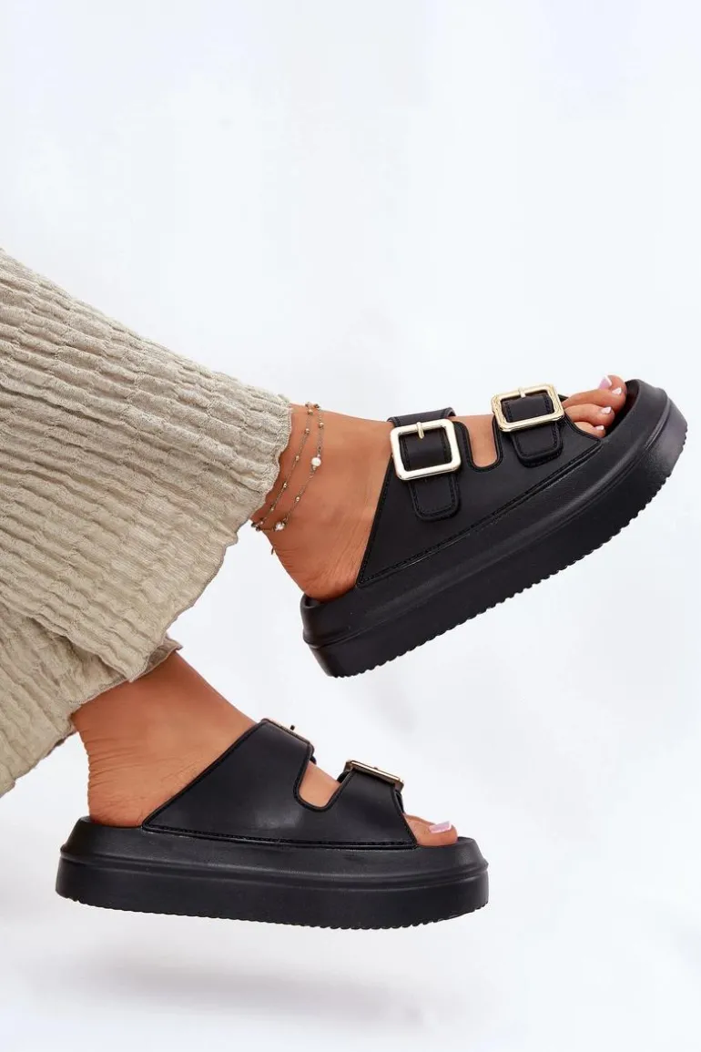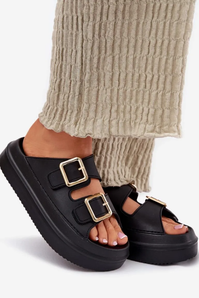Klapki Damskie Na Platformie Ze Złotymi Klamrami Czarne Zorila
