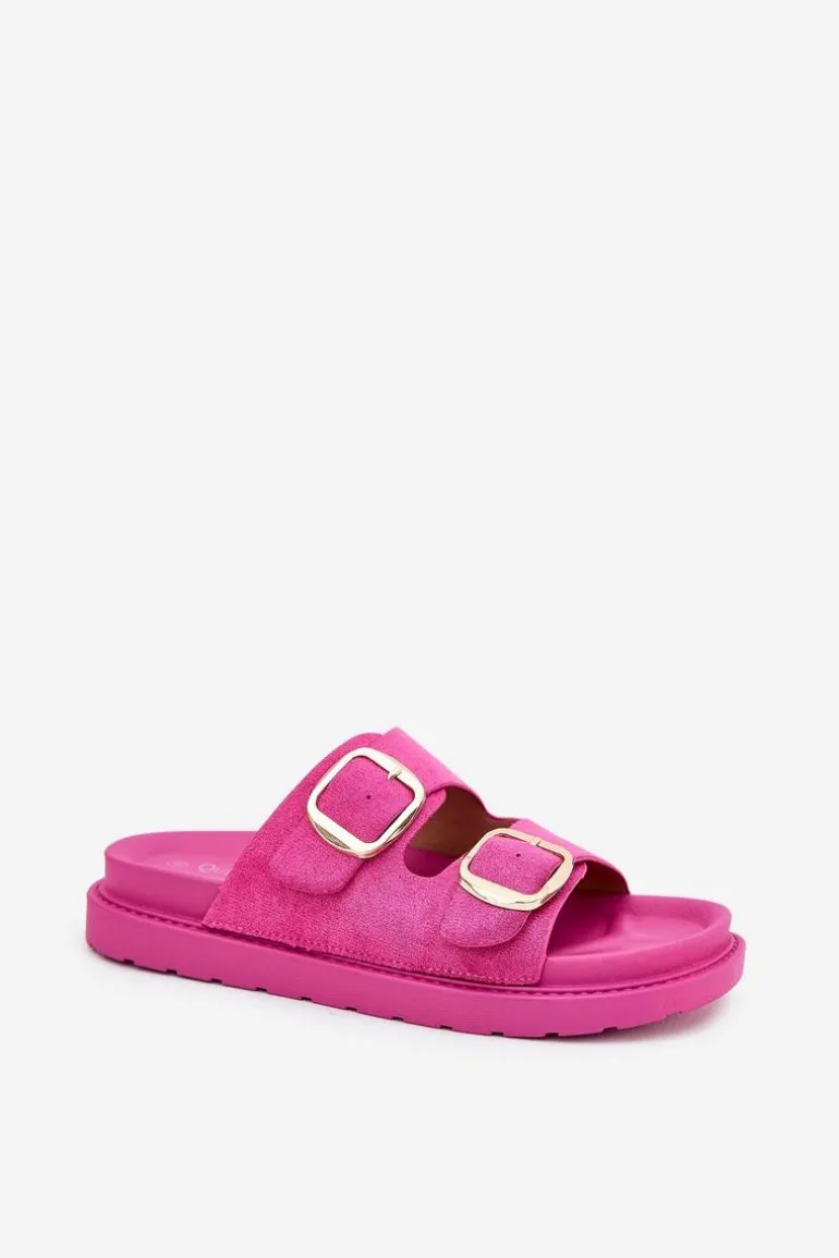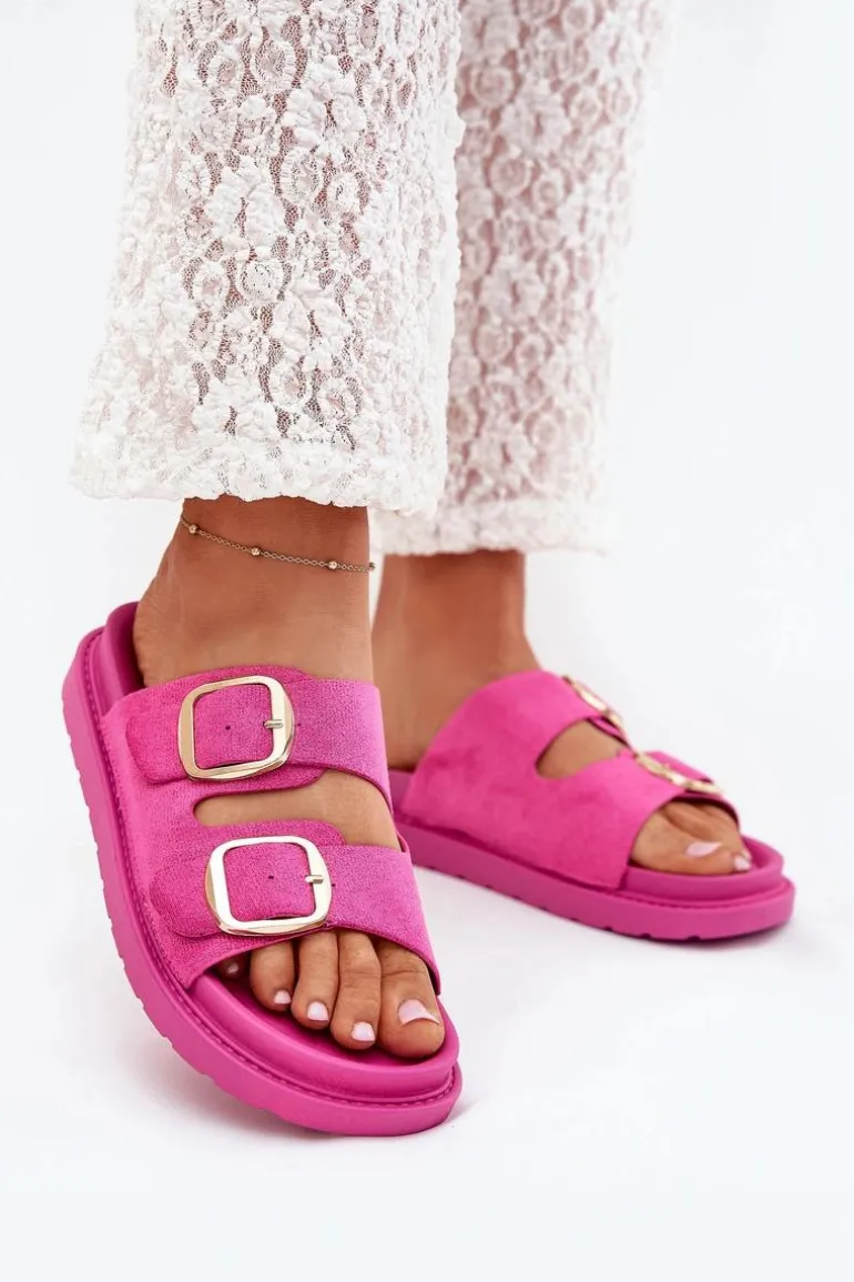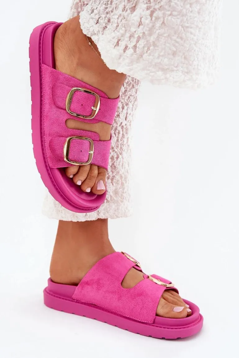 Klapki damskie wykonane z eko zamszu. Osadzone na platformie. Dwa regulowane paski ze złotymi klamrami zapewniają idealne dopasowanie, a profilowana wkładka gwarantuje komfort przez cały dzień. Idealne na codzienne wyjścia. Przy wyborze rozmiaru rosimy sugerować się tabelą rozmiarów.