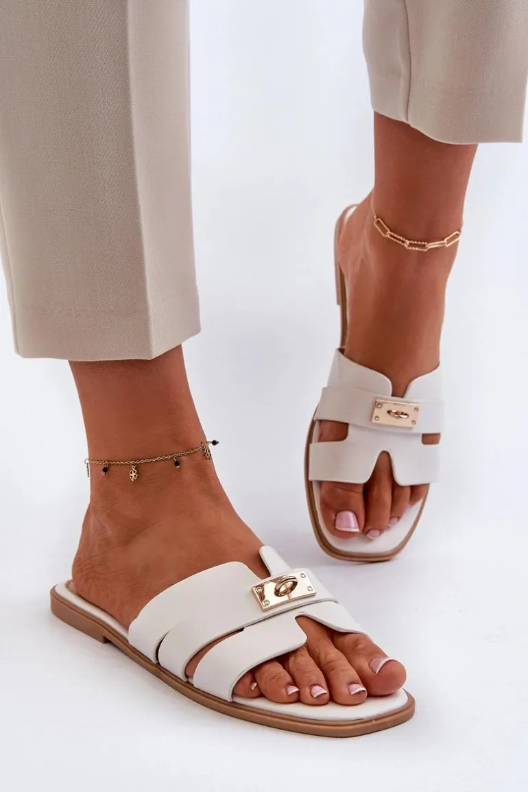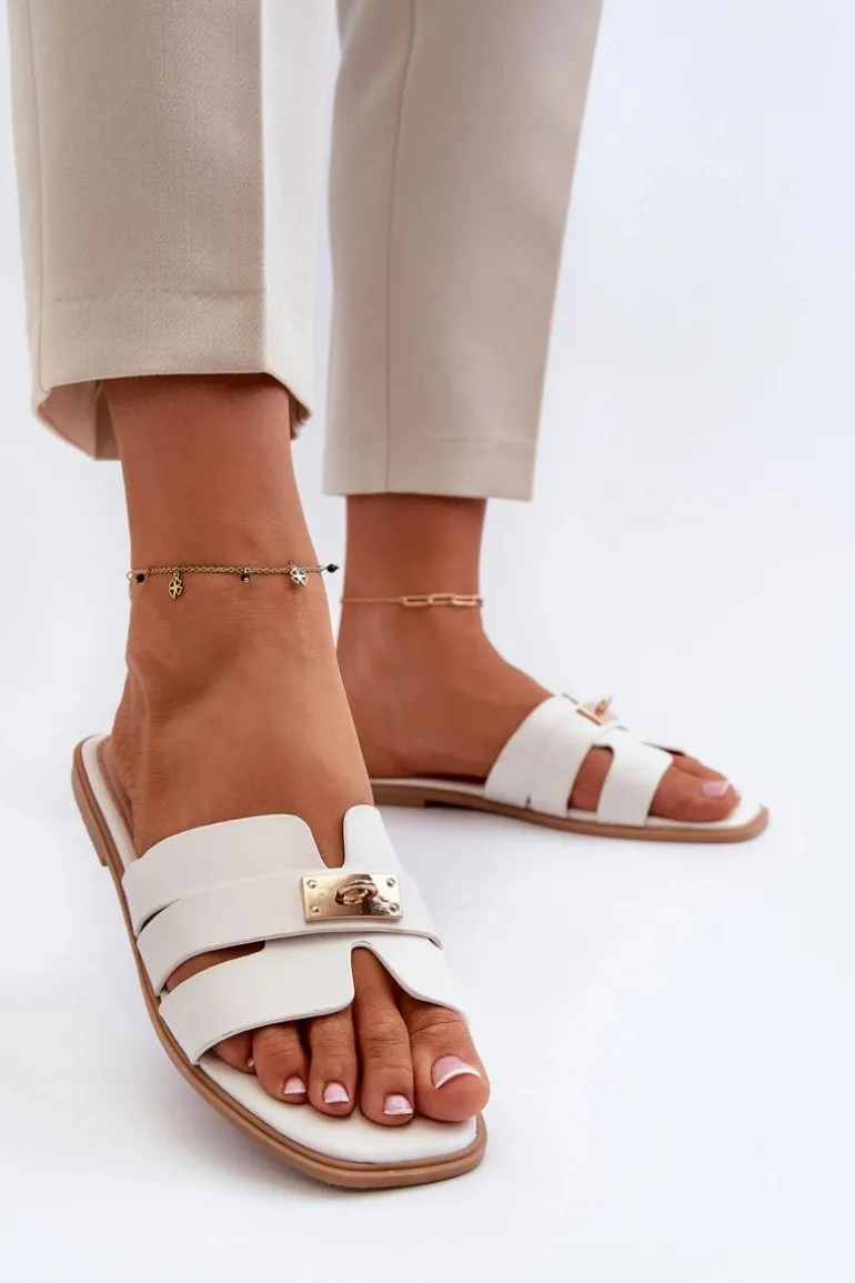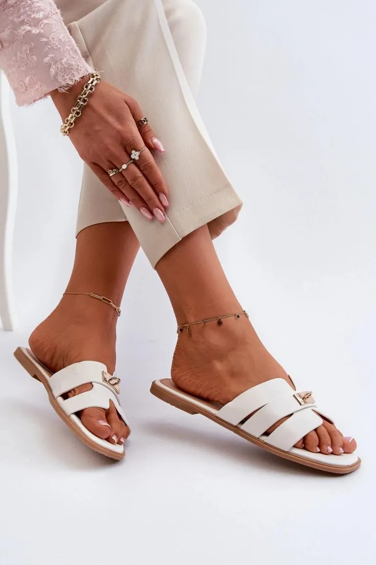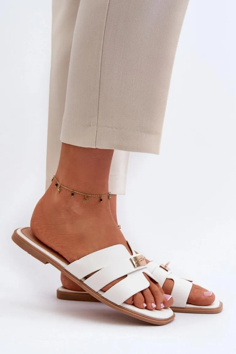 Klapki Damskie Płaskie Z Ozdobą Białe Kavinia
