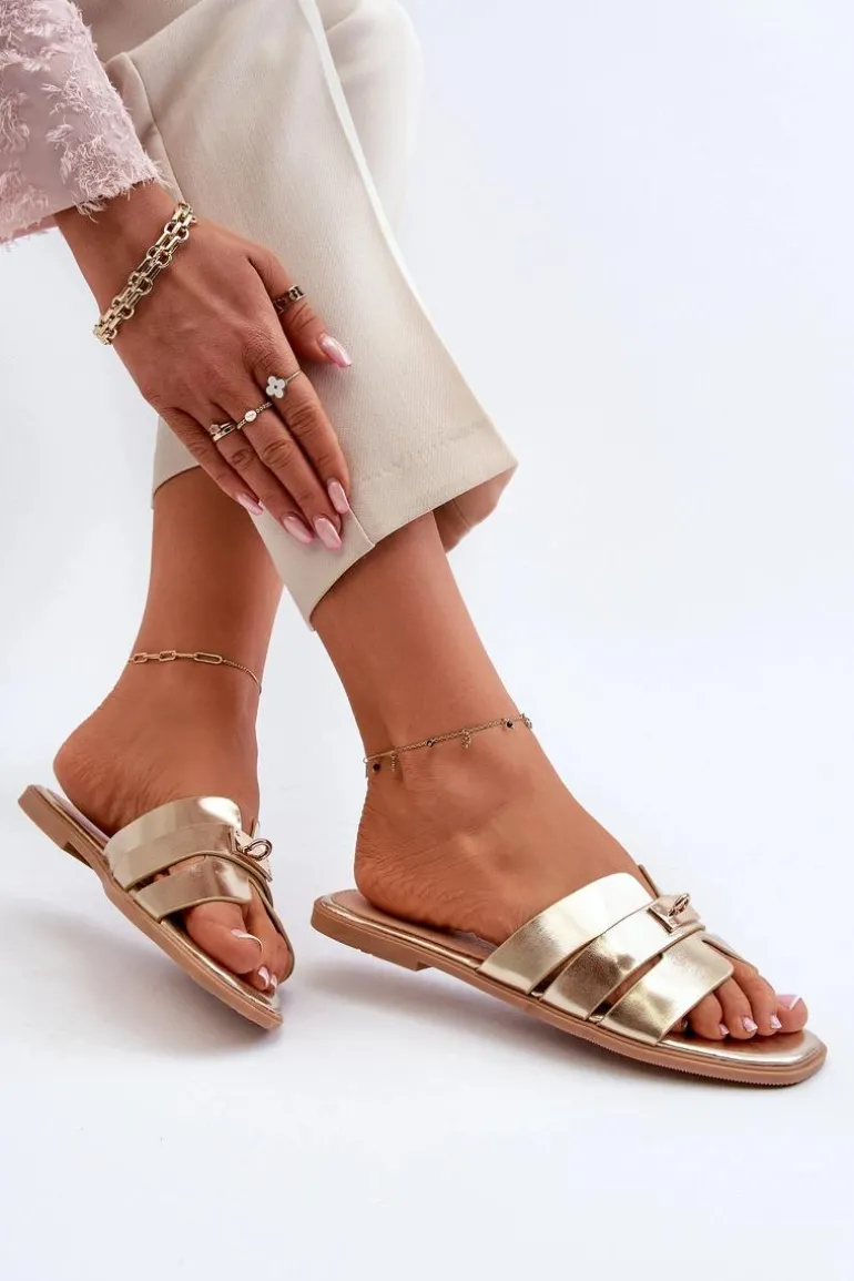 Stylowe i płaskie klapki damskie są idealnym wyborem na upalne dni. Wykonane z eko skóry. Z przodu delikatna złota ozdoba, która dodaje im elegancji i wyjątkowego charakteru. Te klasyczne klapki nie tylko świetnie prezentują się, ale także są komfortowe i praktyczne na co dzień, doskonale uzupełniając letnią garderobę. Przy wyborze rozmiaru prosimy sugerować się tabelą rozmiarów.