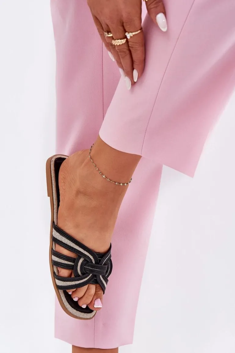 Klasyczne, płaskie klapki damskie wykonane z połączenia eko skóry i materiału tekstylnego, które łączą wygodę z subtelnym stylem. Przeplatające się paski z przodu nadają im lekkiego, nowoczesnego charakteru. Idealne do wielu letnich stylizacji, te klapki będą pasować zarówno do sukienek, jak i spodni czy szortów. Przy wyborze rozmiaru prosimy sugerować się tabelą rozmiarów.