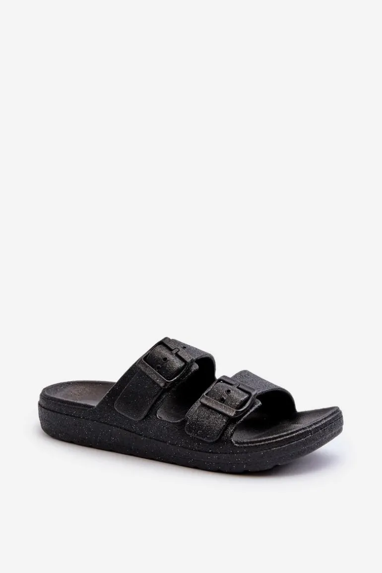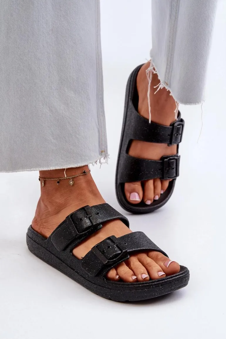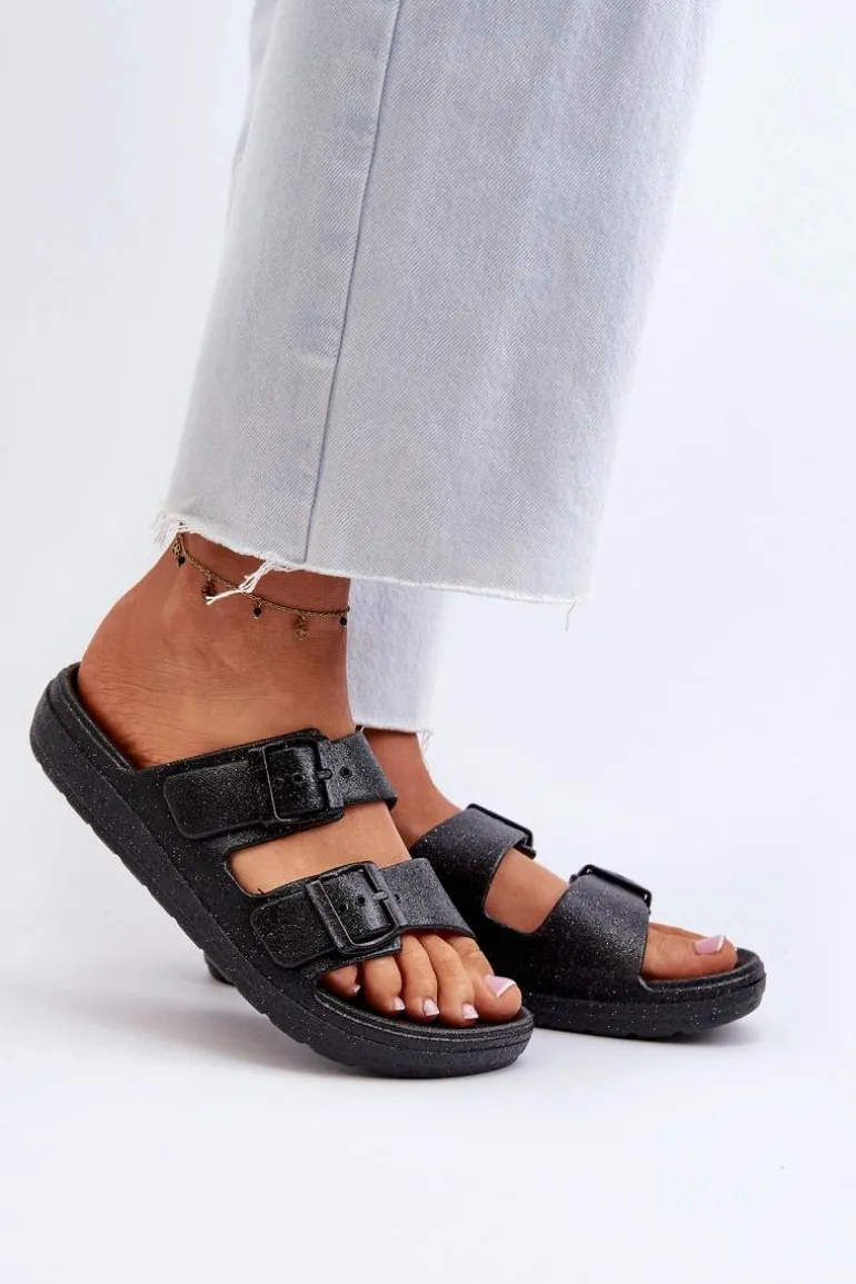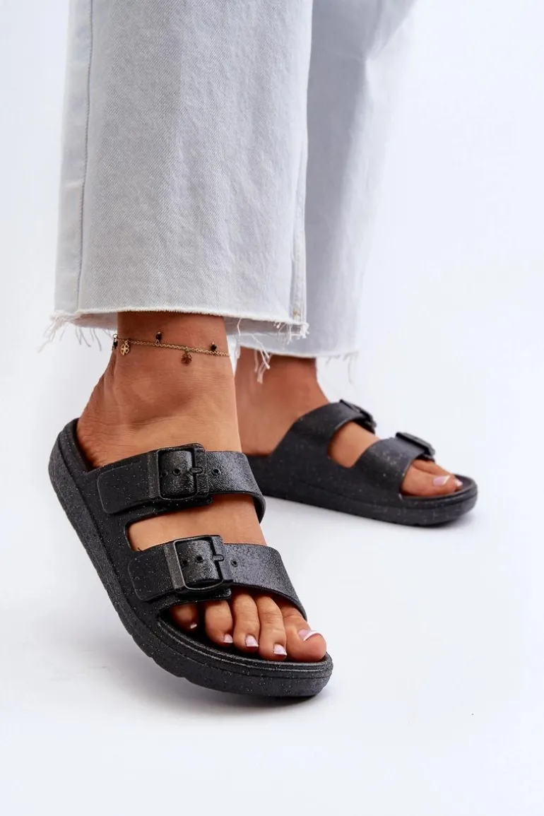 Klapki damskie, które z pewnością przyciągną spojrzenia dzięki efektownemu wykończeniu brokatem. Z przodu klamry, nie tylko zapewniają stylowy wygląd, ale także umożliwiają łatwe dopasowanie do stopy. Idealne na letnie, wieczorne wyjścia czy inne okazje, gdzie chcesz dodać trochę blasku i elegancji do swojej stylizacji. Przy wyborze rozmiaru prosimy sugerować się tabelą rozmiarów.