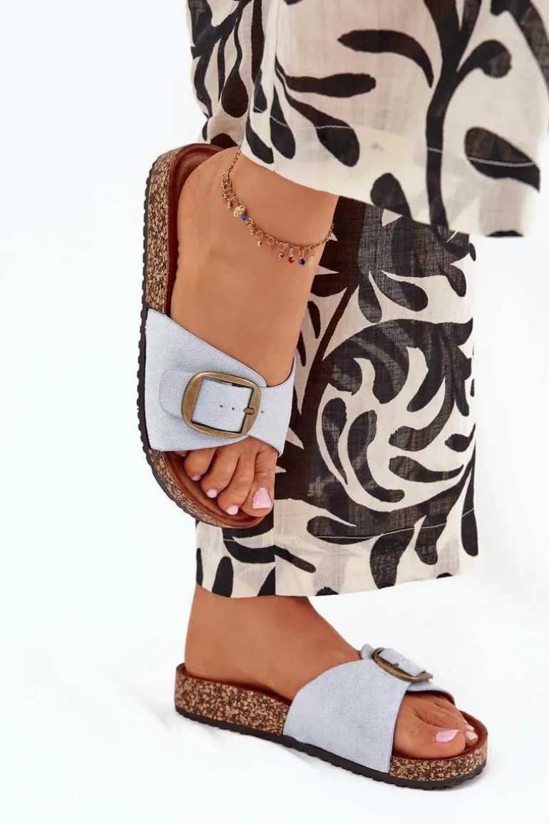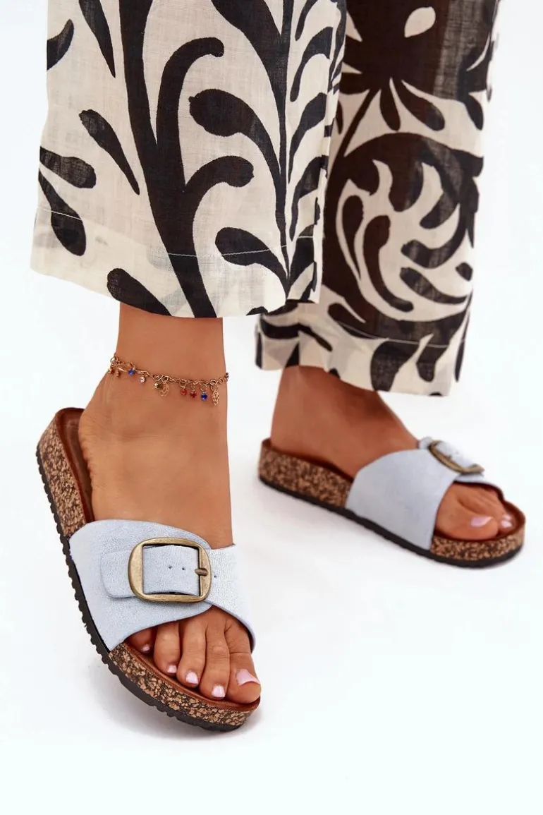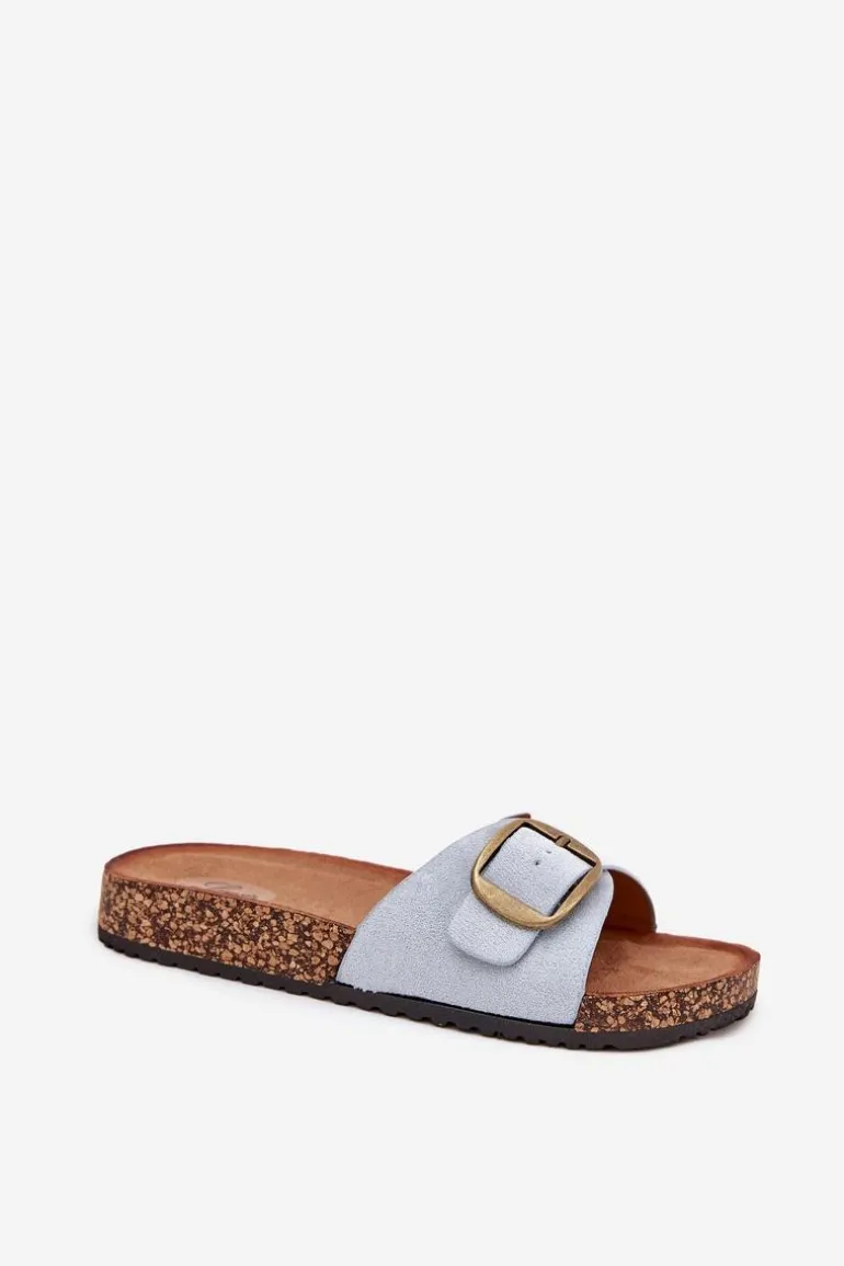 Klapki damskie wykonane z eko zamszu. Osadzone na korkowej platformie. Wyróżniają się klamrą z regulowanym paskiem, który umożliwia idealne dopasowanie do stopy. Profilowana wkładka zapewnia komfort przez cały dzień, a ich prosty wygląd sprawia, że są doskonałe do codziennych stylizacji. Idealne na letnie dni, pasują do sukienek, spódnic czy spodni, wprowadzając lekkość i styl do każdej kreacji. Przy wyborze rozmiaru rosimy sugerować się tabelą rozmiarów.