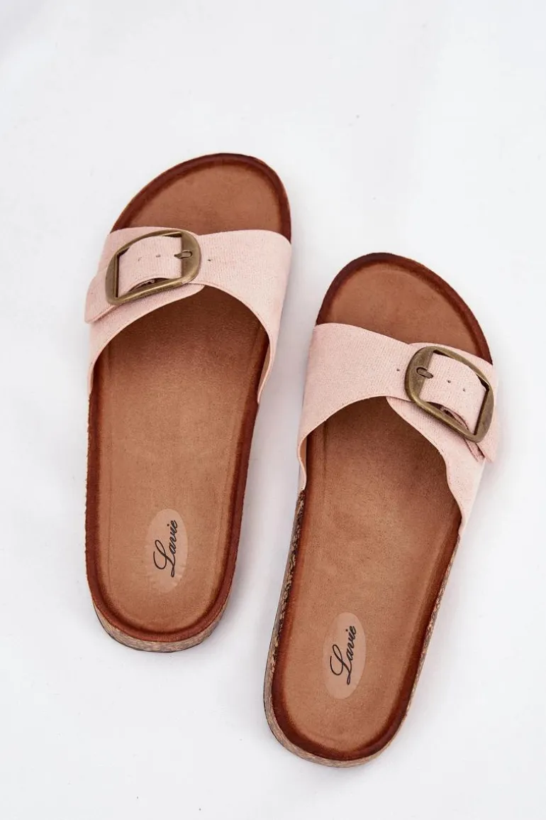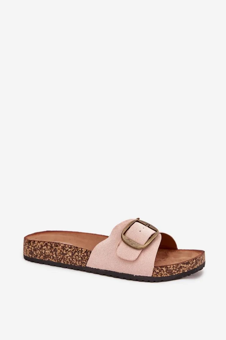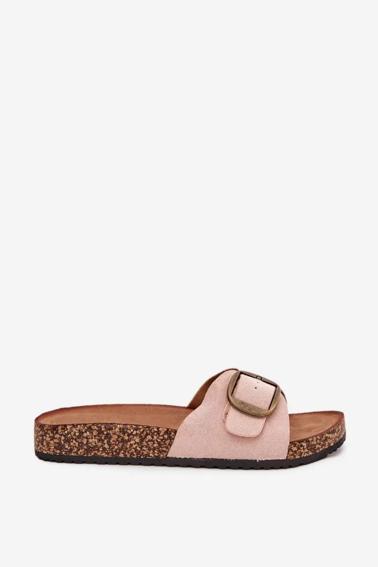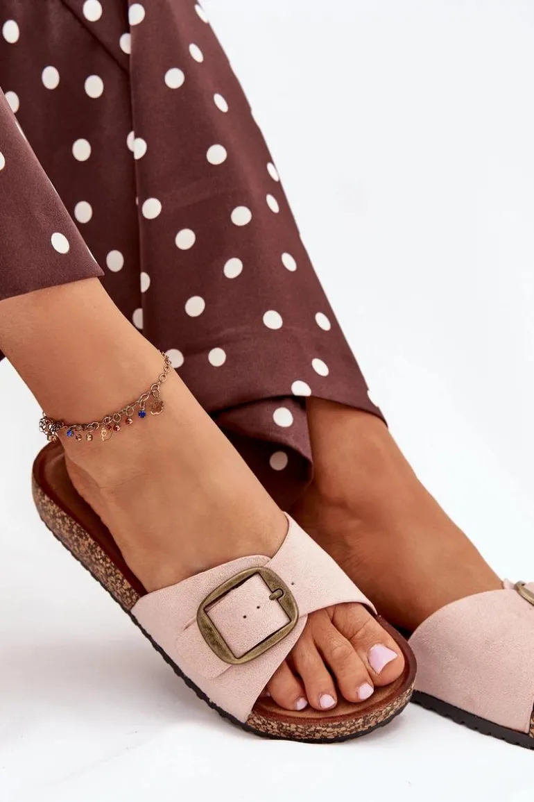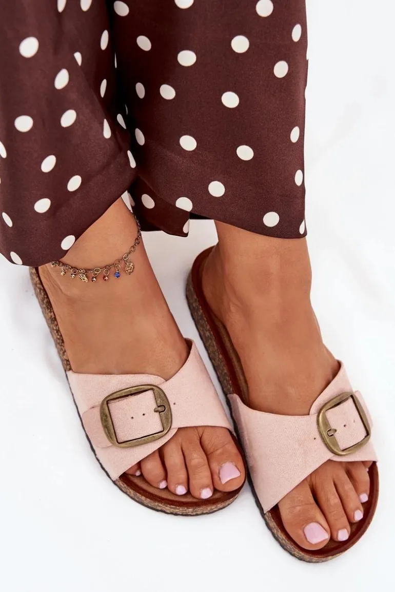 Klapki damskie wykonane z eko zamszu. Osadzone na korkowej platformie. Wyróżniają się klamrą z regulowanym paskiem, który umożliwia idealne dopasowanie do stopy. Profilowana wkładka zapewnia komfort przez cały dzień, a ich prosty wygląd sprawia, że są doskonałe do codziennych stylizacji. Idealne na letnie dni, pasują do sukienek, spódnic czy spodni, wprowadzając lekkość i styl do każdej kreacji. Przy wyborze rozmiaru rosimy sugerować się tabelą rozmiarów.