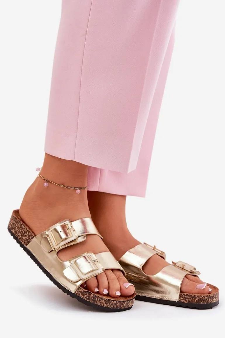 Klapki Damskie Z Klamrami Na Korkowej Podeszwie Złote Sercele