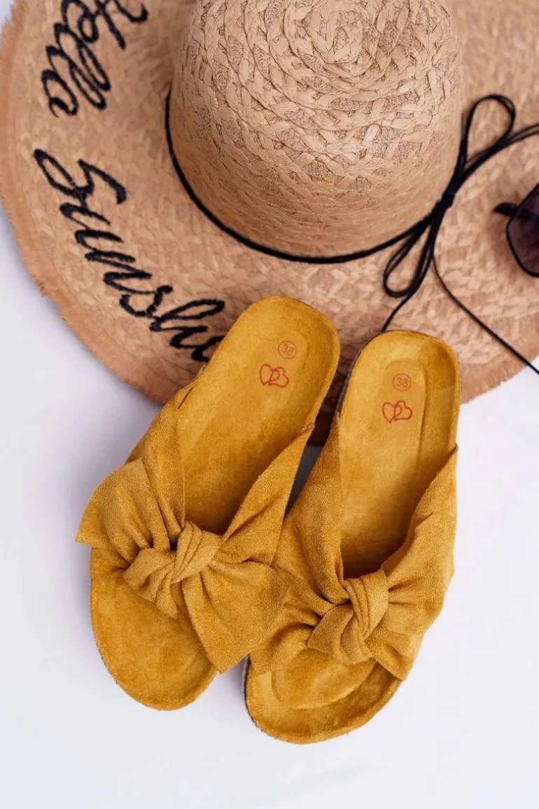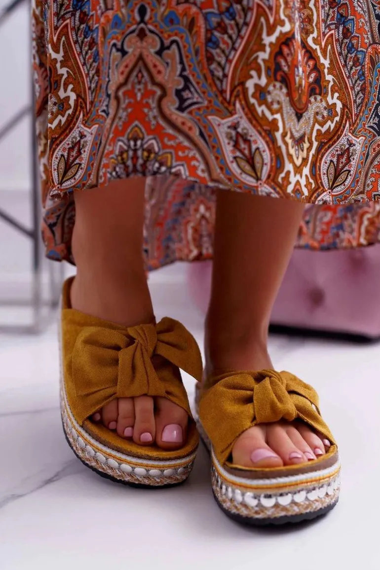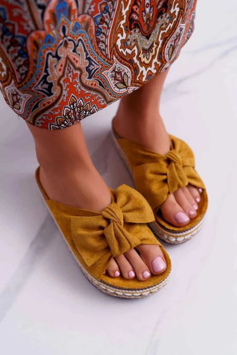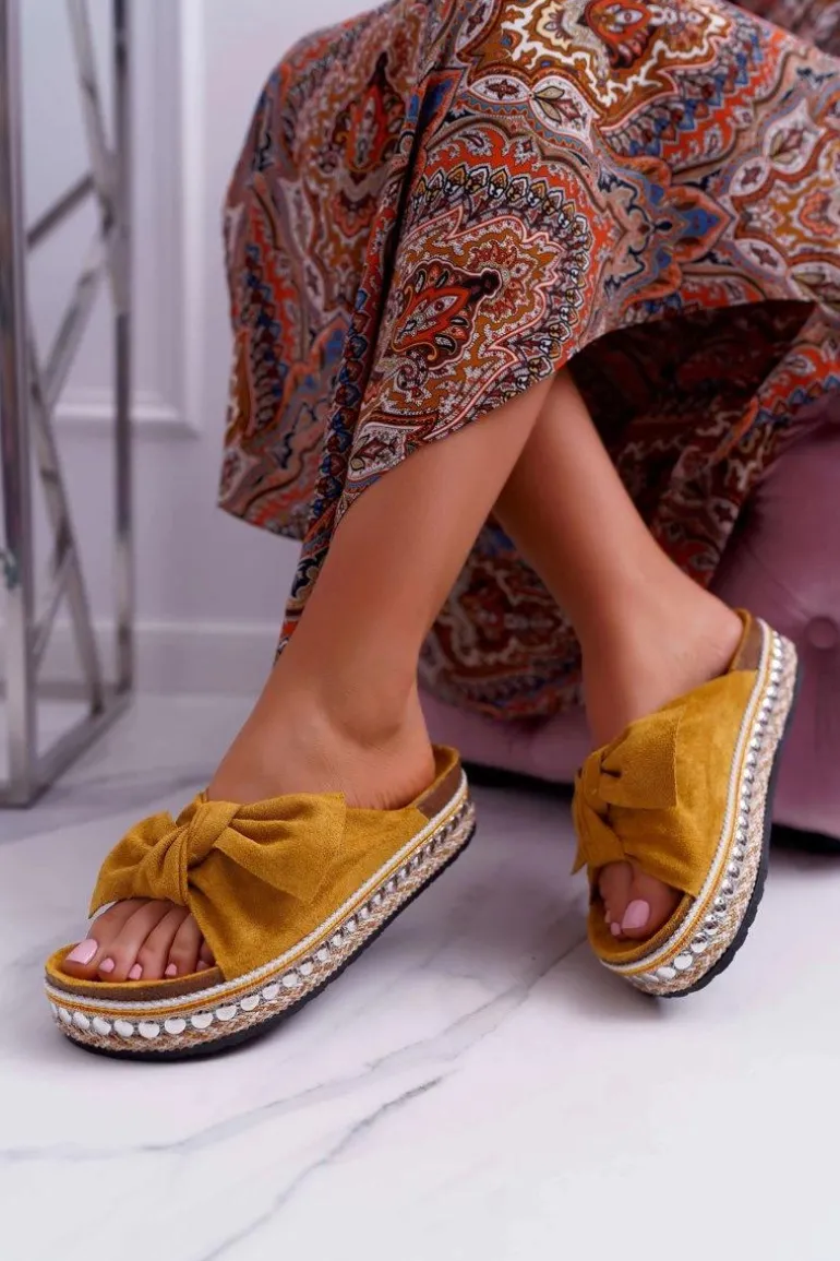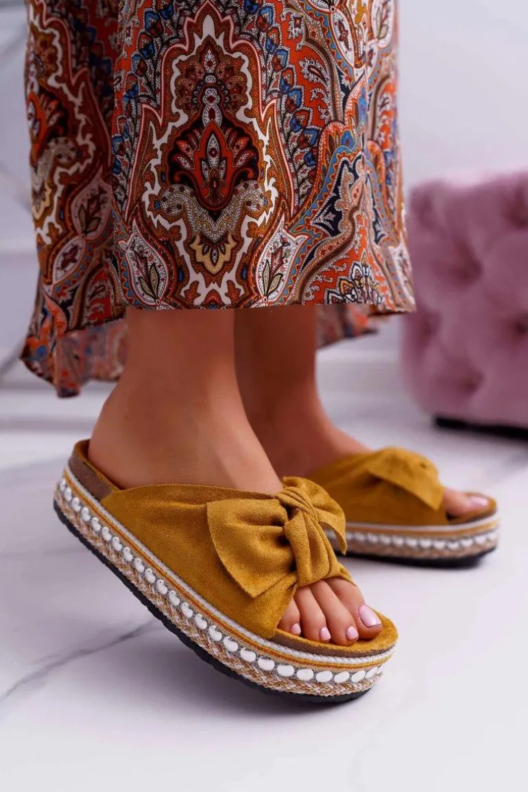 Klapki Damskie Z Kokardami Gruba Podeszwa Żółte Milady