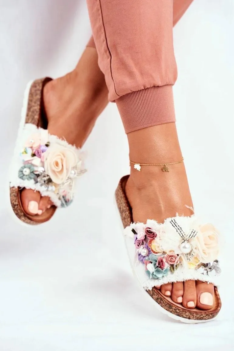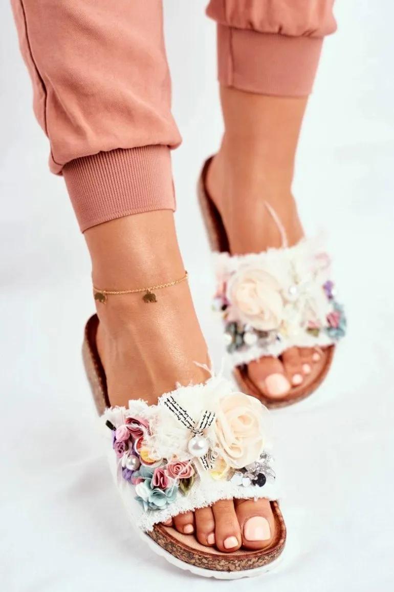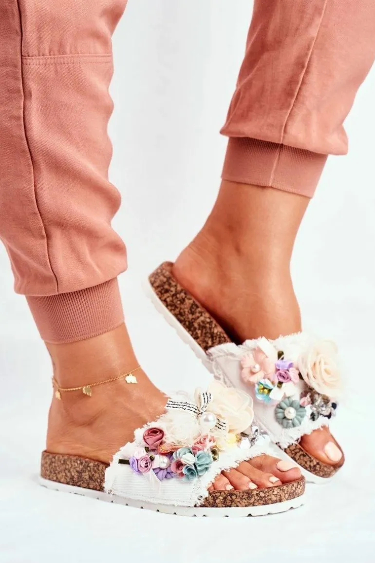 Klapki Damskie Z Kwiatami Białe Enrissa