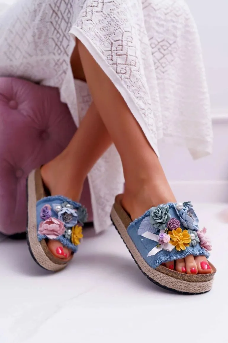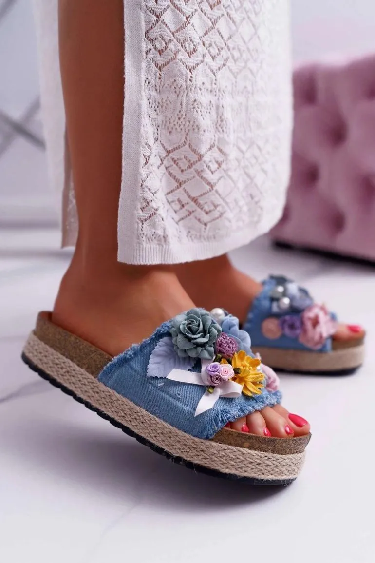 Klapki Damskie Z Kwiatami Gruba Podeszwa Niebieskie Amadeo
