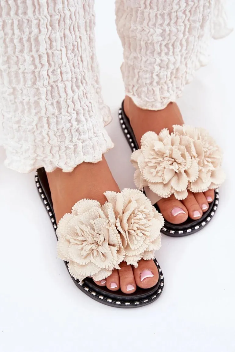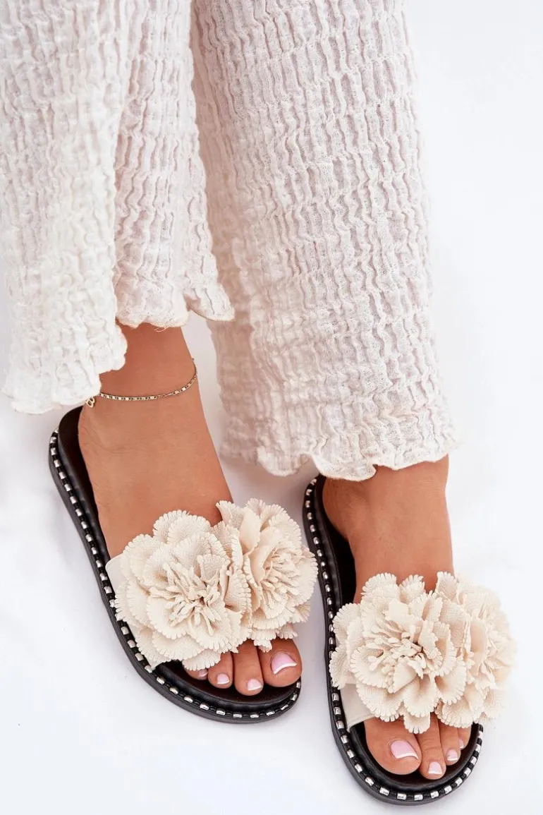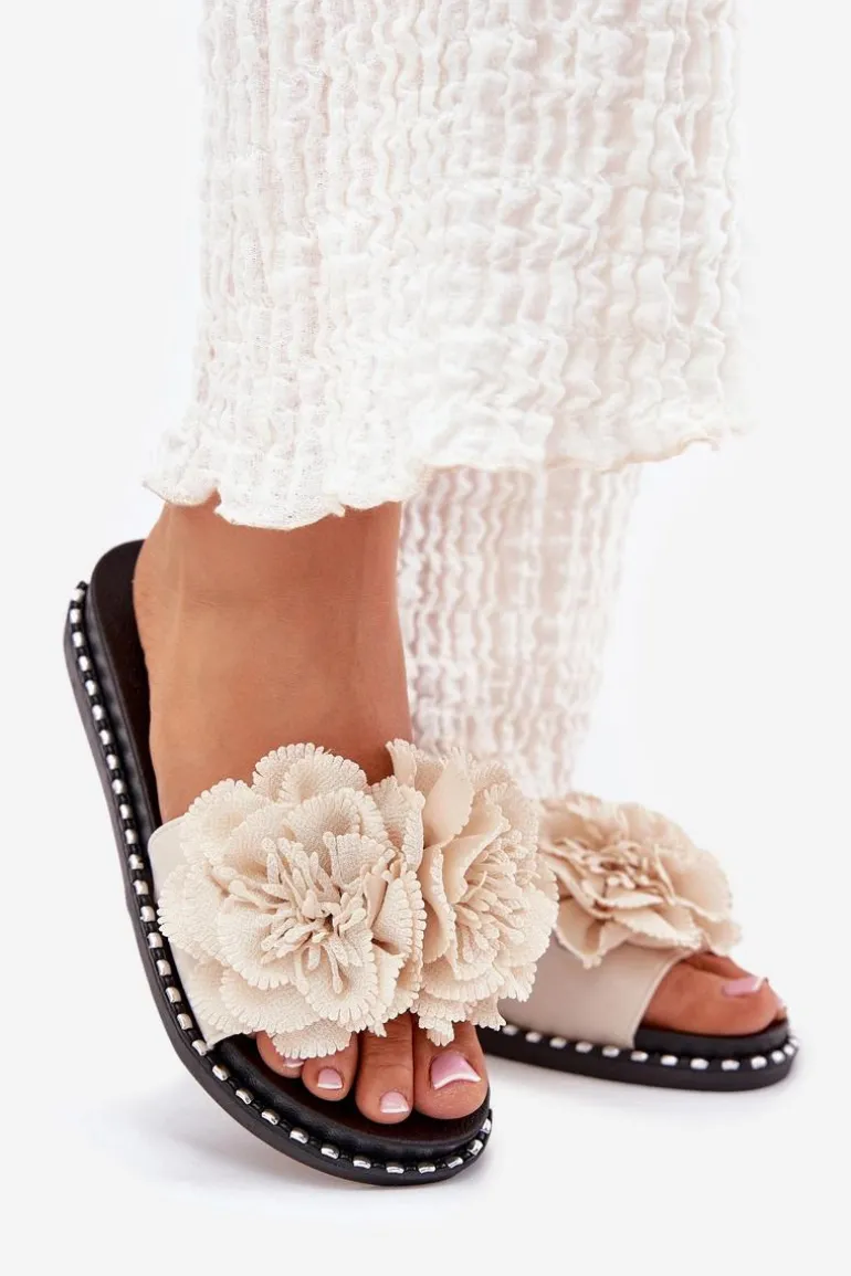 Klapki Damskie Z Materiałowymi Kwiatami Beżowe Elachase