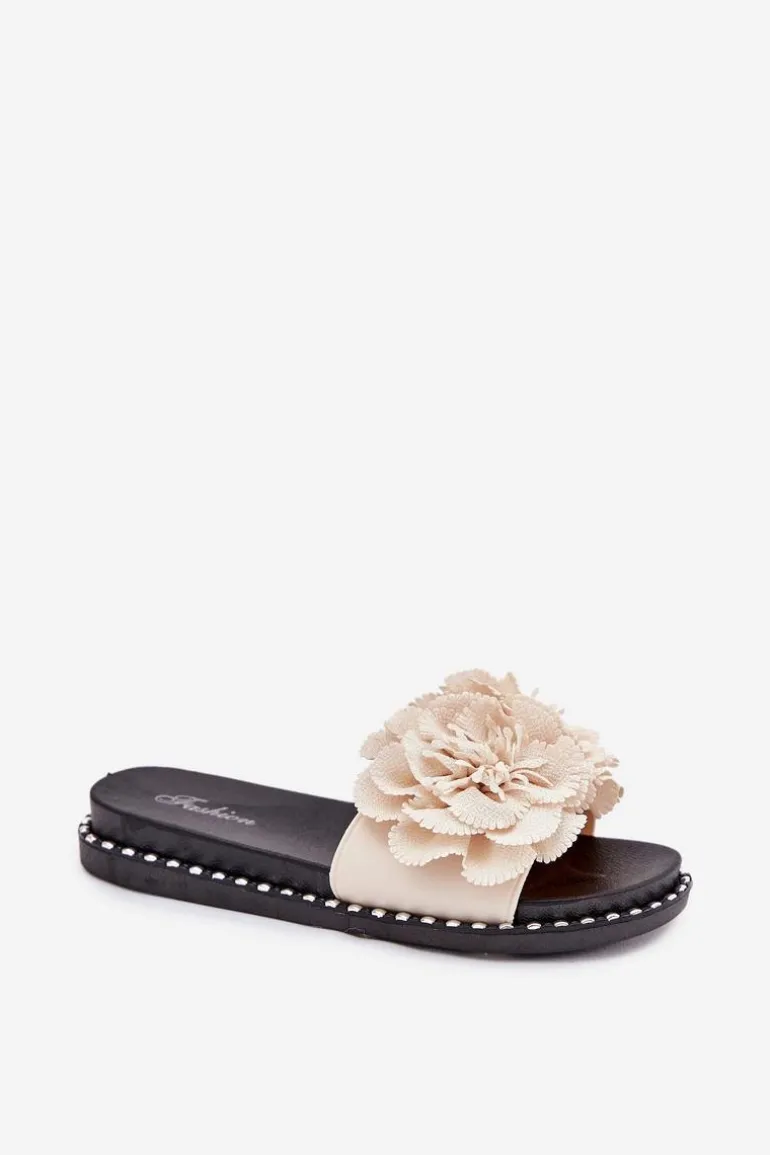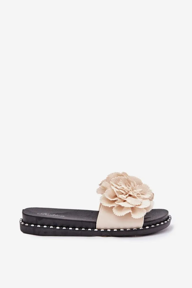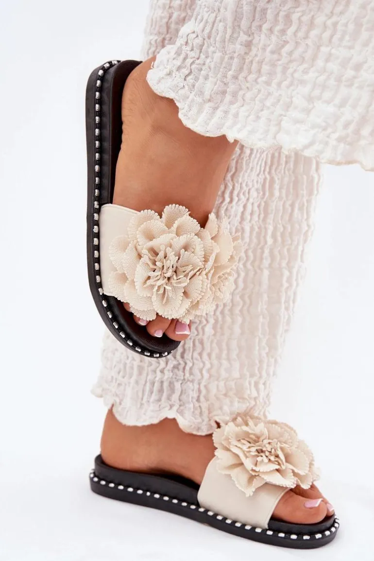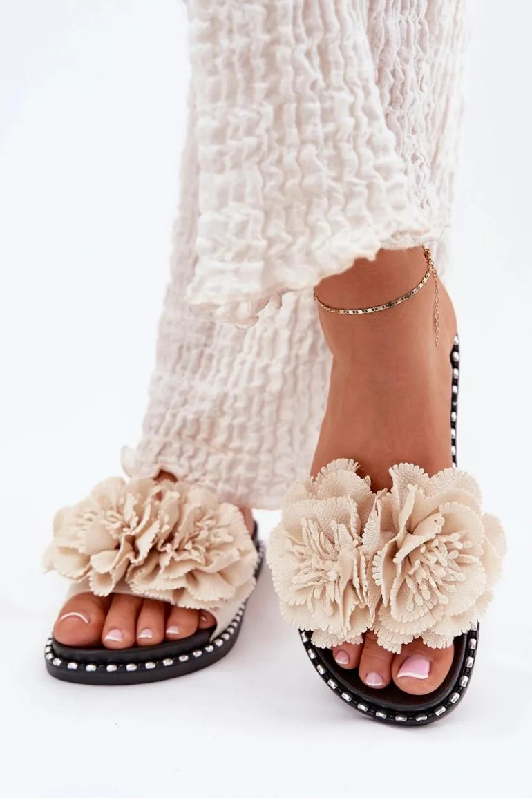 Klapki Damskie Z Materiałowymi Kwiatami Beżowe Elachase