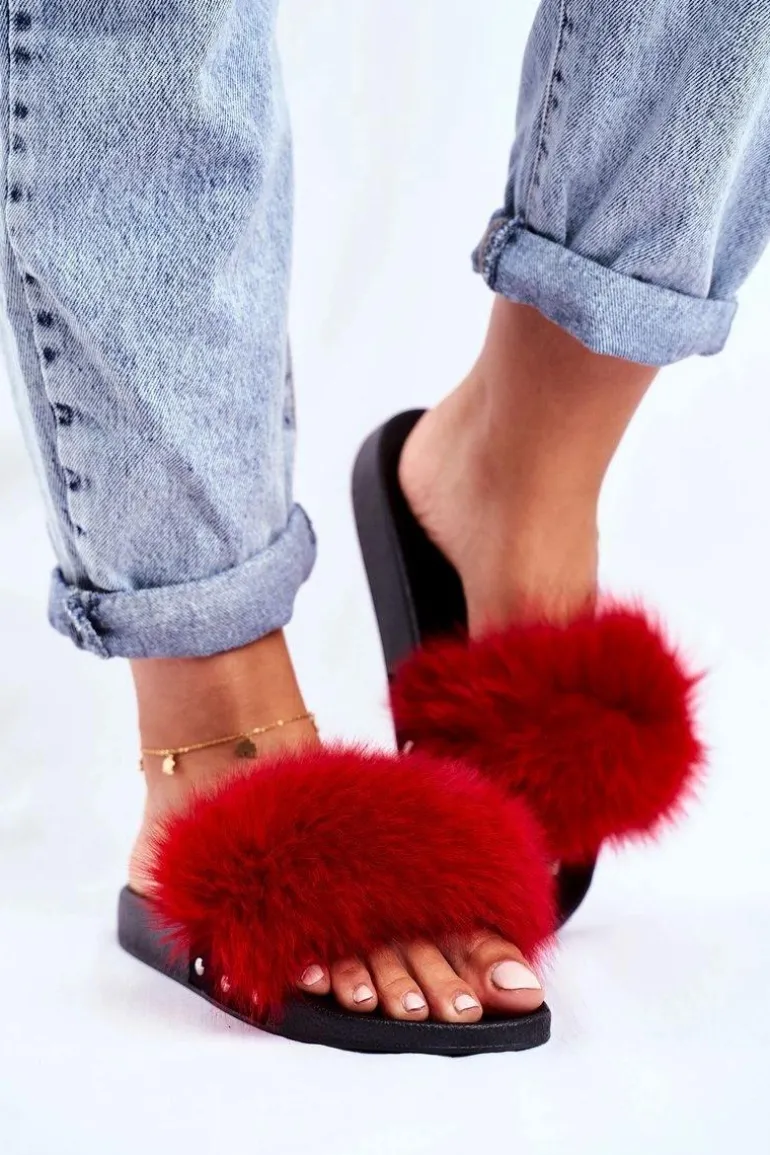 Klapki Damskie z Naturalnym Futerkiem Czerwone Bushido