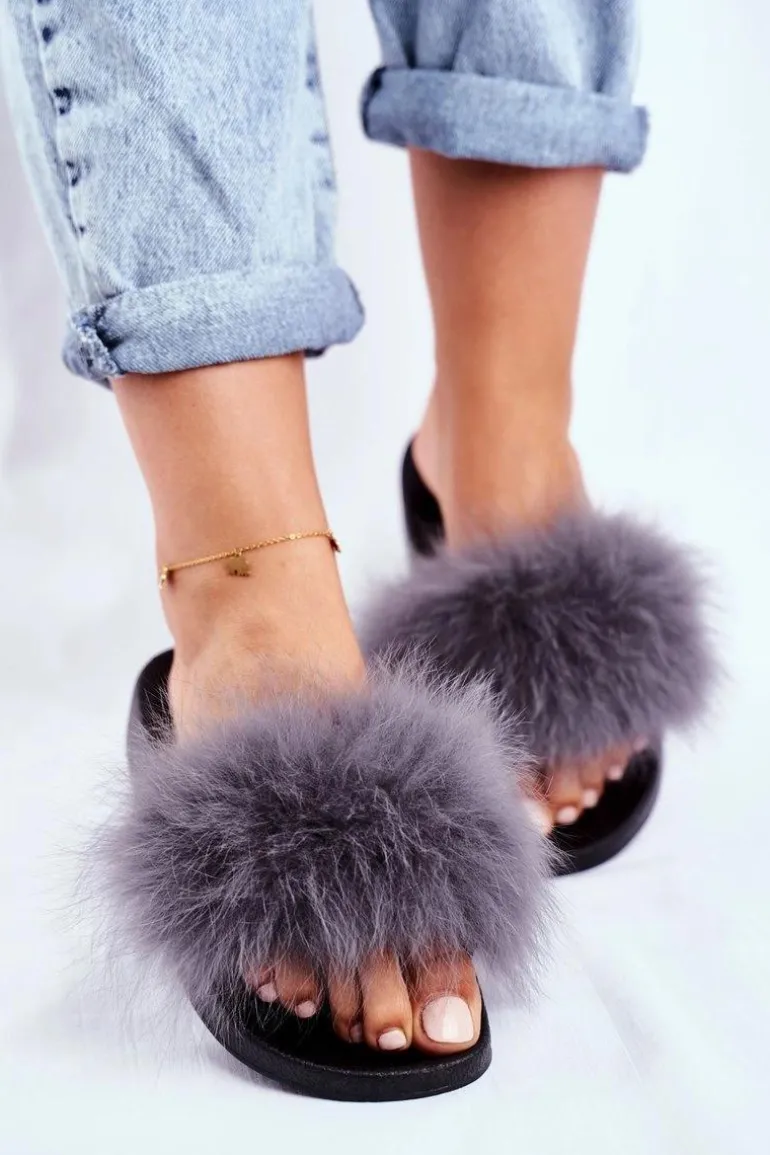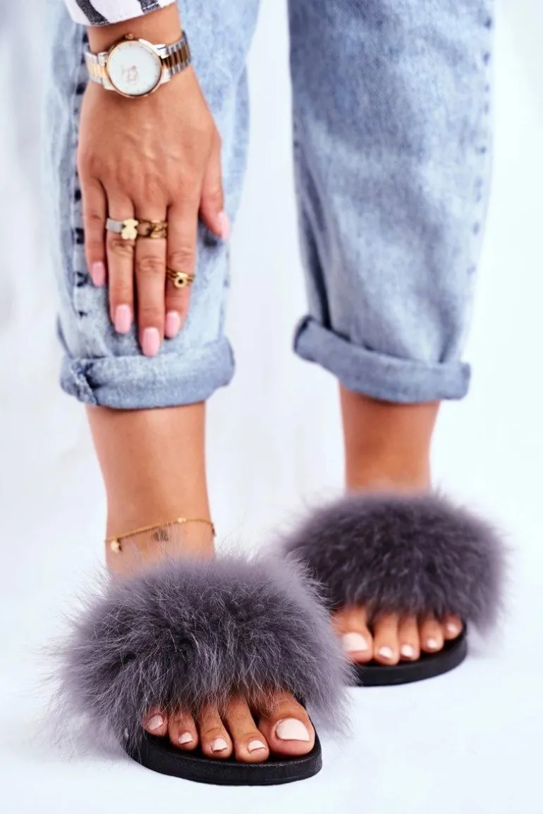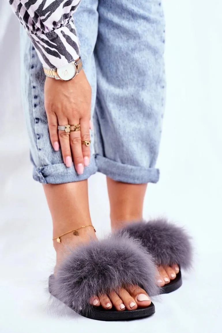 Klapki Damskie z Naturalnym Futerkiem Szare Bushido
