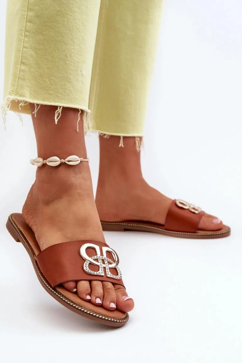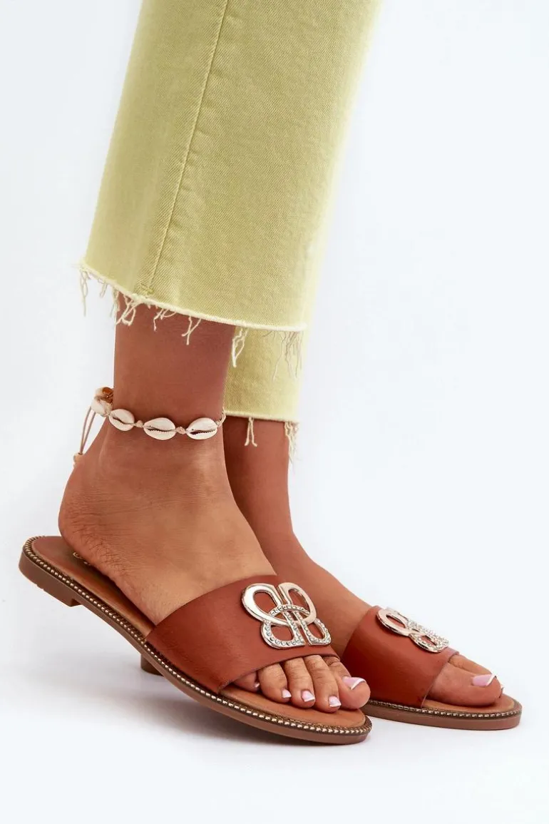 Klapki Damskie Z Ozdobą Eko Skórzane Na Płaskim Obcasie Brązowe Sadria