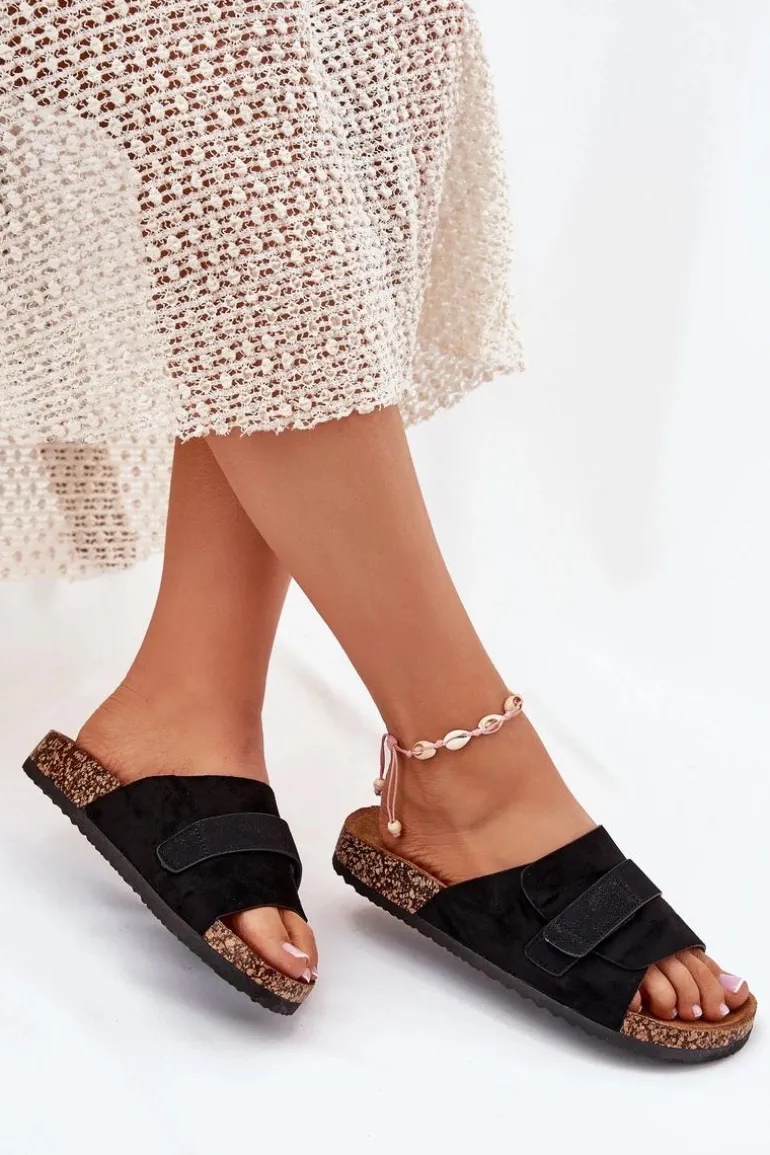 Klapki damskie wykonane z eko zamszu, osadzone na korkowej platformie, to doskonała propozycja na ciepłe dni. Dzięki profilowanej wkładce zapewniają wygodę przez cały dzień. Pasek zapinany na rzep umożliwia łatwe dopasowanie do stopy, a korkowa platforma dodaje lekkości i stylowego charakteru. Idealne do codziennych stylizacji. Przy wyborze rozmiaru prosimy sugerować się tabelą rozmiarów.